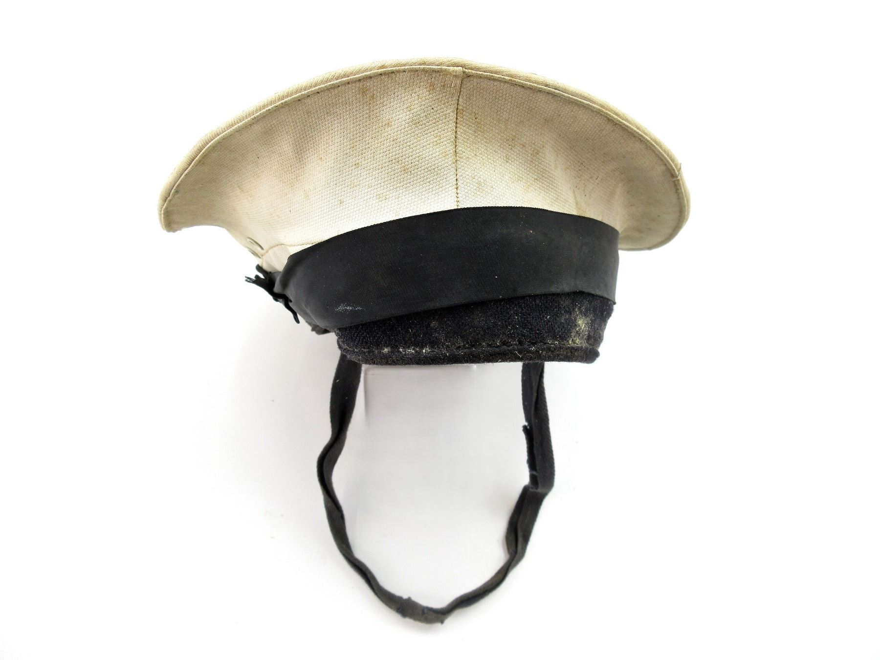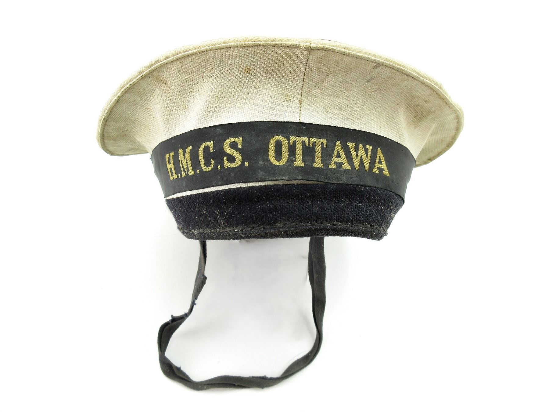 (1) WHITE CAP MARKED: "MADE IN ENGLAND" & VARIOUS OTHER HAND-WRITTEN MARKINGS, TALLY MARKED: "H.M.C.S. OTTAWA", SIZE UNKNOWN, SHOWS AGE / WEAR. SEE PHOTOS.