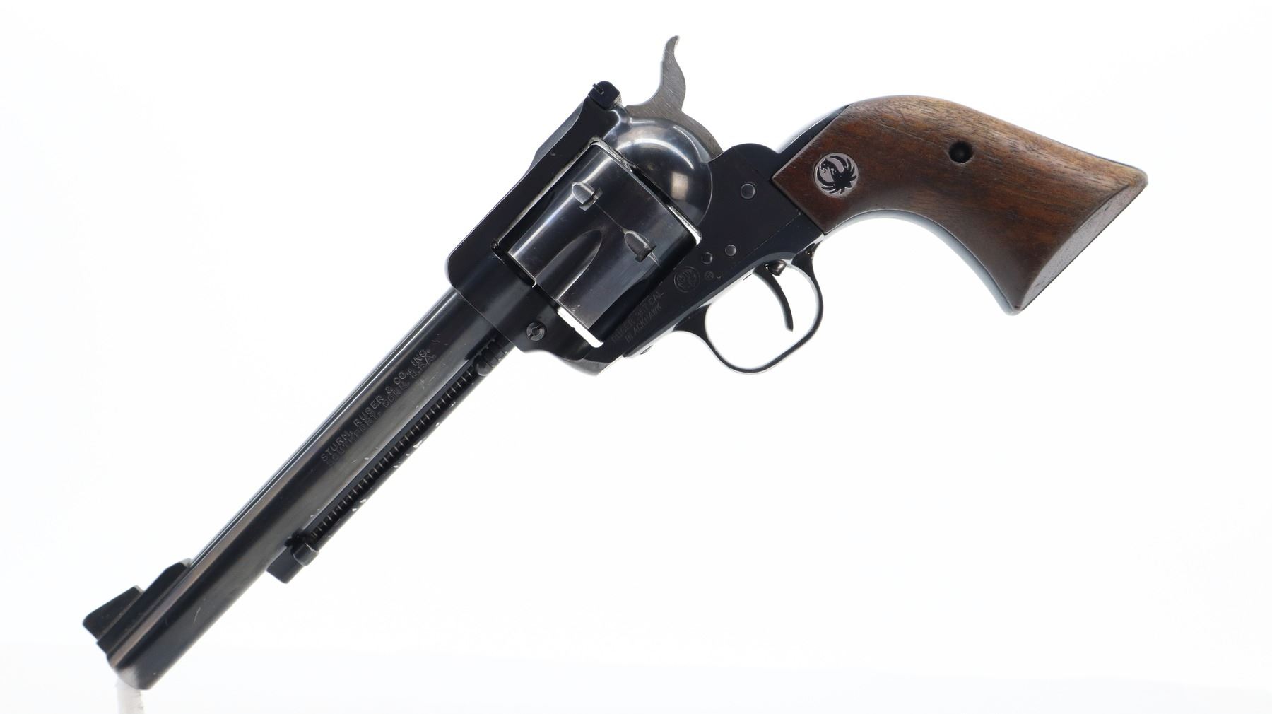 6/10, RUGER, MODEL: BLACKHAWK , CALIBER: 357 MAG, COMES WITH 9MM CYLINDER, BORE IS VERY GOOD. FUNCTIONS MECHANICALLY AS DESIGNED. BLADE FRONT SIGHT, ADJUSTABLE REAR SIGHT, PLAIN WOOD GRIPS WITH RUGER LOGO, SMALL CRACK AND CHIP ON RIGHT GRIP PANEL, SHOWS SOME HANDLING MARKS, ACTION: REVOLVER, BARREL LENGTH: 165MM, CONDITION: 6/10, SERIAL # 3018099, CLASS: CANADIAN RESTRICTED CLASS