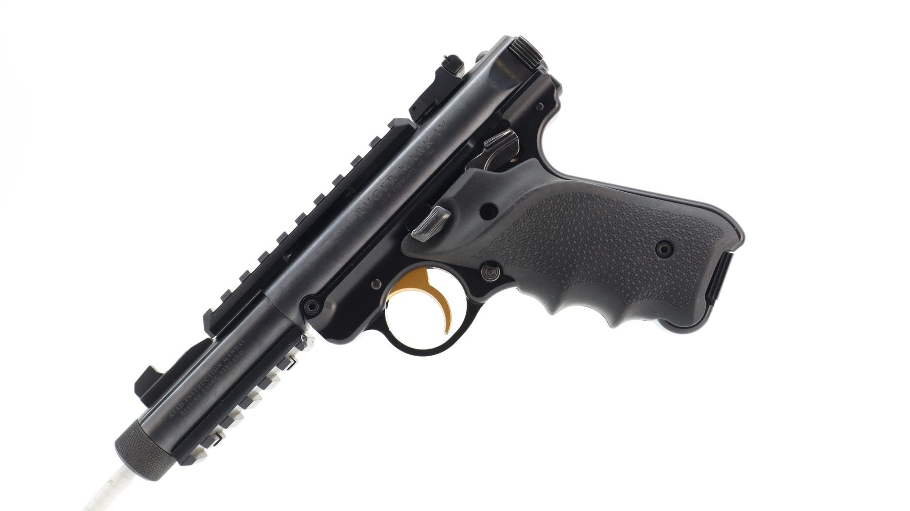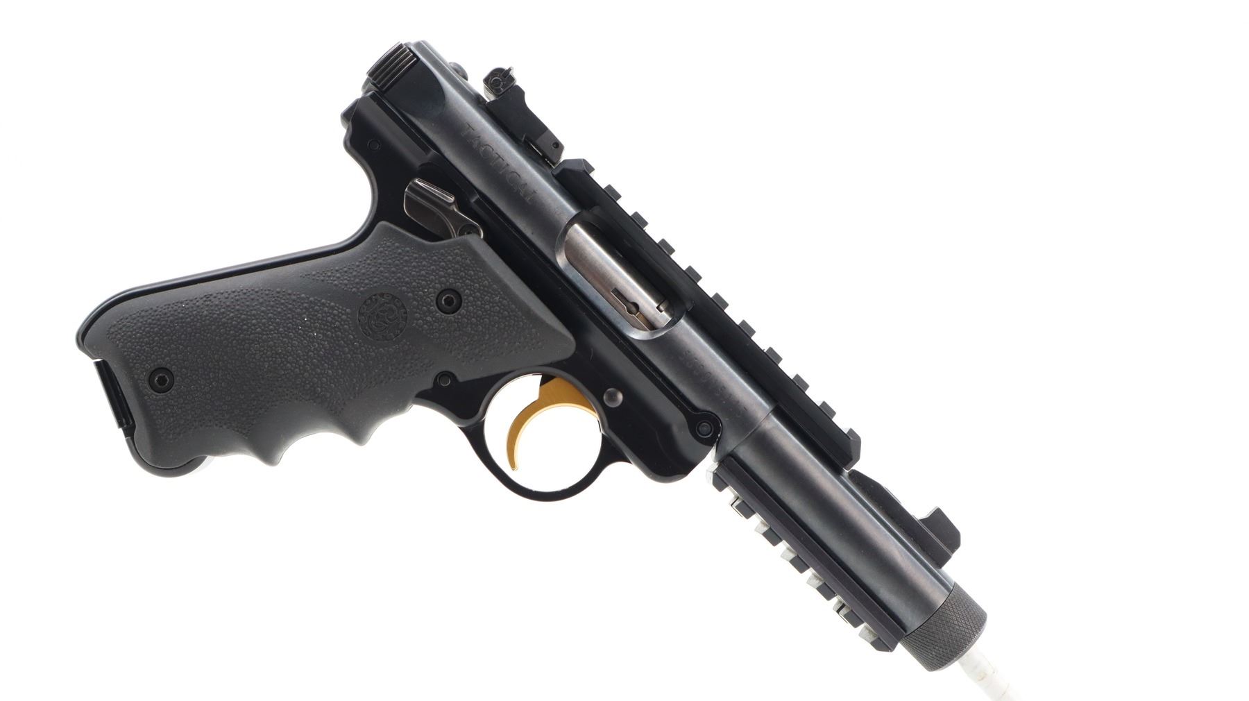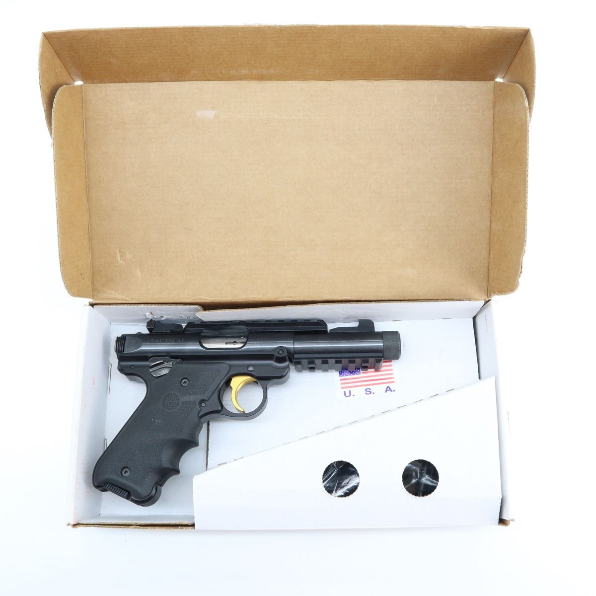 9+/10, RUGER, MODEL: MK IV TACTICAL, CALIBER: 22 LR, COMES WITH ORIGINAL BOX, 3 MAGAZINES, ORIGINAL GRIPS AND TRIGGER, BORE IS EXCELLENT. BLADE FRONT SIGHT AND ADJUSTABLE REAR SIGHT. ACCESSORY RAIL ON TOP AND UNDERSIDE OF BARREL WITH THREADED CAPPED MUZZLE . HOGUE GRIPS WITH THUMB REST. SHOWS VERY LITTLE HANDLING MARKS. , ACTION: SEMI AUTOMATIC , BARREL LENGTH: 112MM, CONDITION: 9+/10, SERIAL # 500015113, CLASS: CANADIAN RESTRICTED CLASS