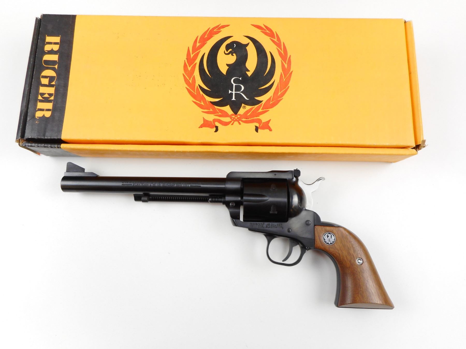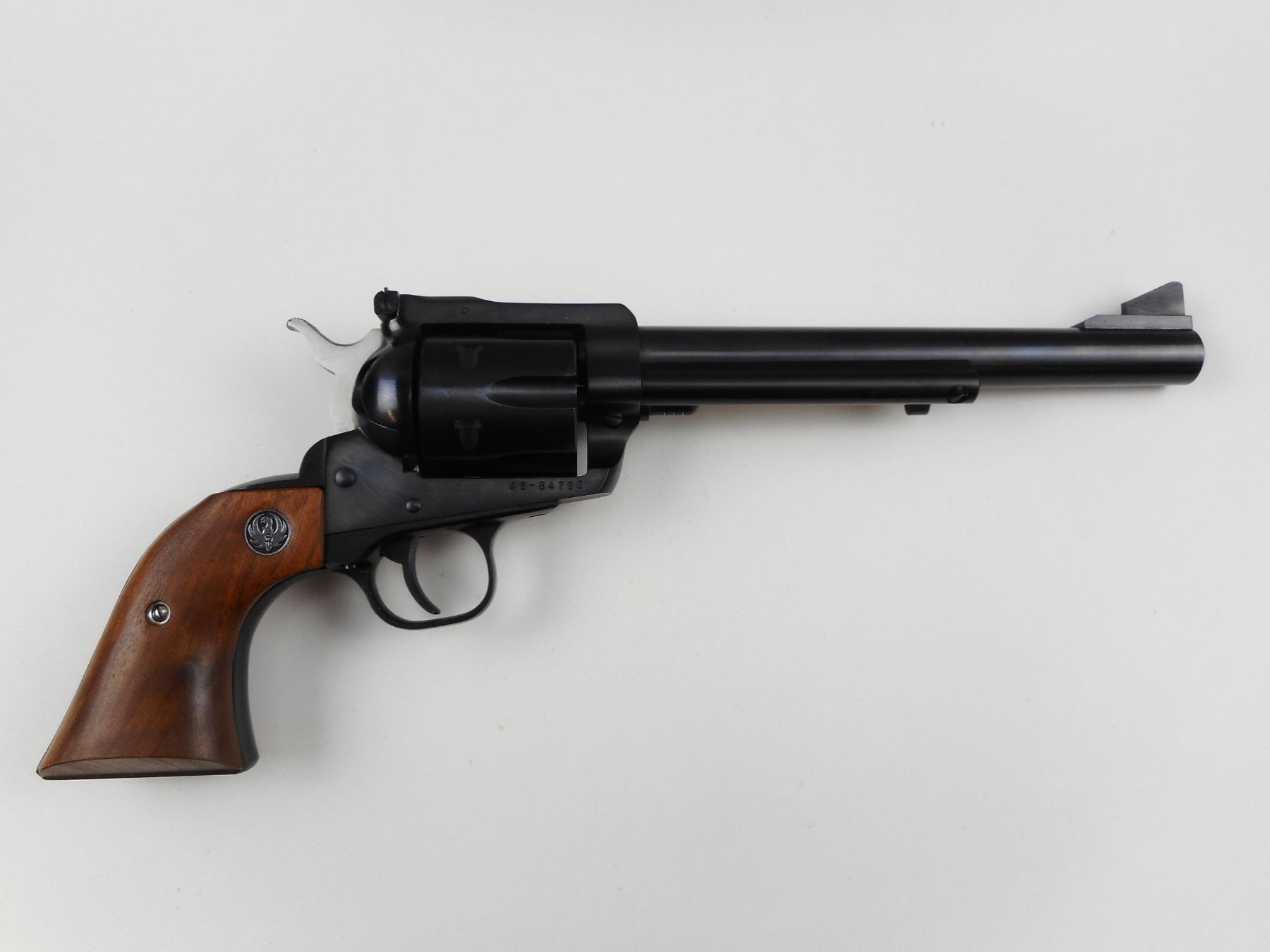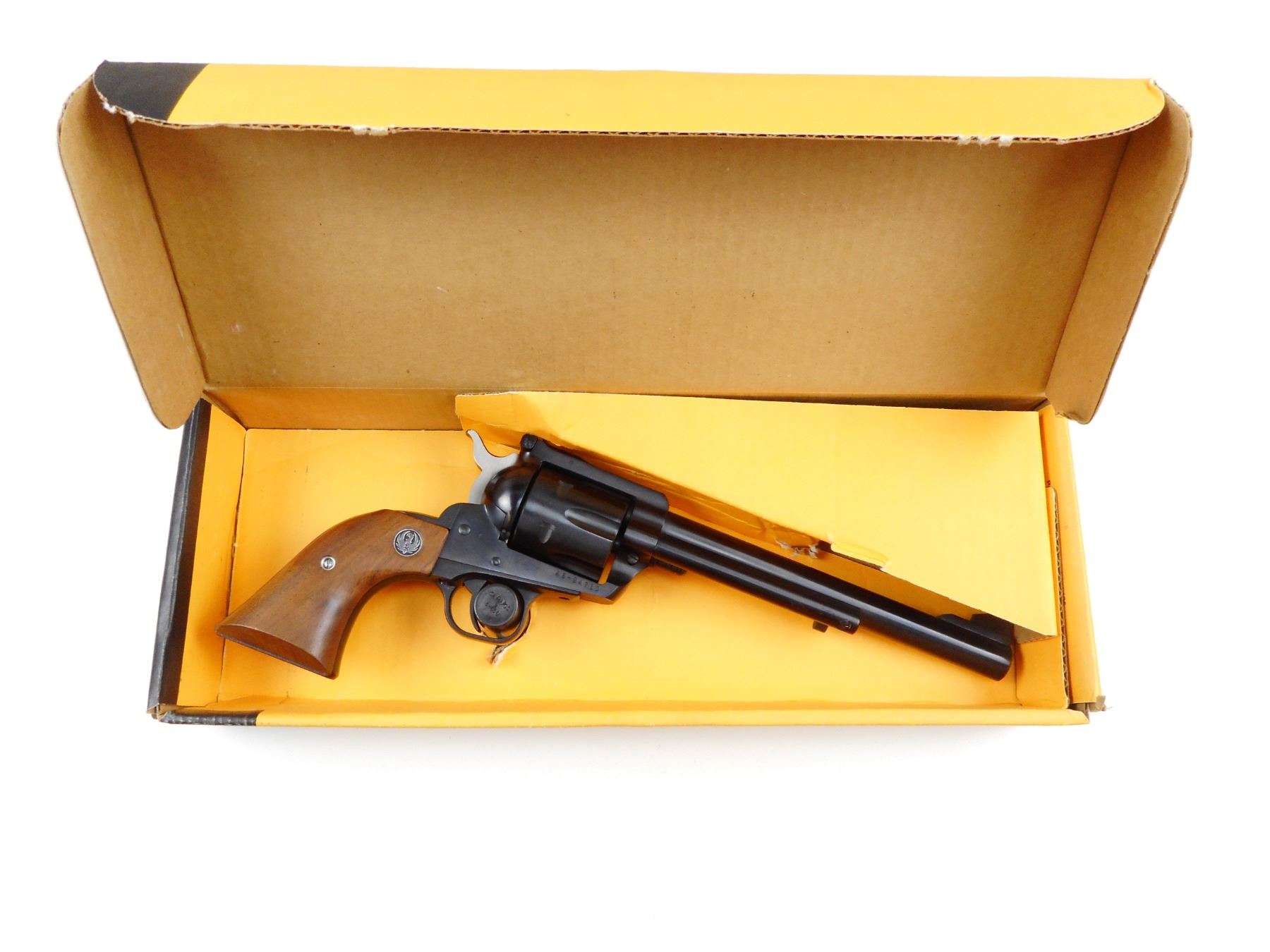 RUGER , MODEL: NEW MODEL BLACKHAWK , CALIBER: 45 COLT , COMES WITH ORIGINAL BOX, 6 SHOT CAPACITY, RAMP FRONT AND ADJUSTABLE REAR SIGHT, PLAIN WOOD GRIP PANELS WITH RUGER LOGO, HOLDS COCK, INDEXES WELL, ACTION IS TIGHT, SHOWS VERY LITTLE HANDLING MARKS, VERY GOOD BORE , SERIAL # 4684780 , STOCK # 4115 , ACTION: REVOLVER , BARREL LENGTH: 191MM , CONDITION: 8/10 , CLASS: CANADIAN RESTRICTED CLASS
