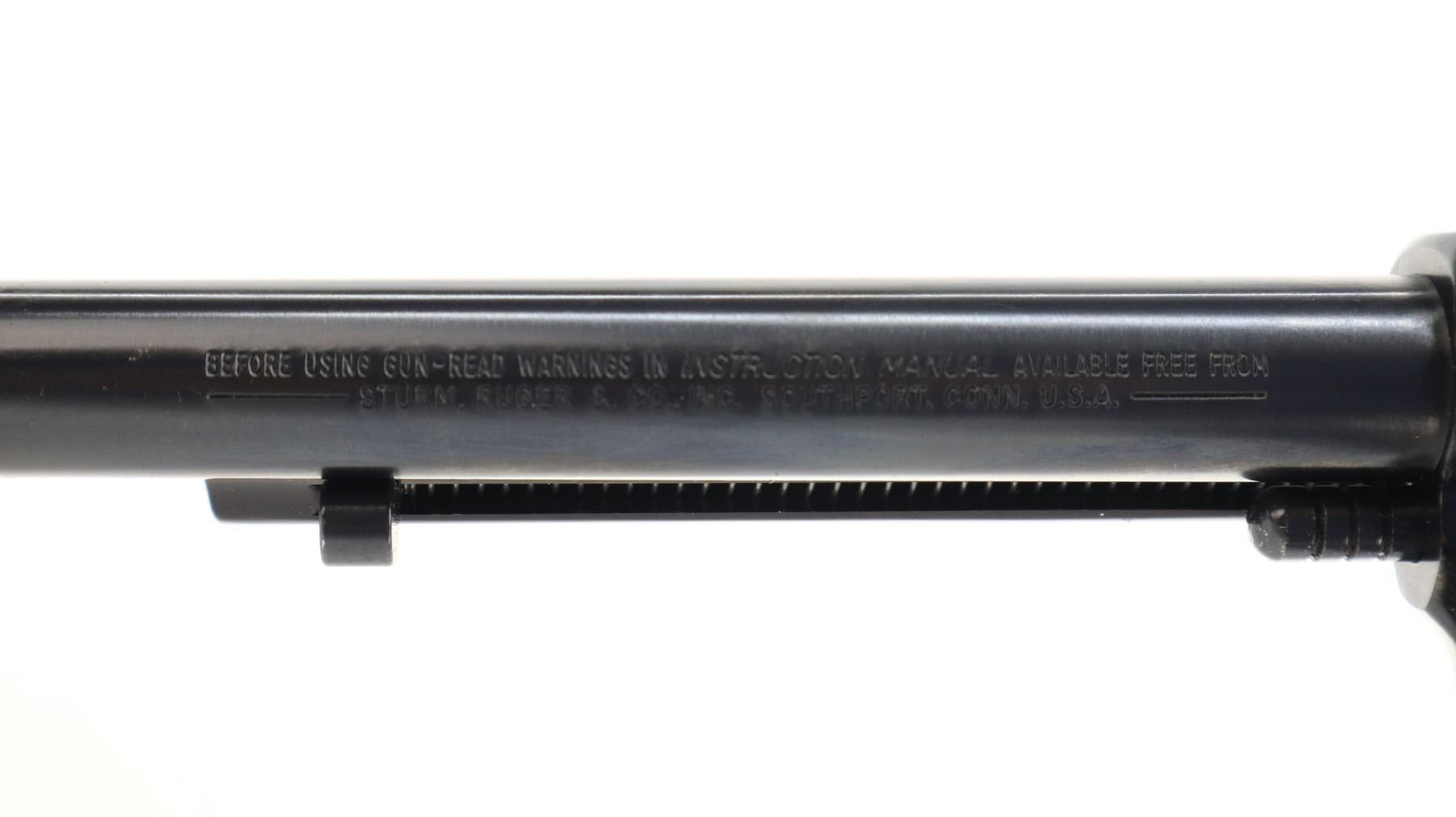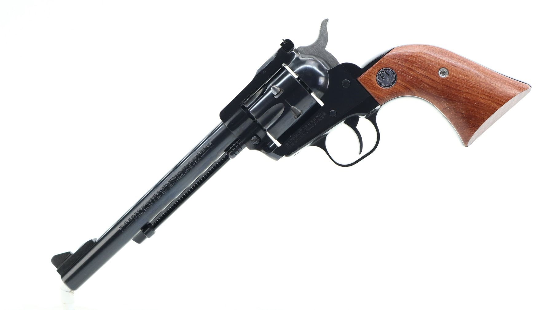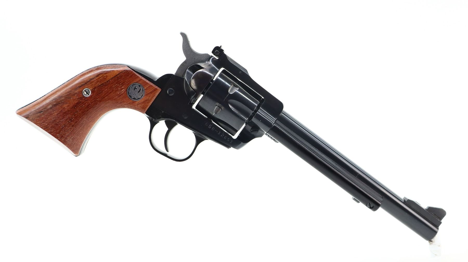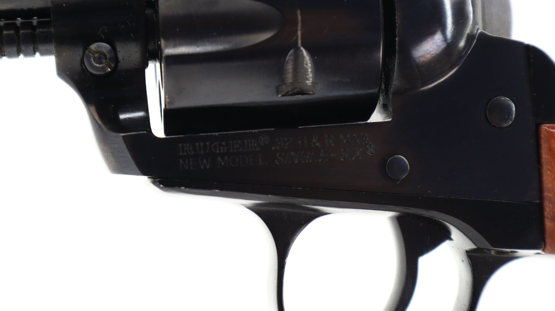 RUGER, MODEL: NEW MODEL SINGLE SIX , CALIBER:32 H& R MAGNUM, COMES WITH CASE, BORE IS EXCELLENT. FUNCTIONS MECHANICALLY AS DESIGNED. BLADE FRONT SIGHT WITH RAMP. ADJUSTABLE U NOTCH REAR SIGHT. BLUED FINISH. GROOVED SPUR HAMMER AND SMOOTH TRIGGER. TWO PIECE SMOOTH BROWN WOOD GRIPS WITH RUGER MEDALLIONS, BLACK ALLOY TRIGGER GUARD AND BACK STRAP. EJECTOR ROD UNDER RIGHT SIDE OF BARREL. METAL FINISH SHOWS SOME SCRATCHES AND HANDLING MARKS AND WEAR. GRIPS SHOW SOME MARKS AND SCRATCHES. BARREL LENGTH: 165MM , SERIAL # 65012651, CONDITION: 7/10, ACTION: REVOLVER, CLASS: CANADIAN 12-6 PROHIBITED