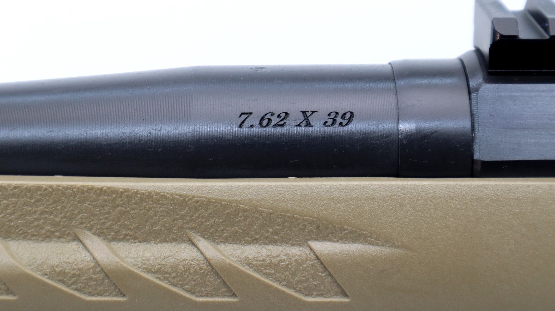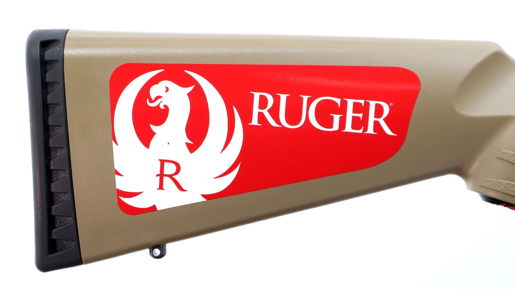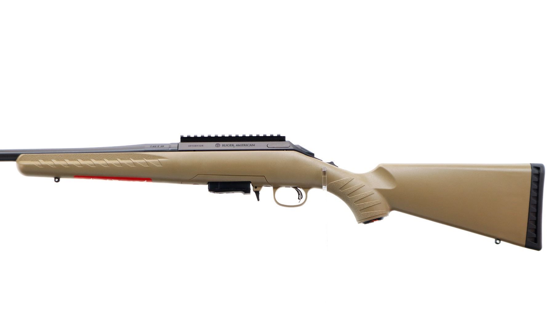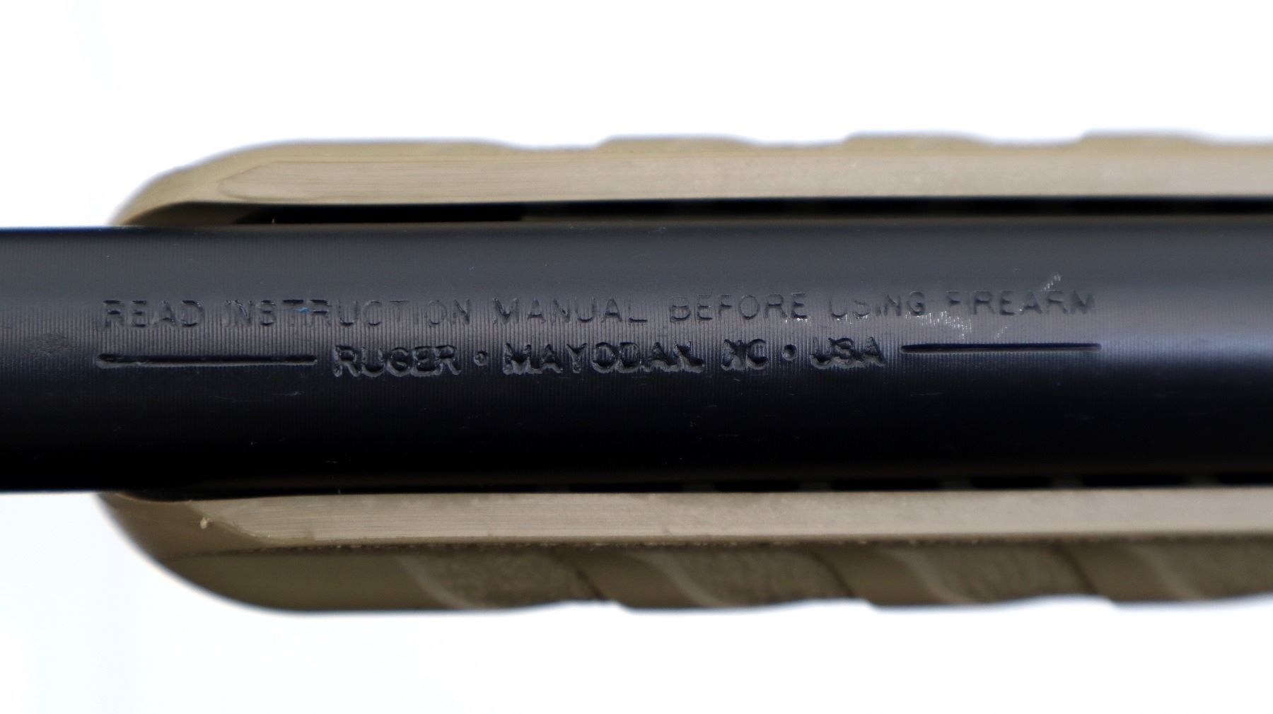 Main Description: No sights, Parkerized metal finish, threaded muzzle with cap, receiver drilled and tapped with one piece scope base installed, smooth bolt knob, tang safety, uses Ruger Mini 30 Magazines. One piece FDE synthetic stock, textured forearm and pistol grip panels, black rubber recoil pad, grip cap, extended mag release, swivel studs, retains factory stickers