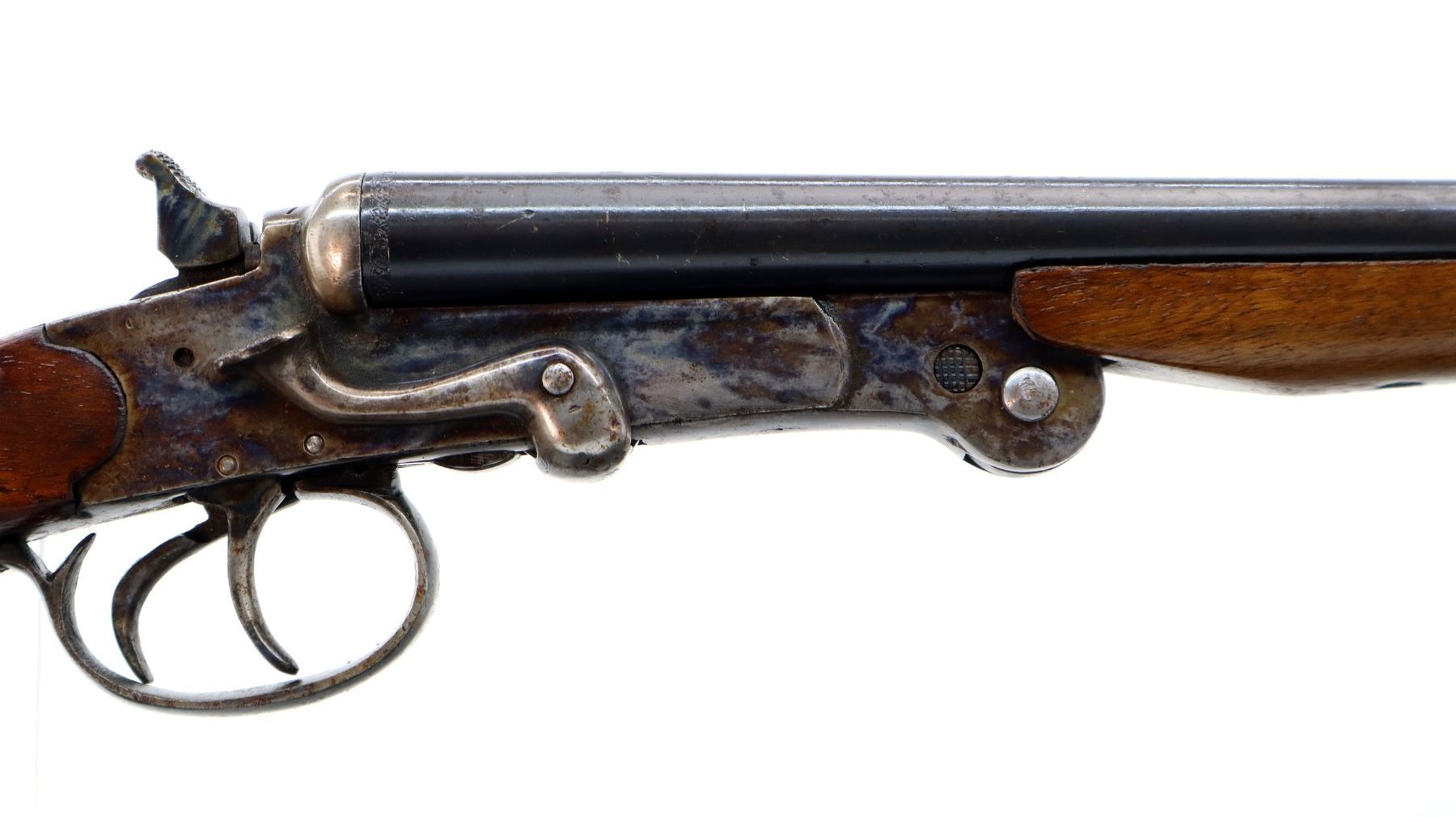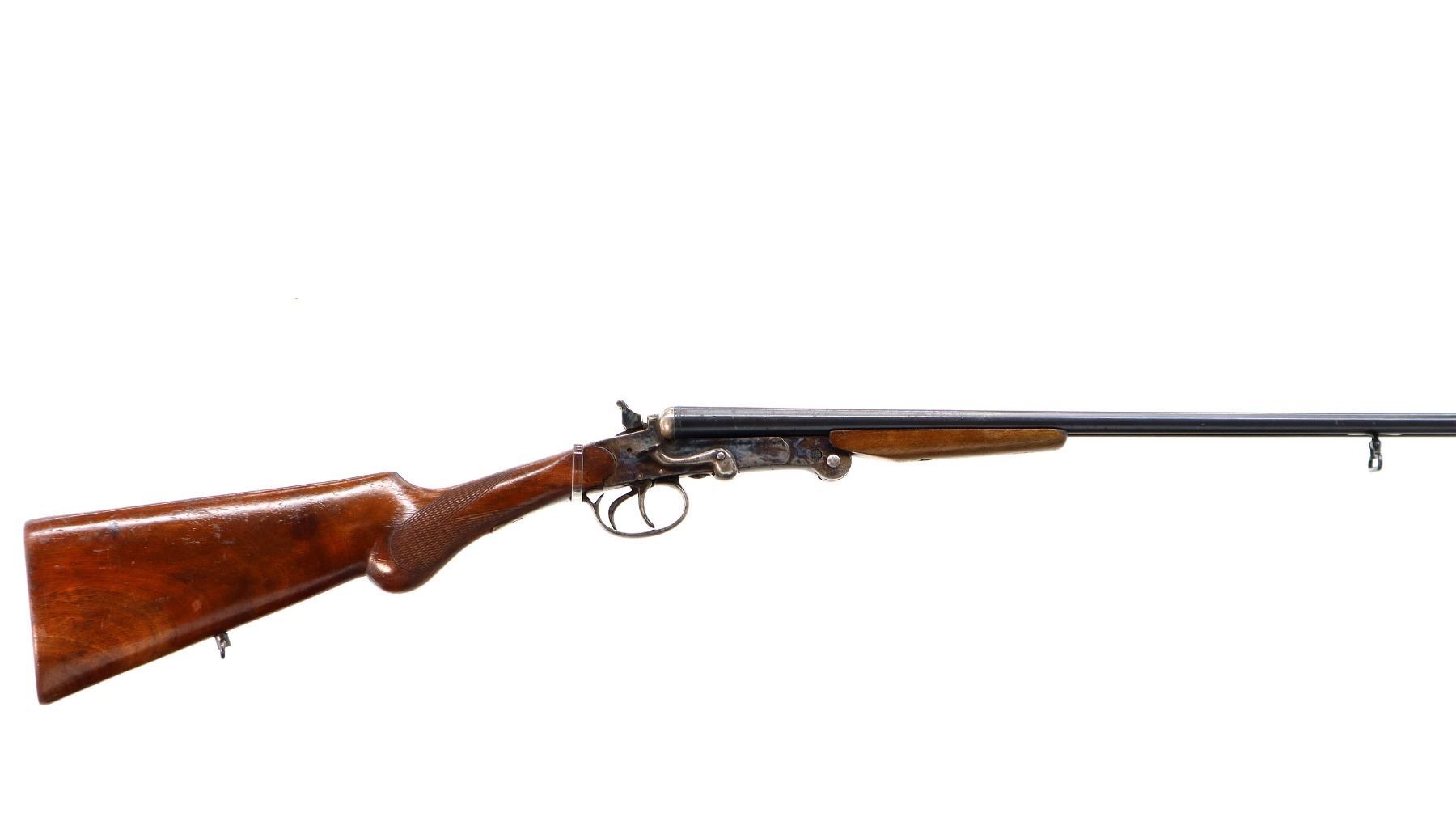 Main Description: Brass bead, blued barrels with grooved rib, colour case hardened receiver, checkered spur hammers that function, opening lever on right side, extractor, double triggers. Two piece wood stocks, checkered pistol grip, smooth butt, sling swivels.