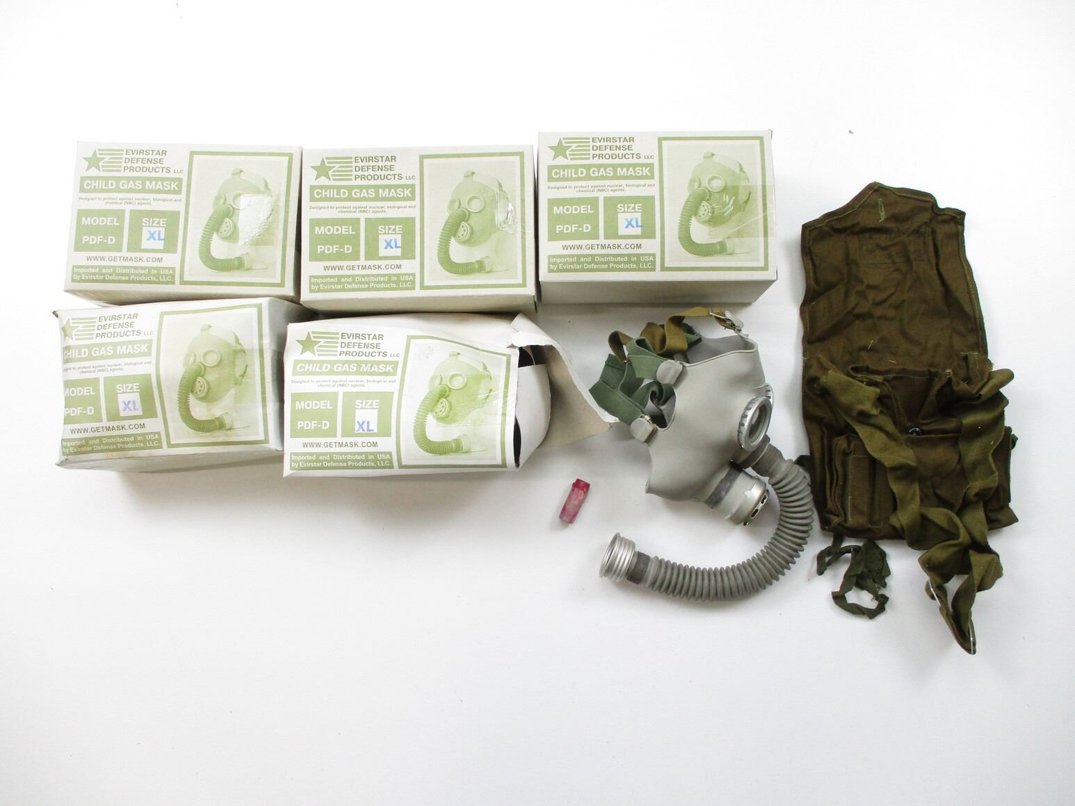 RUSSIAN CHILD GAS MASK LOT, LOT INCLUDES; (5) CHILD GAS MASKS IN ORIGINAL PACKAGING, PACKAGE MARKED: "MODEL PDF-D, SIZE XL", NO FILTERS. SEE PHOTOS.