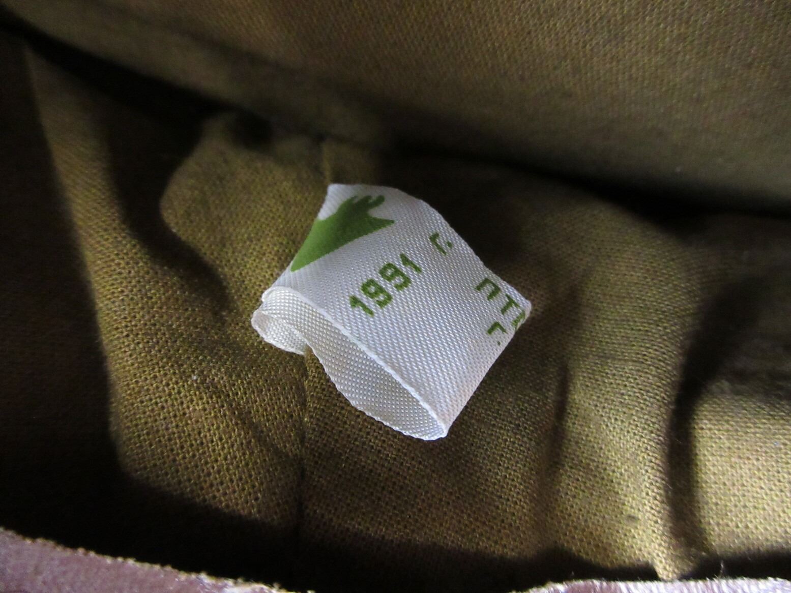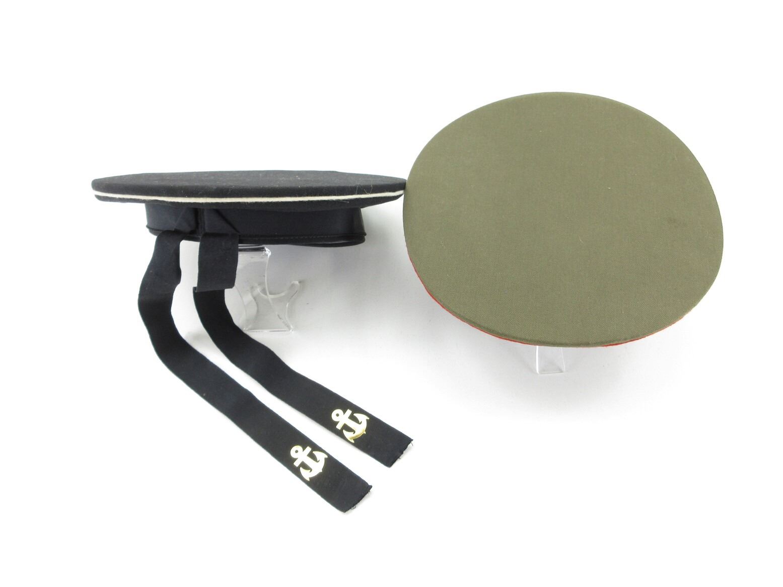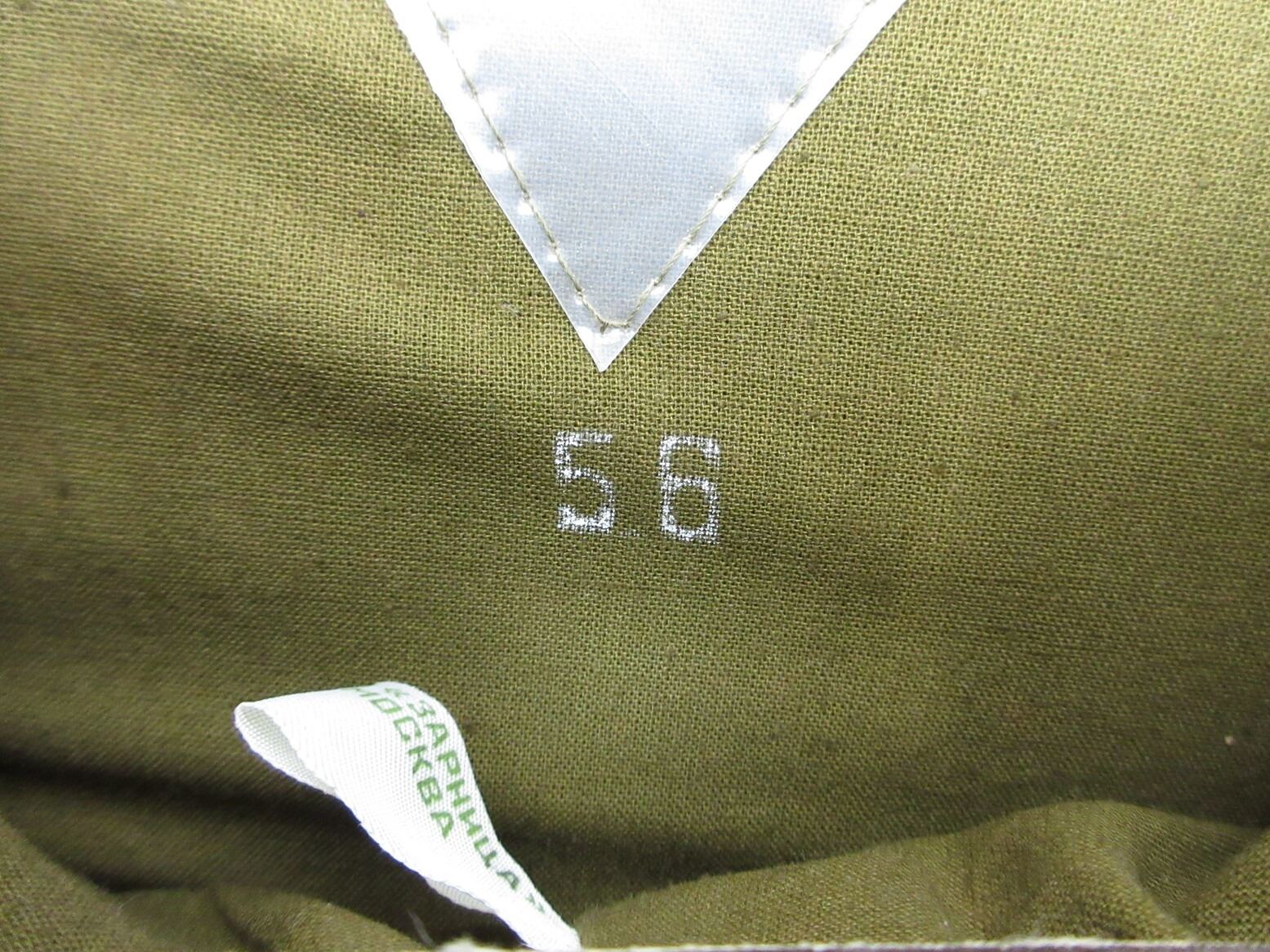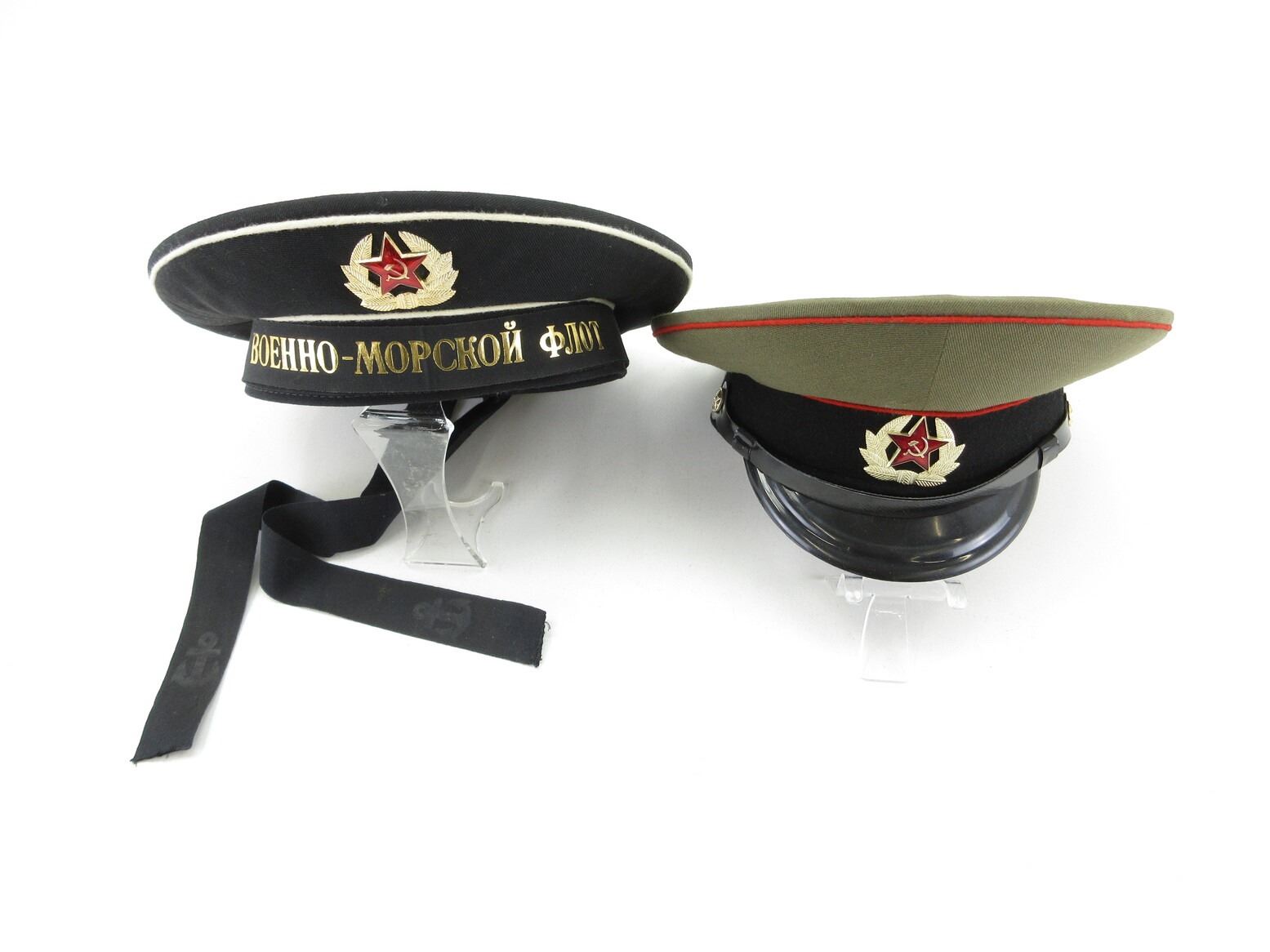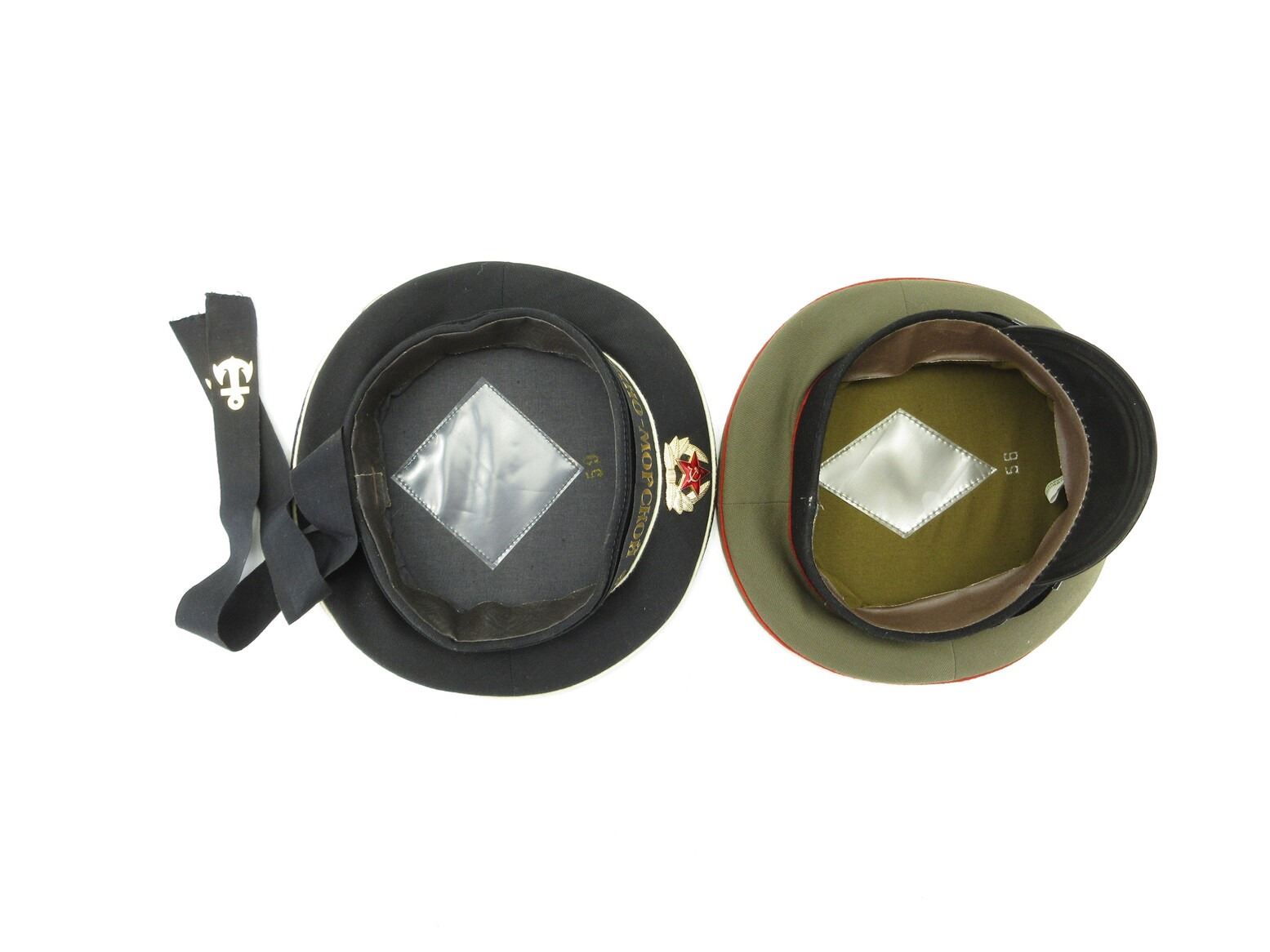 RUSSIAN MILITARY CAP LOT. LOT INCLUDES; (1) NAVY DRESS HAT WITH HAMMER & SICKLE CAP BADGE, VARIOUS RUSSIAN MARKINGS ACROSS RIBBON ON BRIM, ANCHORS ON RIBBON ENDS, INK STAMPED "59" INSIDE HAT & (1) BROWN WOOL HAT WITH RED PIPING, HAMMER & SICKLE CAP BADGE, INK STAMPED "56" INSIDE HAT, LABEL DATED: "1991". SEE PHOTOS.