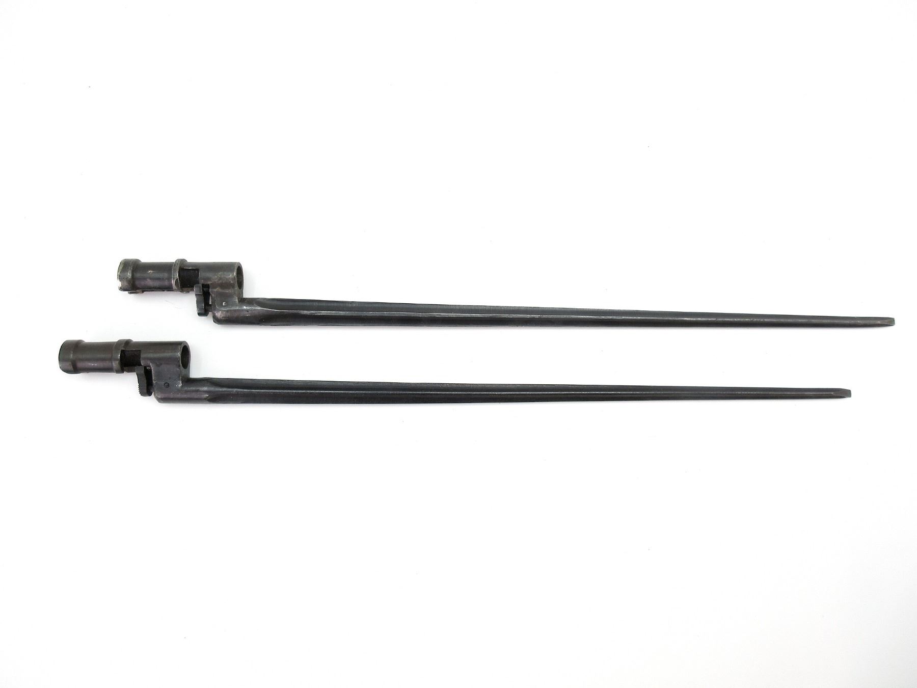LOT INCLUDES; (2) FITS 7.62MM M1891/30 MOSIN NAGANT RIFLES, CRUCIFORM BLADES, ONE SOCKET MARKED: "9698", PARTIAL STAR & VARIOUS FAINT / UN-CLEAR PROOF MARKS & OTHER SOCKET MARKED: "221922" & VARIOUS FAINT / UN-CLEAR PROOF MARKS, NO SCABBARDS, BLADES APPROX. 17" & OALS APPROX. 19 7/8". SEE PHOTOS.