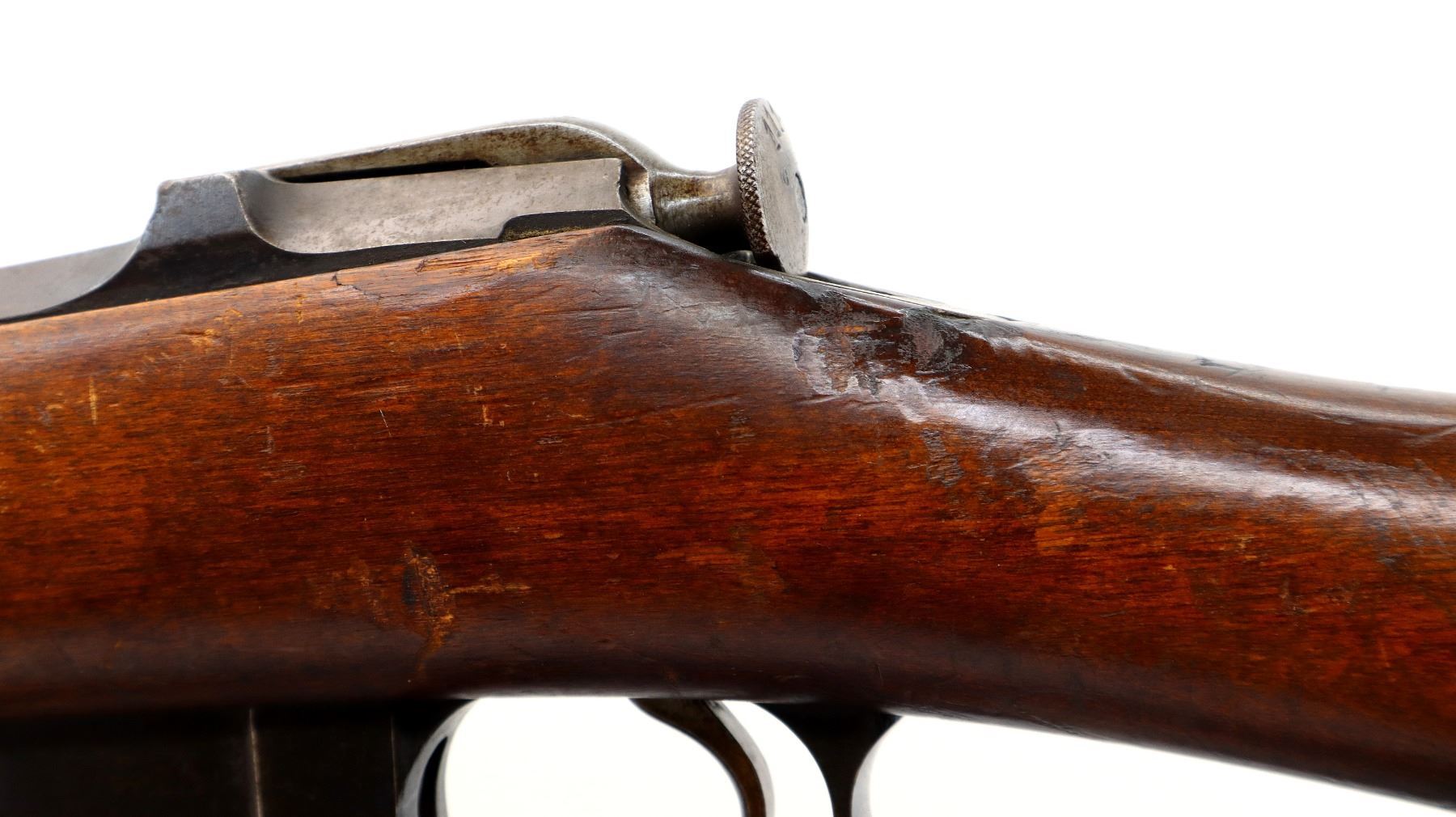 Main Description: Manufactured by Imperial Tula 1902, serial numbers mismatched. Note: This rifle has a plugged chamber unsure what was used may not be fireable. Barley corn front sight with ramp, adjustable u notched rear sight, hex receiver, straight bolt handle. One piece full military wood stock, finger grooved forearm, straight grip, smooth steel butt plate, sling swivels with brown leather sling, rear swivel is on front of trigger guard housing, cleaning rod.