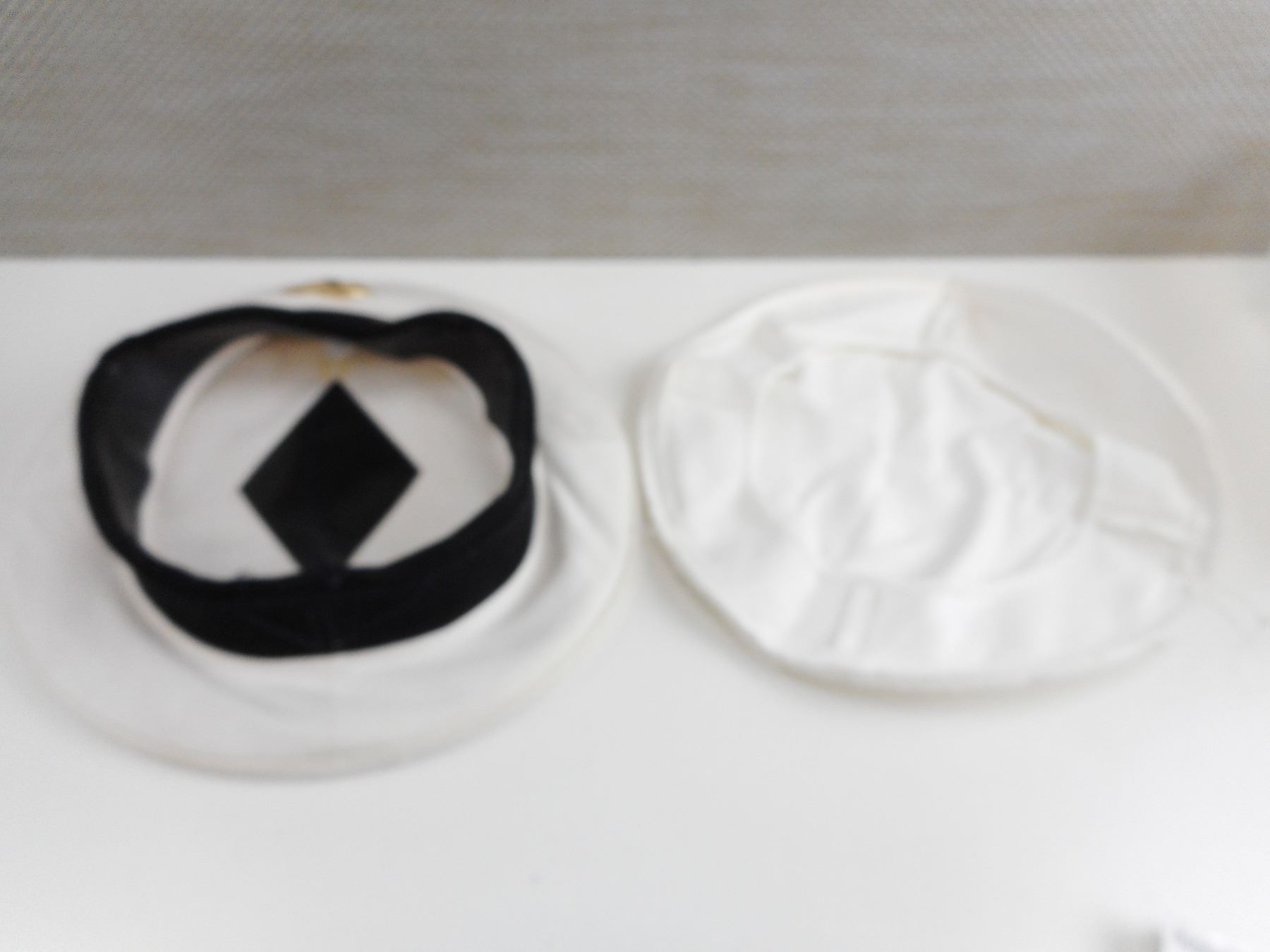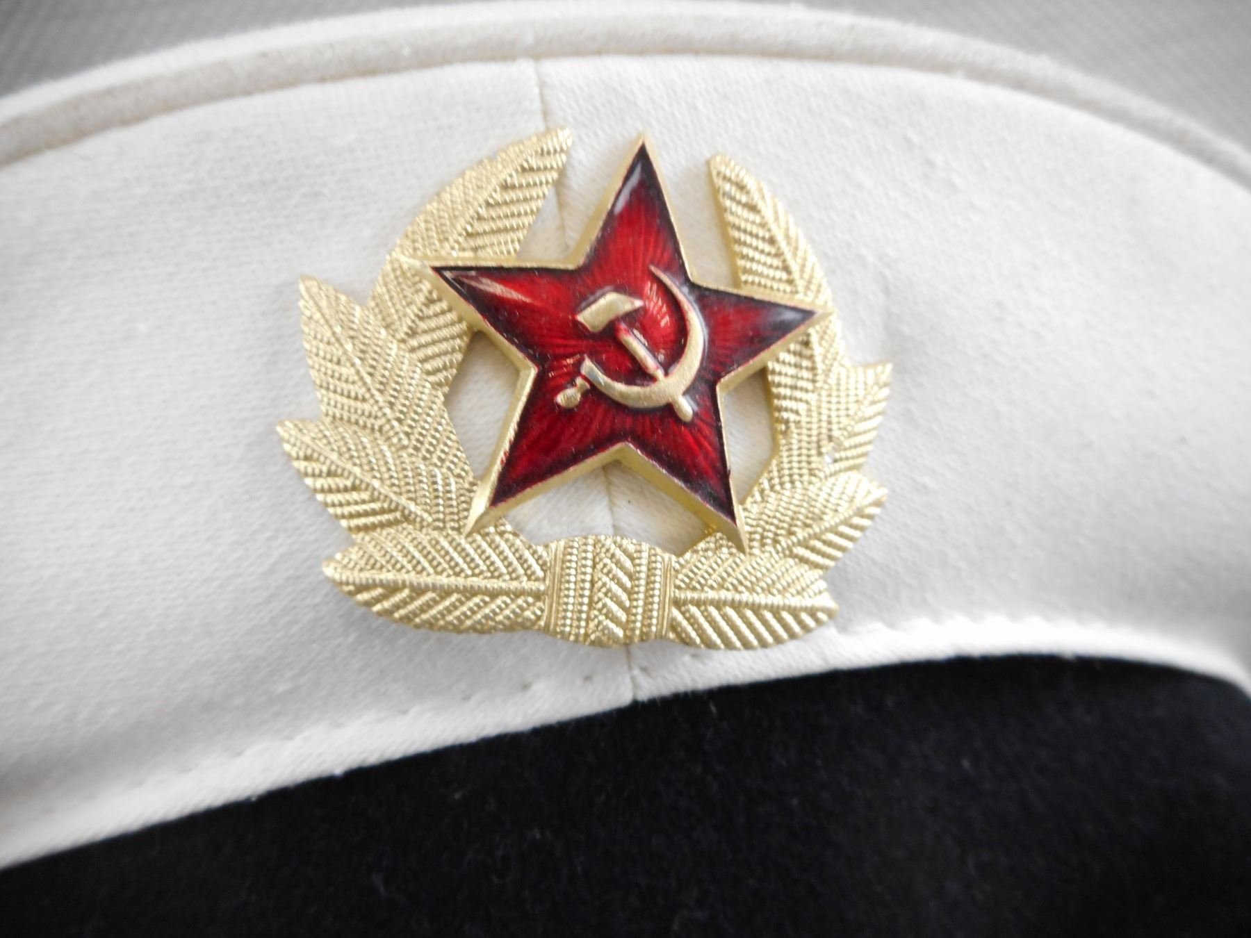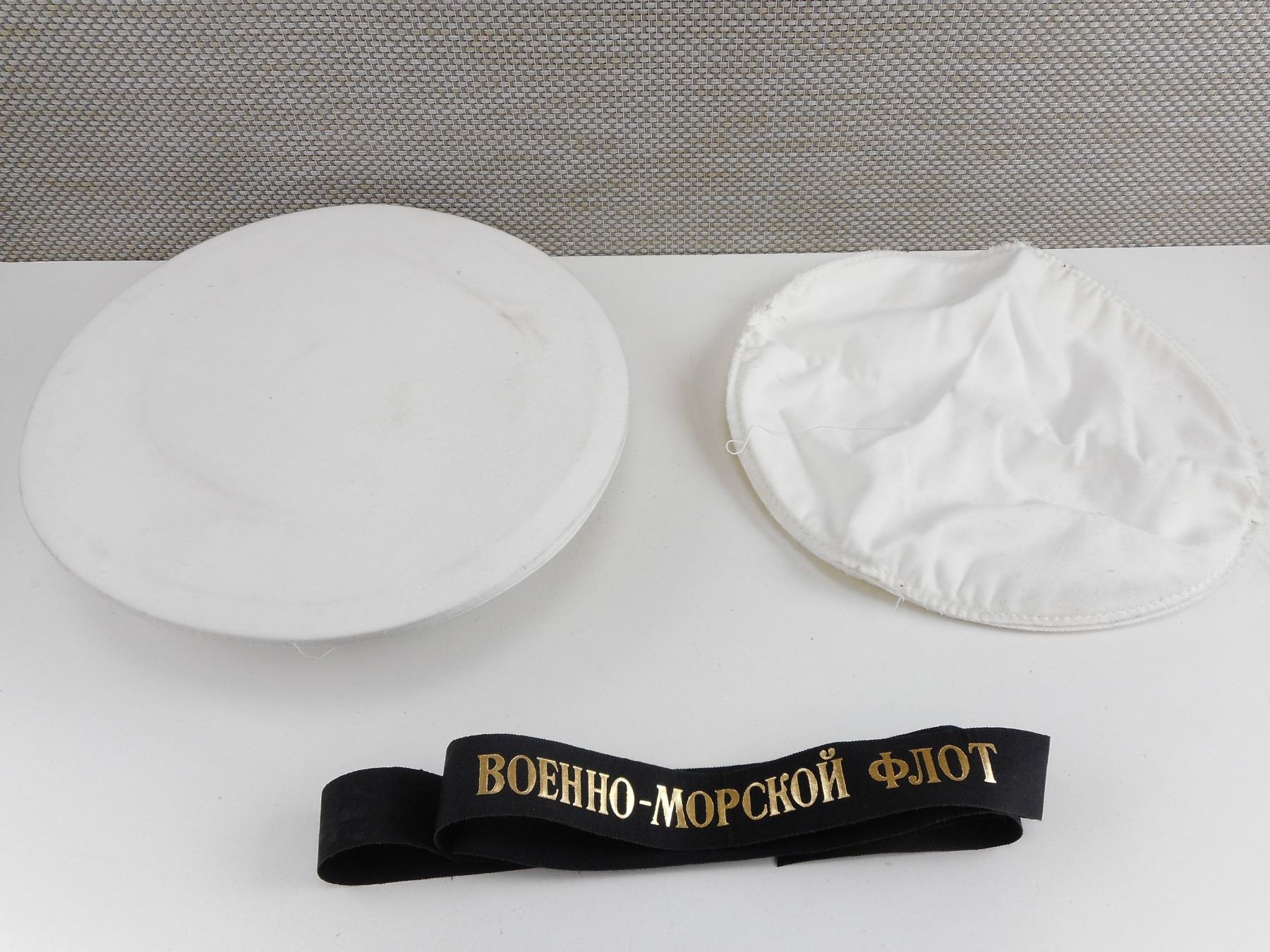 RUSSIAN NAVY CAP WITH CAP BADGE , MARKED 58. HAS BOEHHO-MOPCKON CAP RIBBON, RUSSIAN CAP BADGE.