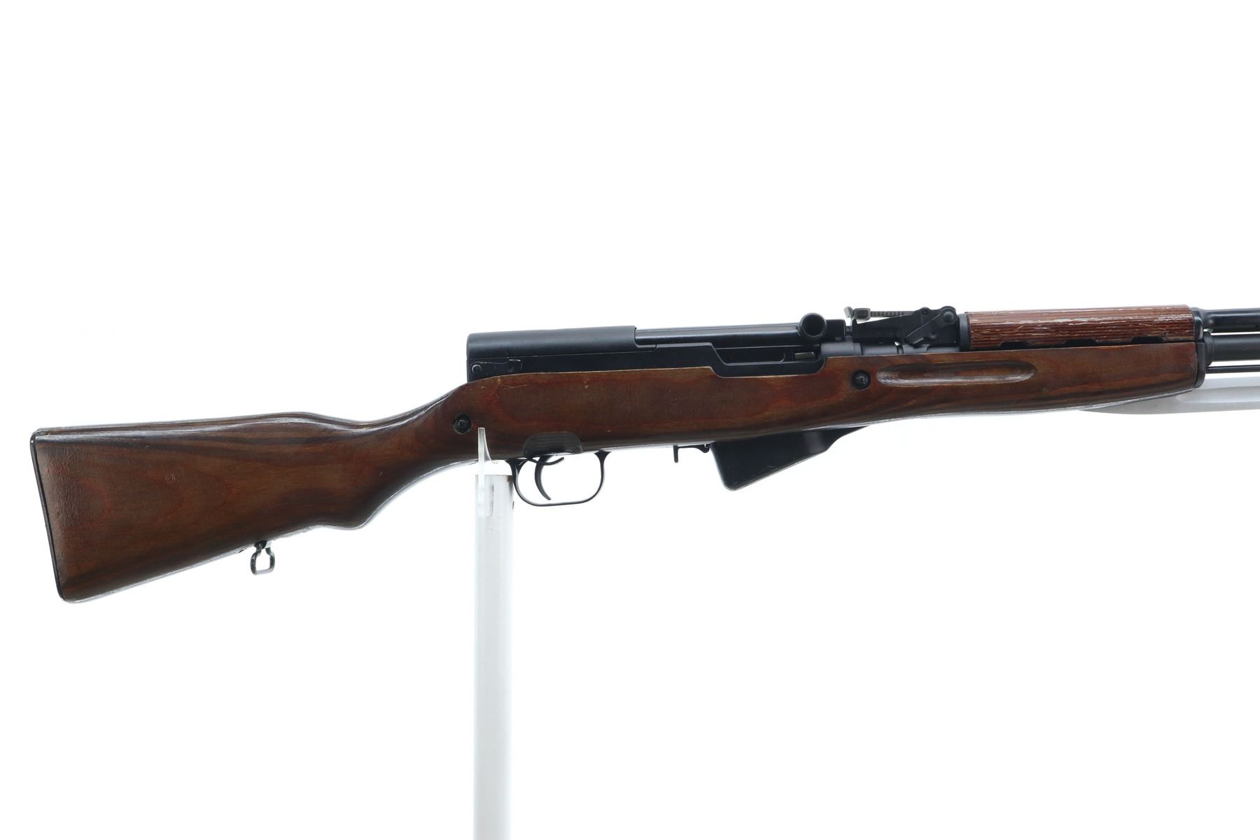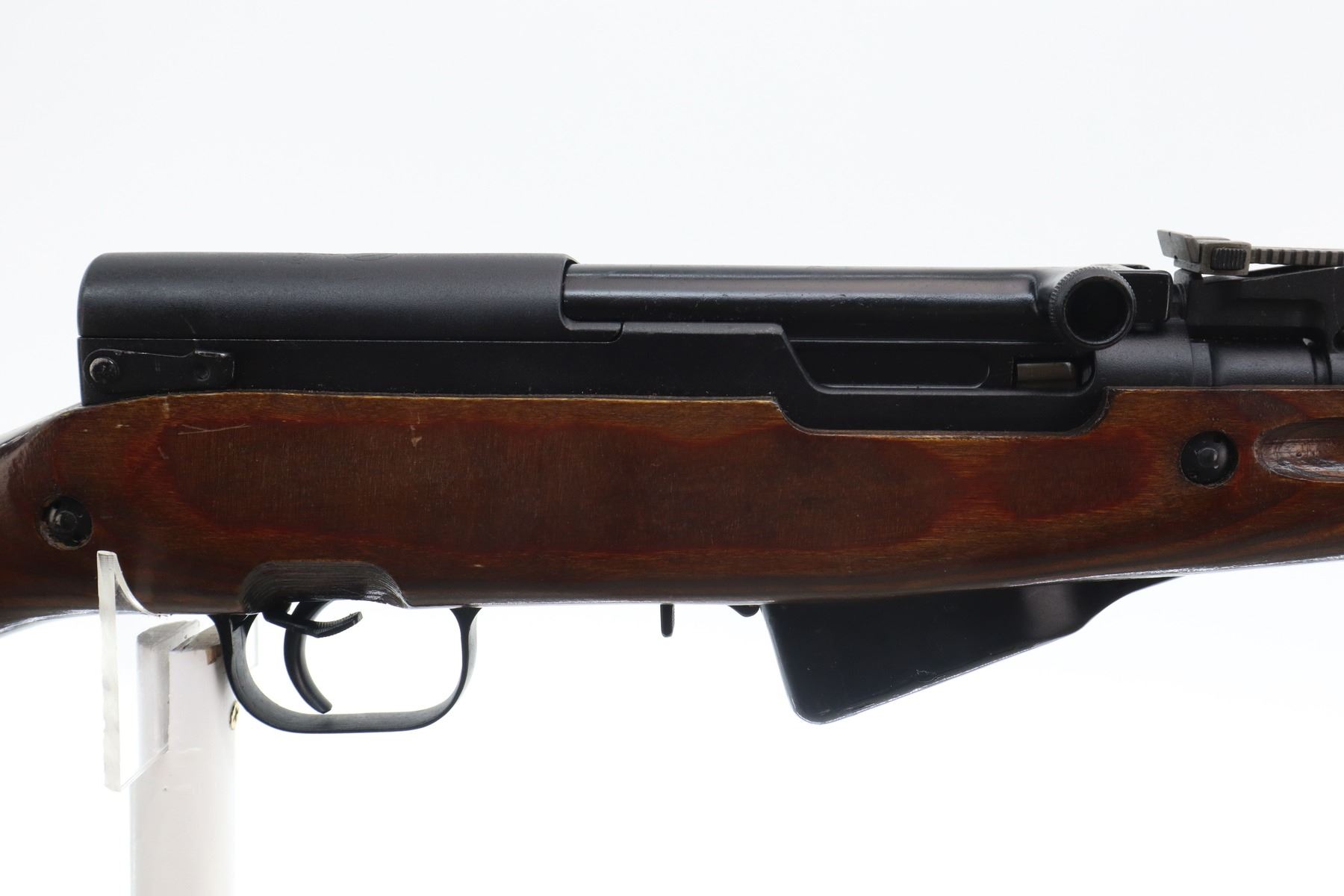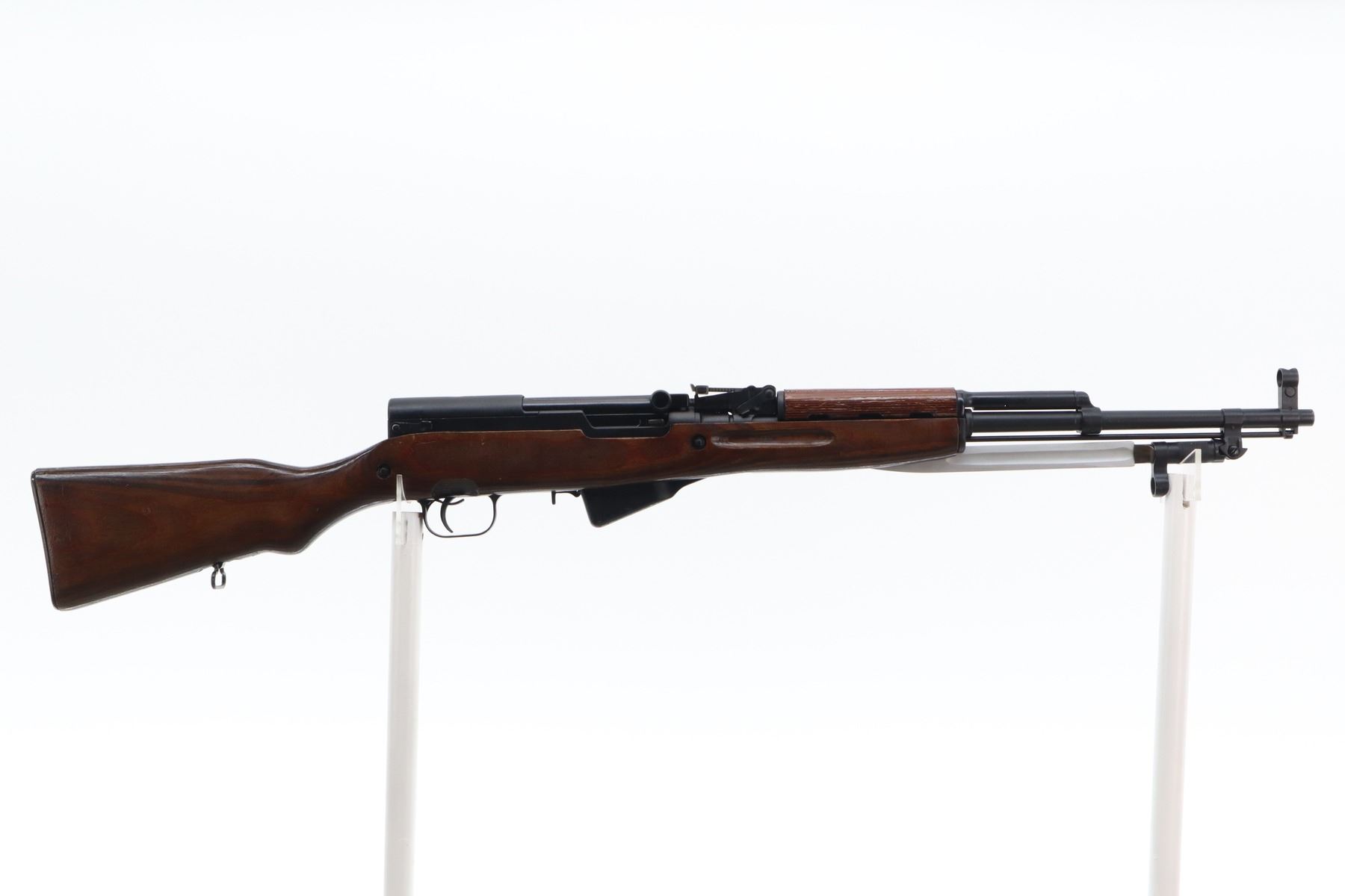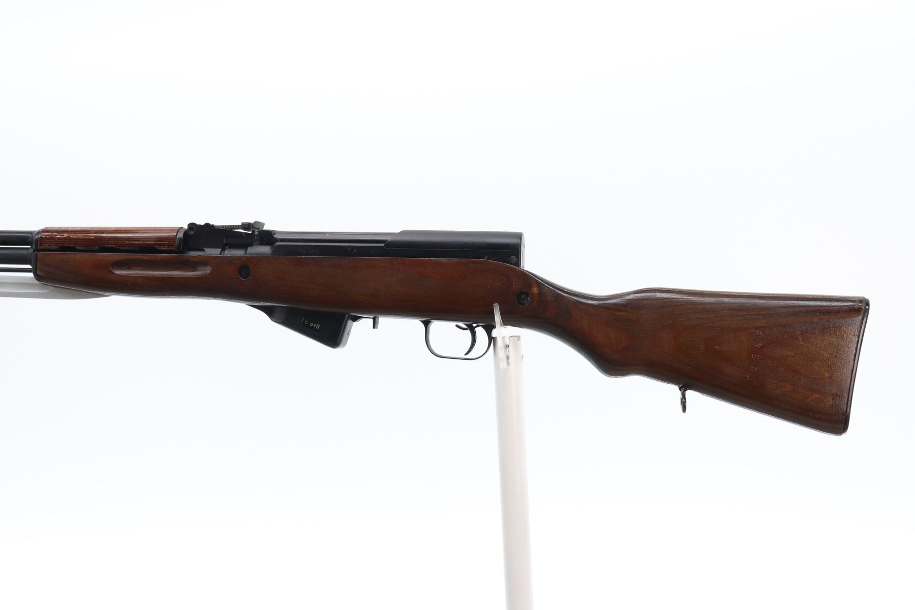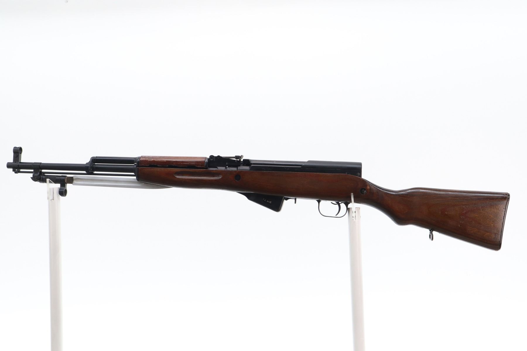 7+/10 , RUSSIAN SIMONOV , MODEL: SKS , CALIBER: 7.62 X 39 , BORE IS VERY GOOD. MANUFACTURED BY IZHEVSK 1955, ARSENAL REBUILT RENUMBERED TO MATCH. POST FRONT SIGHT WITH HOOD, ADJUSTABLE U NOTCH REAR SIGHT, BOLT AND CARRIER BLACKENED. TWO PIECE LAMINATE FULL MILITARY STOCK, FINGER GROOVED FOREND, PISTOL GRIP, SMOOTH STEEL BUTT PLATE WITH TRAP, SWIVELS, CLEANING ROD, FOLDING BLADE BAYONET. METAL FINISH SHOWS SOME SCRATCHES, HANDLING MARKS AND WEAR. STOCK SHOWS SOME DINGS, SCRATCHES AND WEAR. , ACTION: SEMI AUTOMATIC RIFLE , BARREL LENGTH: 20.25" , SERIAL: E846 , CONDITION: 7+/10 , CLASS: CANADIAN NON RESTRICTED