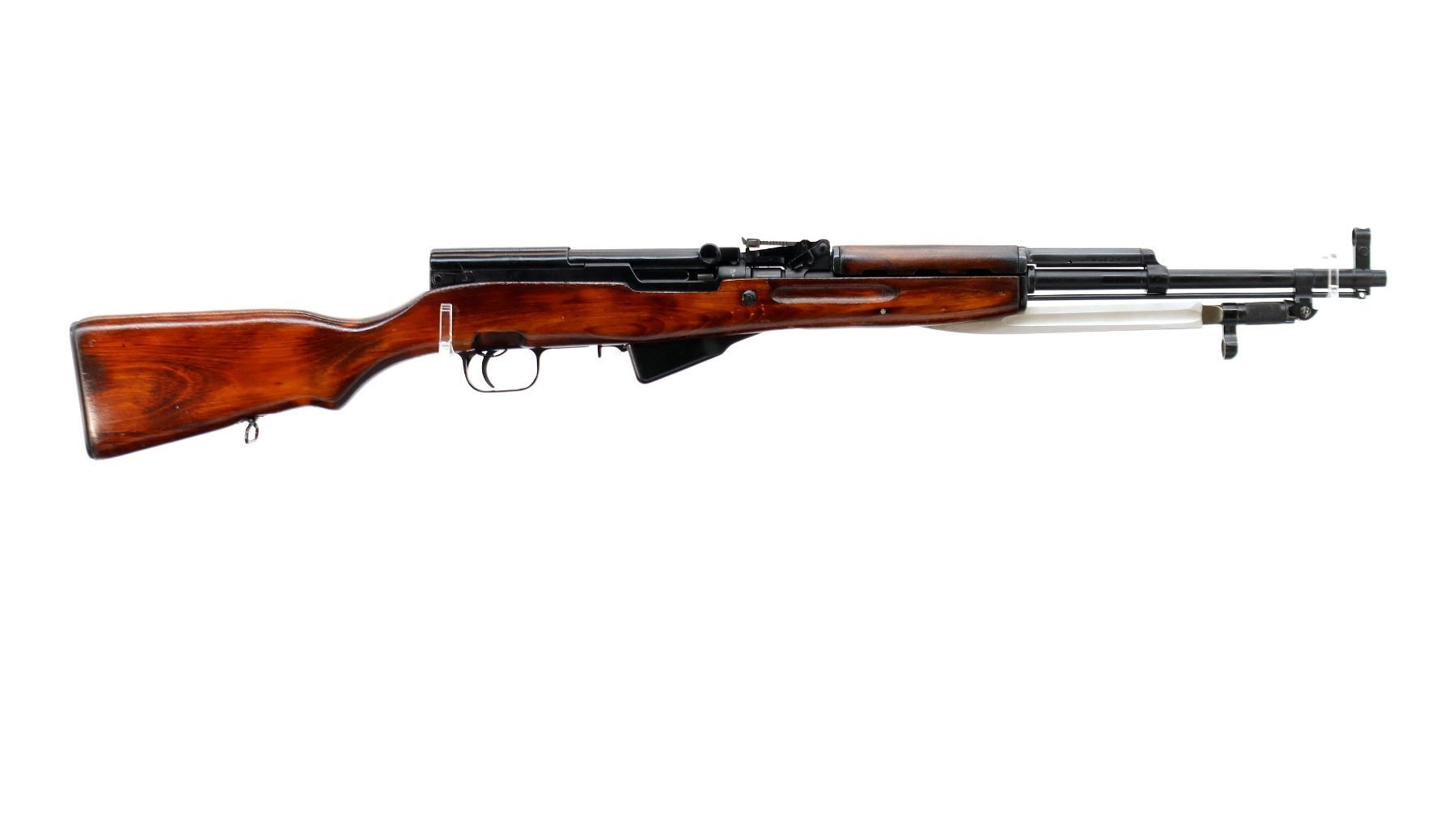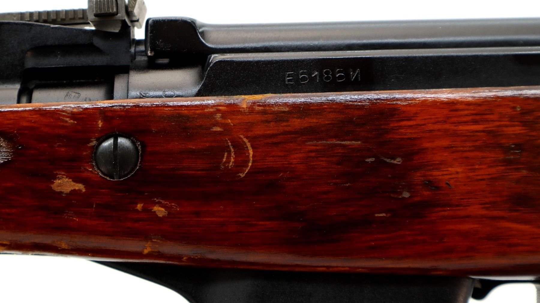Main Description: Manufactured by Izhevsk 1954, arsenal refurbished numbered to match. Post front sight with hood and ramp, adjustable u notched rear sight, black painted metal finish. Two piece full military wood stock, finger grooved forearm, pistol grip, smooth steel butt plate with trap, sling swivels, cleaning rod, attached folding blade bayonet.