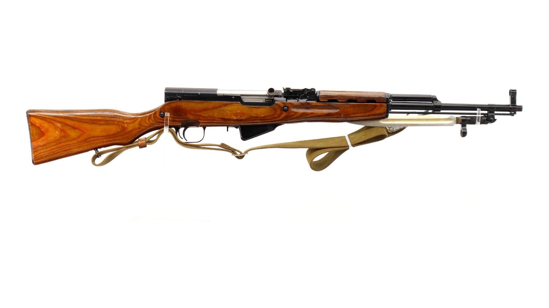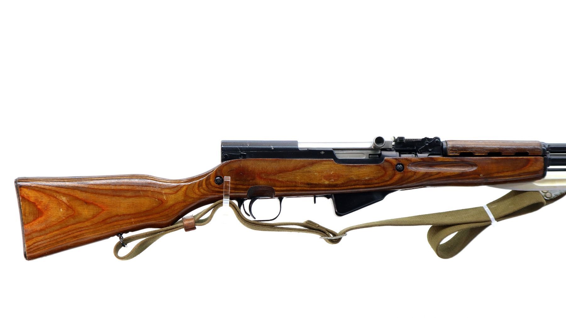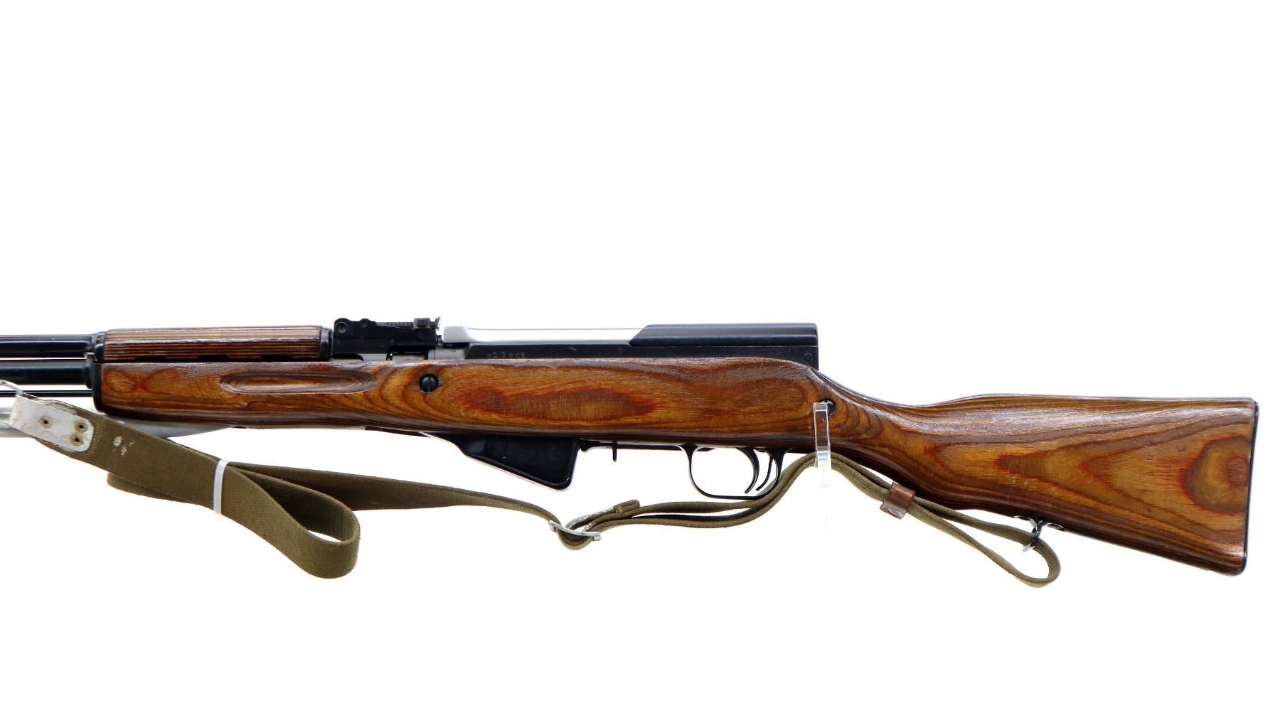 Main Description: Russian Manufacture, arsenal rebuilt numbered to match except magazine. Post front sight with hood and ramp, adjustable u notched rear sight, black painted metal finish, silver bolt and carrier. Two piece full military laminate wood stocks, ventilated handguard, finger grooved forearm, pistol grip, smooth steel butt plate with trap, sling swivels with tan canvas military sling, attached folding blade bayonet, cleaning rod.