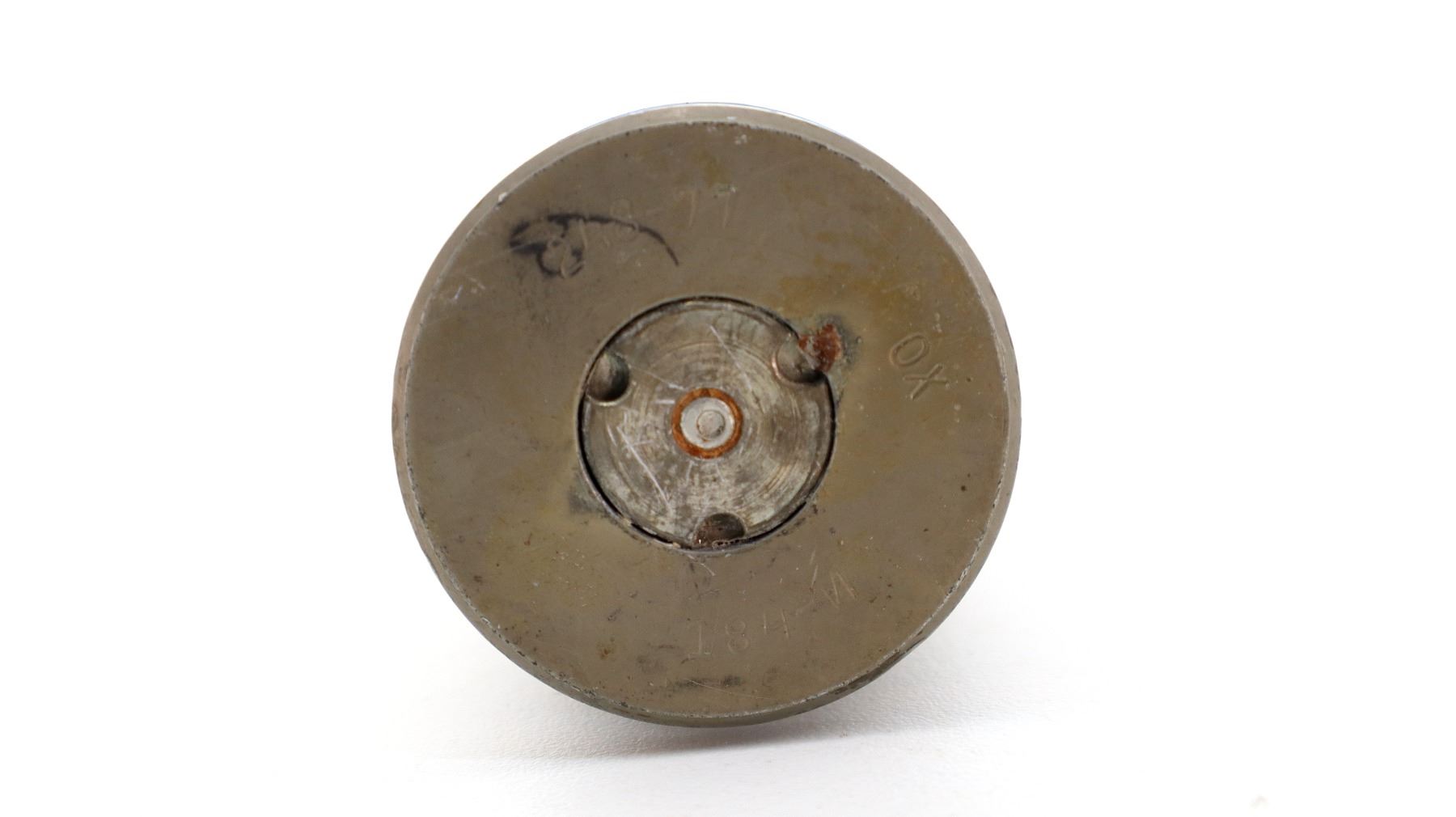 (1) STEEL CASING, STEEL PROJECTILE, COPPER BAND, FIRED PRIMER, PROJECTILE MARKED: PROOF MARK, "-76", PROOF MARK, VARIOUS HAND WRITTEN MARKINGS ON STEEL CASING BODY, BOTTOM MARKED: "248-77, OX, 184-?", APPROX. 1.5" DIA. & OAL APPROX. 11.25". SEE PHOTOS.