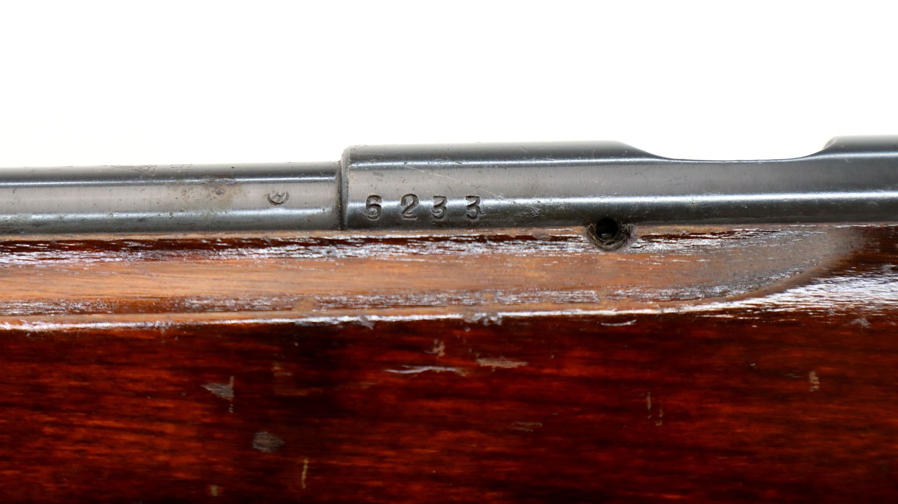 Main Description: Post front sight with hole and ramp, adjustable rear peep sight with replaced screw, blued finish, heavy barrel, smooth bolt knob. One piece target wood stock, finger grooved forearm, pistol grip, smooth steel butt plate, sling swivels.