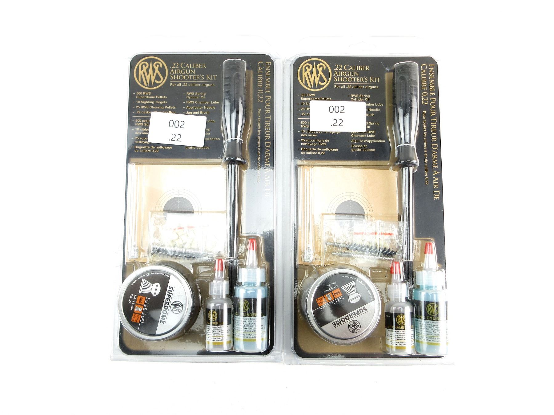 LOT INCLUDES; (2) .22 CAL. SHOOTER'S KIT FOR .22 CAL. AIRGUNS, KITS APPEAR NOS IN ORIGINAL PACKAGING, WITH APPROX. (500) .22 CAL. SUPERDOME PELLETS, SIGHTING TARGETS, CLEANING PELLETS, CLEANING ROD / JAG & BRUSH, ETC. SEE PHOTOS.