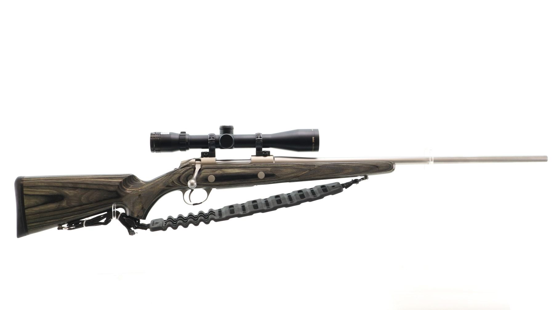 Main Description: No sights, stainless finish, receiver has integral scope bases with a Bushnell Elite 6500 2.5-16x44 scope, clear optics with DOA reticle, smooth bolt knob. One piece grey laminate wood stock, checkered forearm and pistol grip, cheek rest, black rubber recoil pad, grip cap, sling swivels with black rubber/nylon sling.