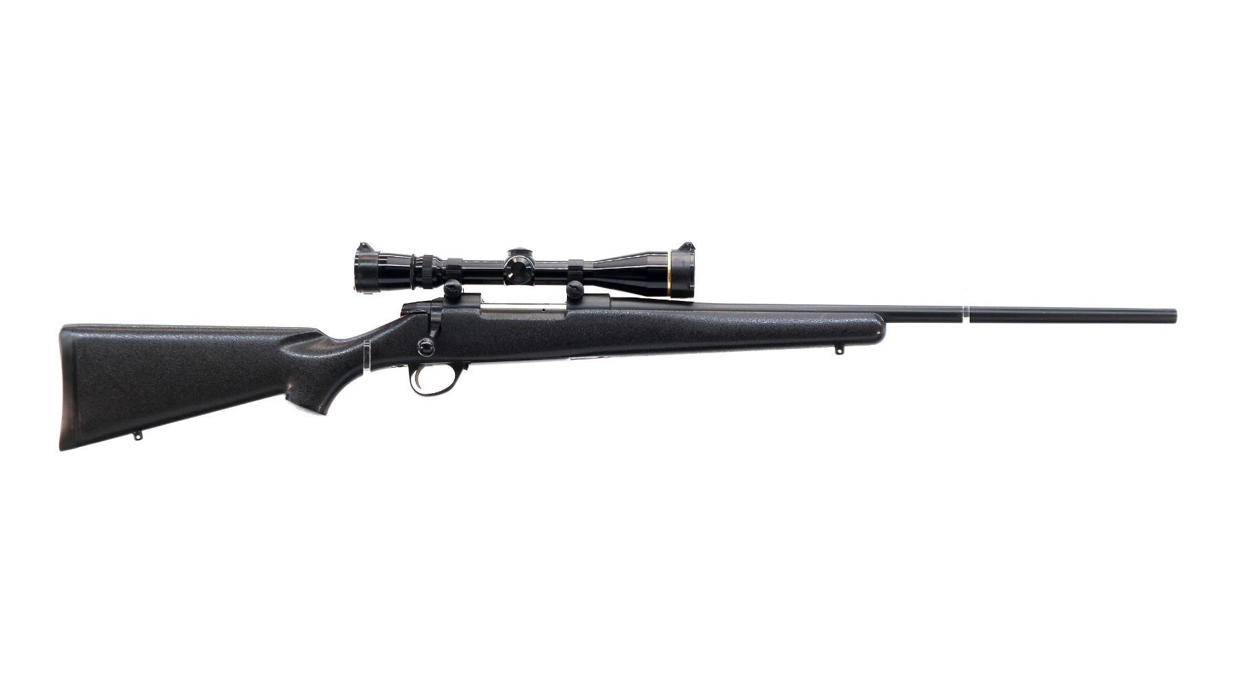 Main Description: No sights, Parkerized metal finish, receiver has integral scope bases with Leupold Vari X III 3.5-10 scope installed, clear optics with duplex crosshair. Smooth bolt knob. One piece textured black polymer stock, pistol grip, cheek rest, black rubber recoil pad, hinged floor plate, swivel studs.