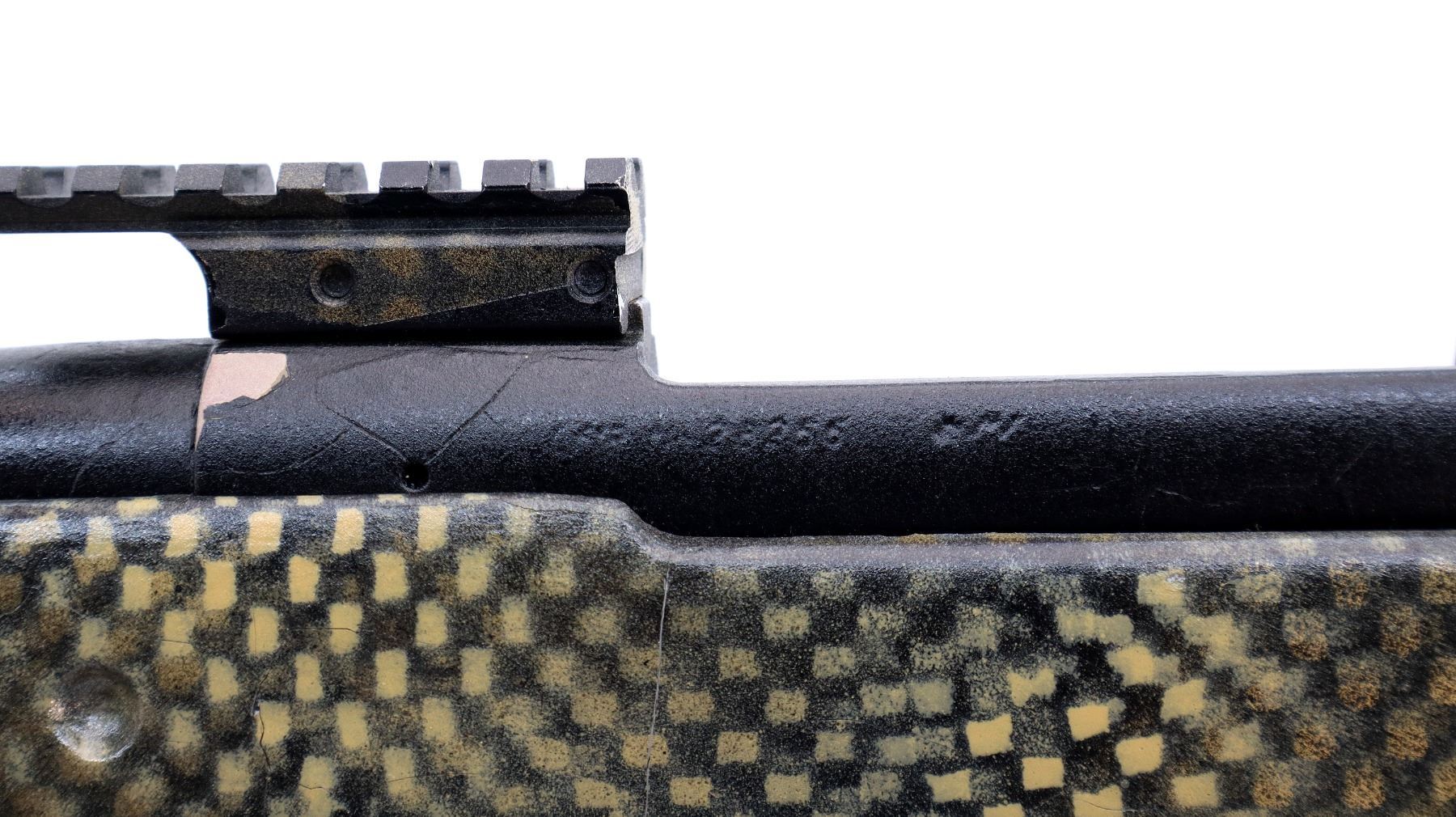 Main Description: No sights, black painted metal finish, barrel threaded at muzzle with cap, receiver has integral scope bases with two piece added on custom raised bases installed, large black rubber bolt knob. Custom painted synthetic stock, added on textured forearm rails, pistol grip, collapsible butt stock with adjustable cheek rest, adjustable black rubber recoil pad, 15" LOP, Monopod and front swivel stud.