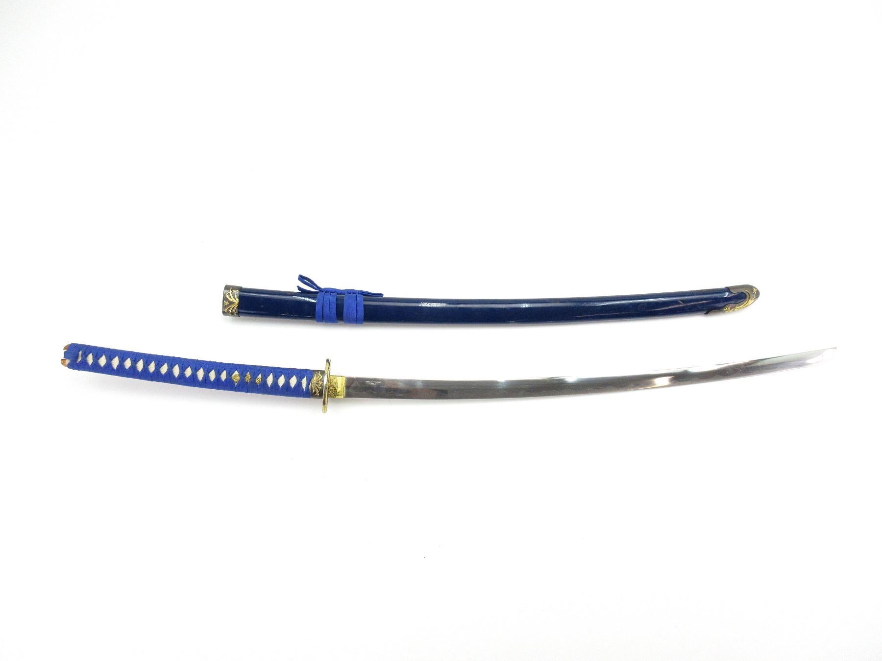 (1) STEEL BLADE, BLADE MARKED: "440 STAINLESS, CHINA", BLUE LACE WRAPPED HILT & BRASS ACCENTS, BRASS TYPE GUARD, WOOD POMMEL, BLUE POLYMER TYPE SHEATH WITH METAL ACCENTS, BLADE APPROX. 29.5" & OAL APPROX. 43". SEE PHOTOS.