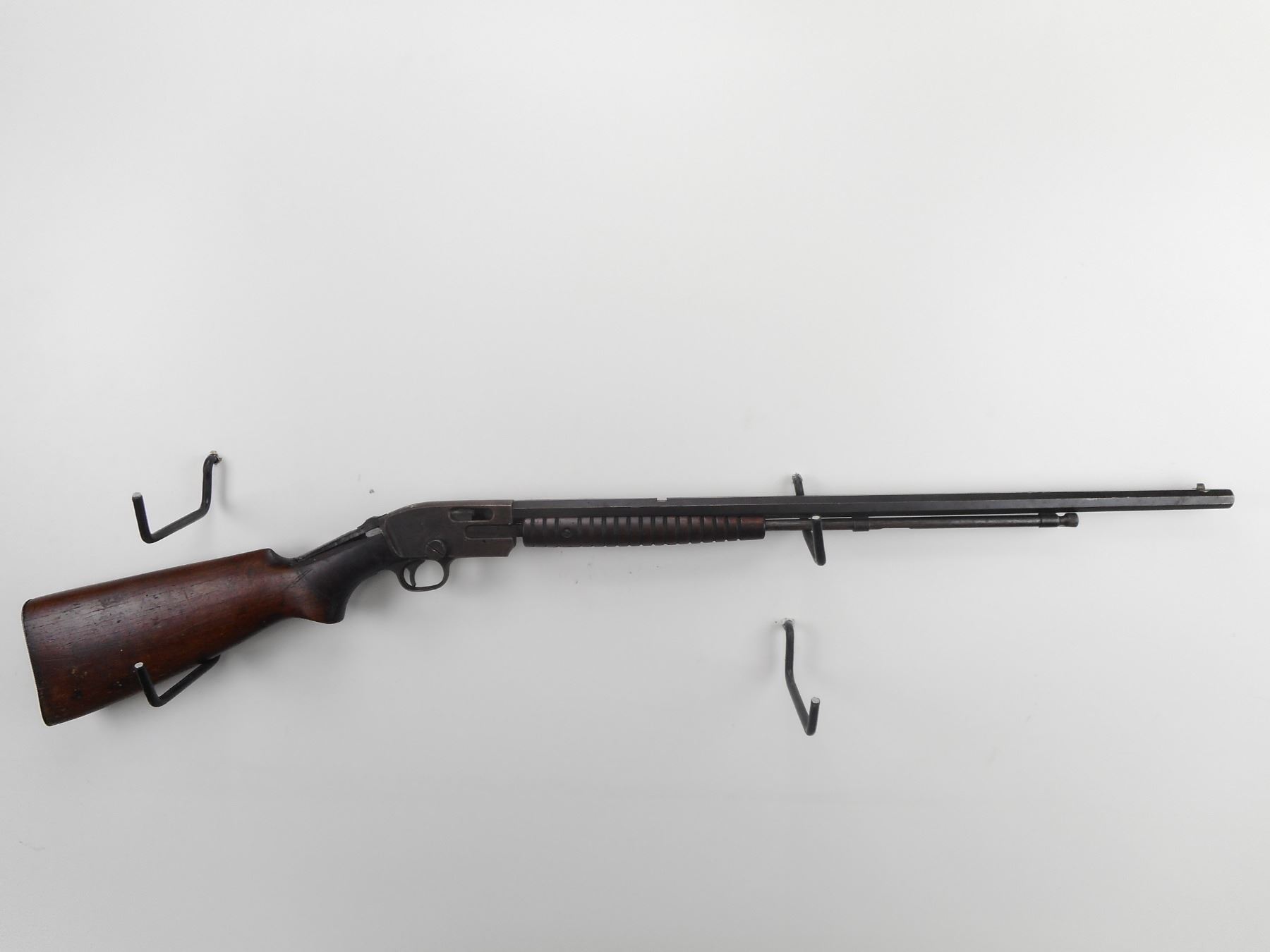 SAVAGE , MODEL: 1914 , CALIBER: 22 LR , BORE IS DARK. BLADE FRONT SIGHT AND MISSING REAR SIGHT, PART OF A REAR SIGHT IS INCLUDED IN A BAG. FULL OCTAGONAL BARREL. TWO PIECE HARDWOOD STOCK WITH STEEL BUTT PLATE. LARGE CRACK AND CHIP AT THE BUTT STOCK AT THE WRIST. SHOWS EXTENSIVE HANDLING MARKS. MISSING ONE FOREND SCREW. , ACTION: PUMP ACTION RIFLE , BARREL LENGTH: 24" , CONDITION: 3/10 , SERIAL # 39873 , CLASS: CANADIAN NON RESTRICTED CLASS