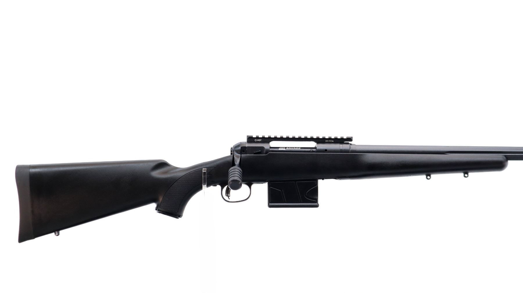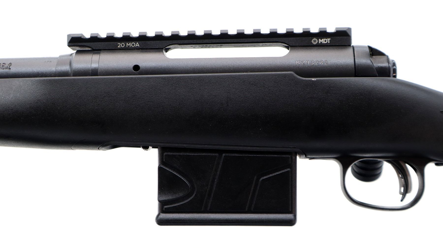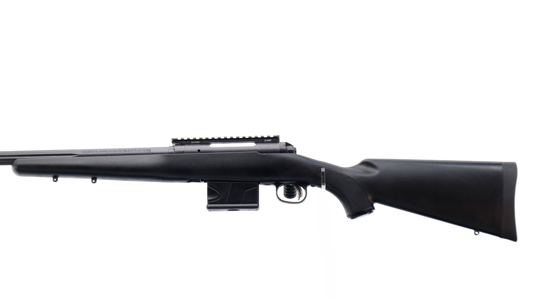 Main Description: No sights, Parkerized metal finish, fluted heavy barrel threaded at muzzle with cap, receiver drilled and tapped with one piece MDT 20MOA base installed, large checkered bolt knob, tang safety. One piece black synthetic stock, wide forearm, checkered pistol grip, black rubber recoil pad, grip cap, accu trigger, 3 swivel studs.