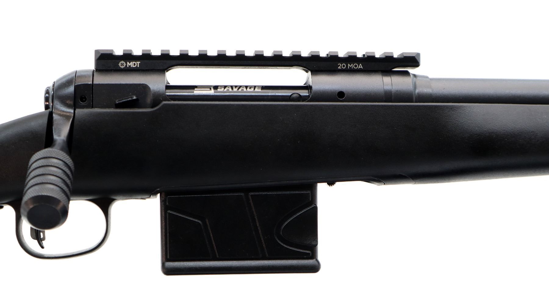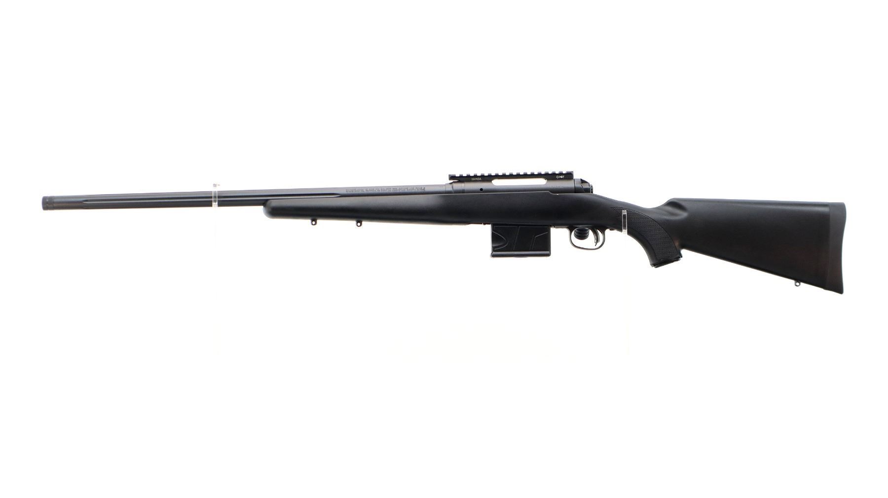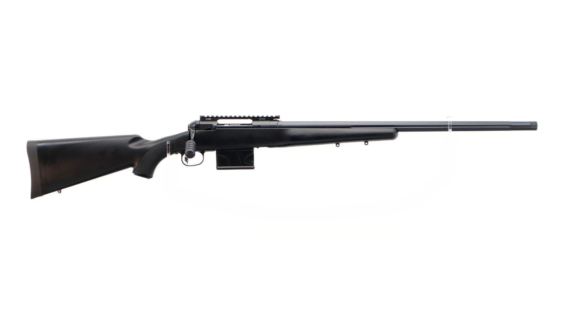 Main Description: No sights, Parkerized metal finish, fluted heavy barrel threaded at muzzle with cap, receiver drilled and tapped with one piece MDT 20MOA base installed, large checkered bolt knob, tang safety. One piece black synthetic stock, wide forearm, checkered pistol grip, black rubber recoil pad, grip cap, accu trigger, 3 swivel studs.