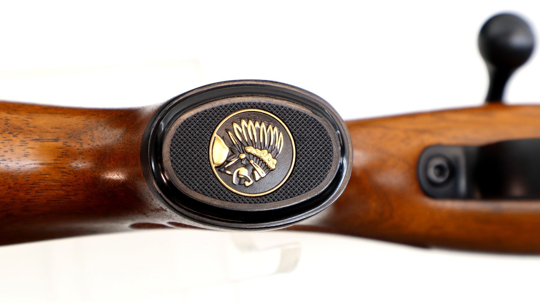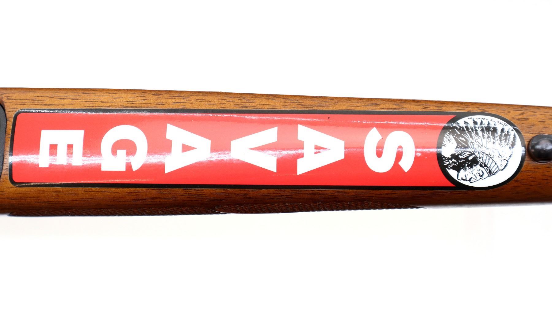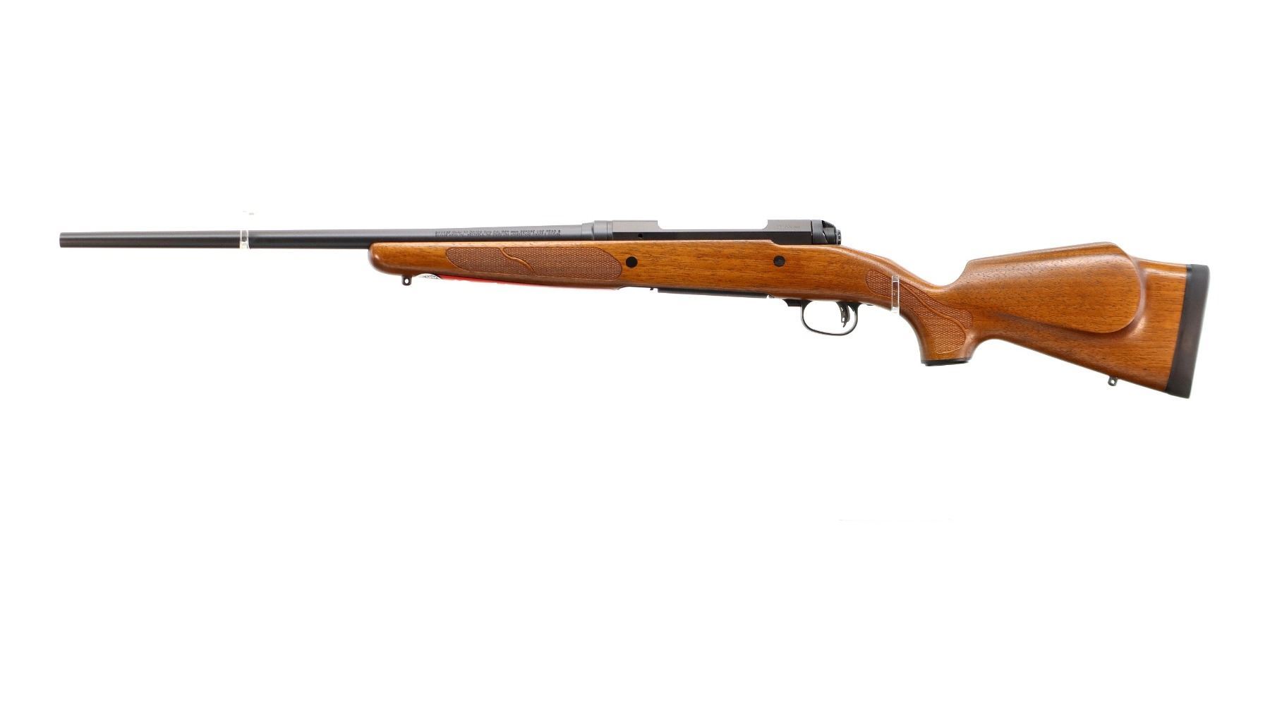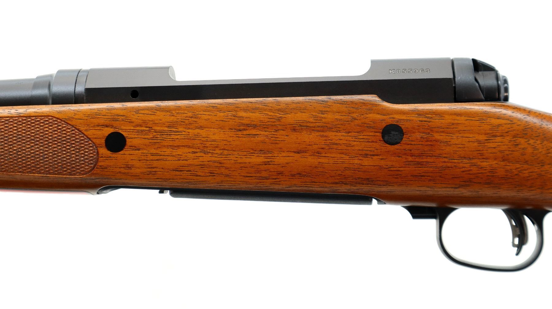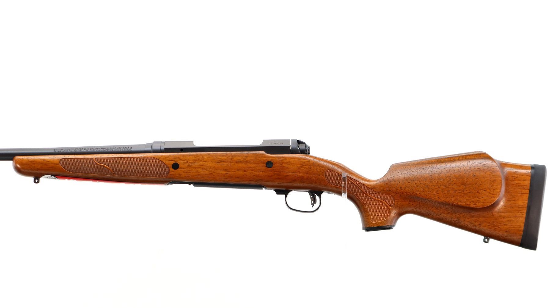 Main Description: No sights, Parkerized metal finish, receiver drilled and tapped with no plug screws installed, jewelled bolt with checkered knob, tang safety. One piece wood stock, checkered forearm and pistol grip, rollover cheek rest, black rubber recoil pad, 12.75" LOP, grip cap, swivel studs, retains factory stickers.