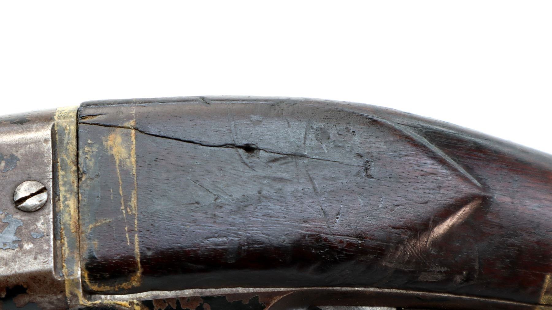 Main Description: Manufactured 1907. Blade front sight, missing rear sight dovetail present, half octagon and round barrel, square cocking indicator, tang drilled and tapped with only one plug screw installed. Two piece wood stocks, forearm is chipped, cracked and broken, straight grip, chipped, cracked and broken behind receiver, smooth curved steel butt plate, stock and plate chipped and broken at toe.
