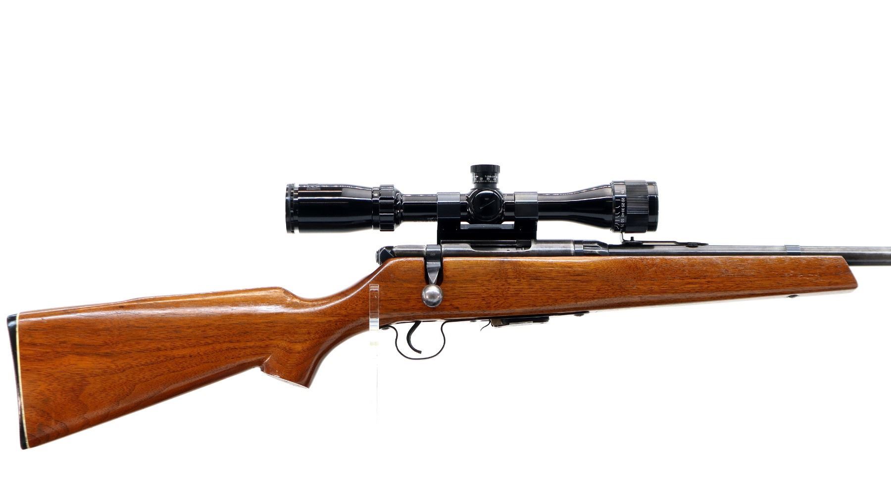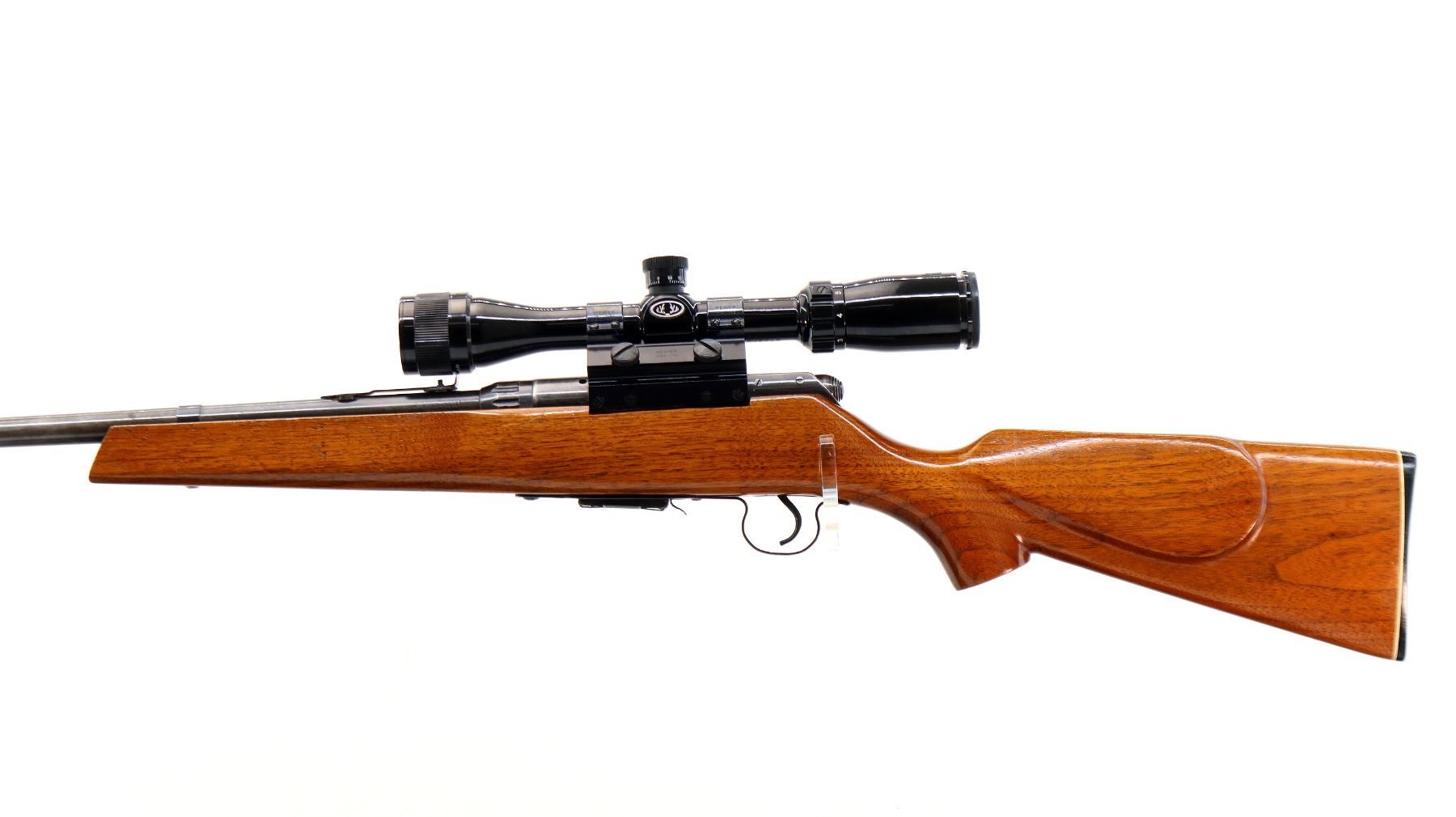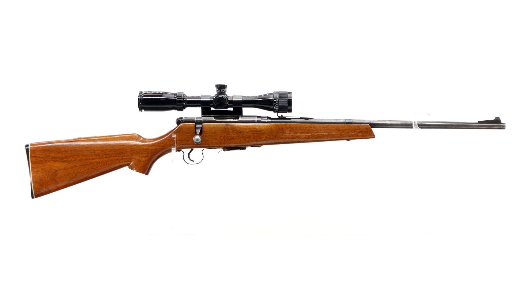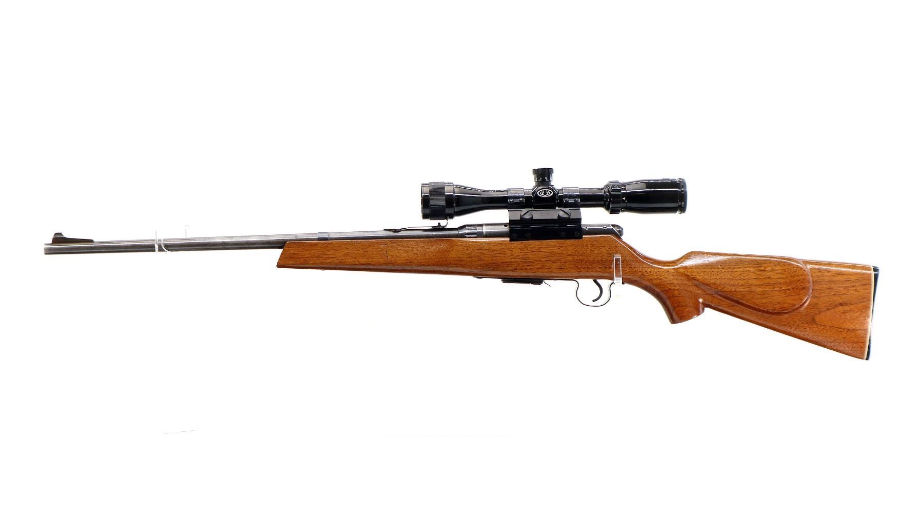 Main Description: Blade front sight with ramp, adjustable u notched rear sight, receiver drilled and tapped with Weaver mount and Bushnell 3-9x32 AO scope installed, clear optics with duplex crosshair. One piece wood stock, pistol grip, cheek rest, checkered black polymer butt plate, missing grip cap.
