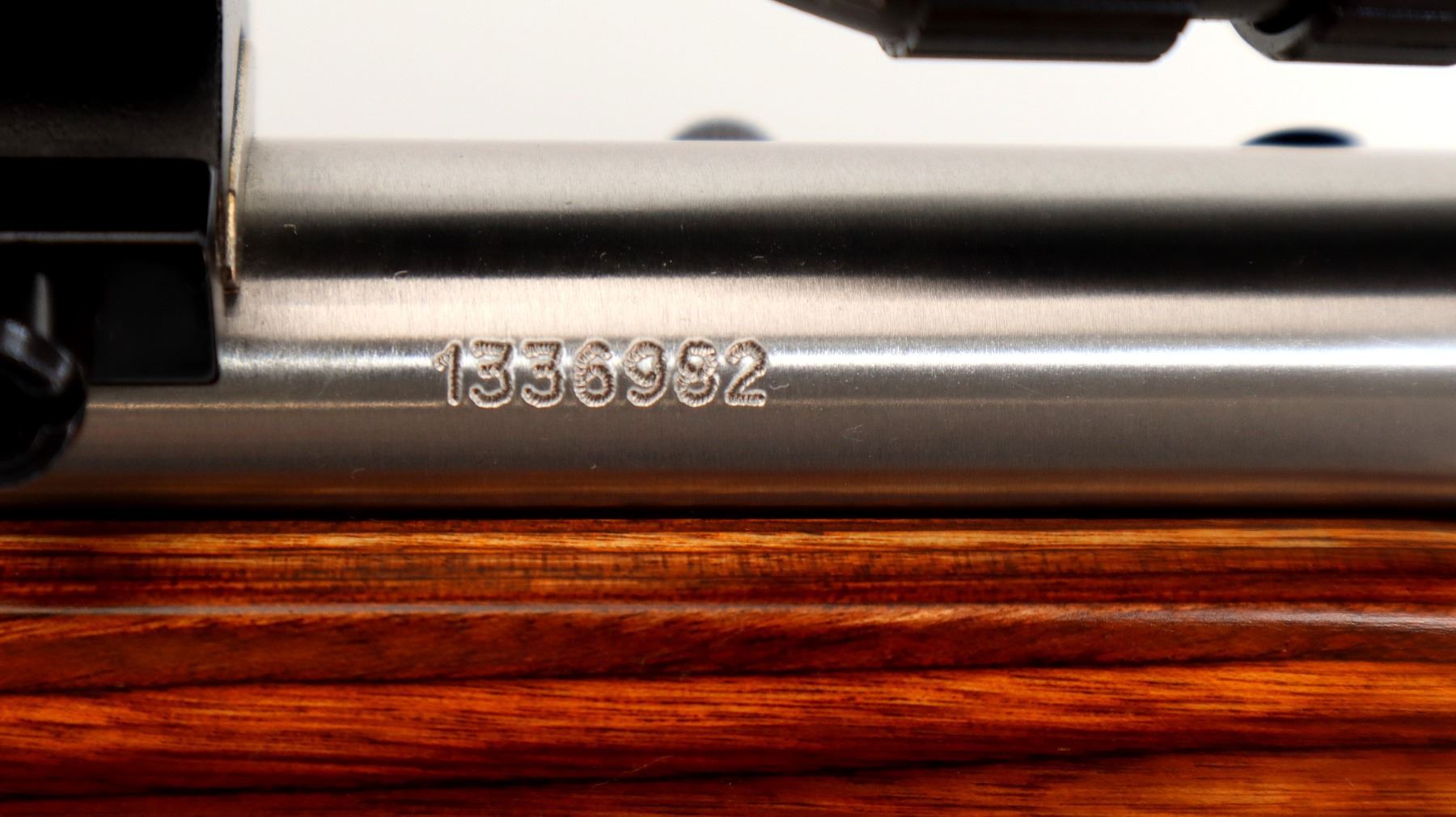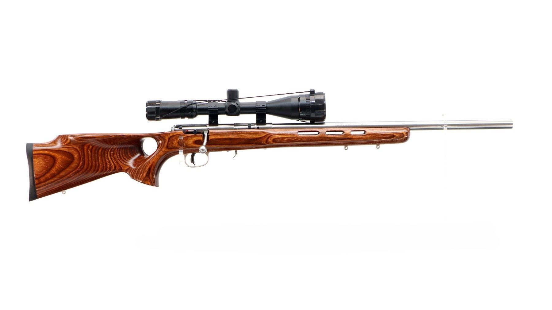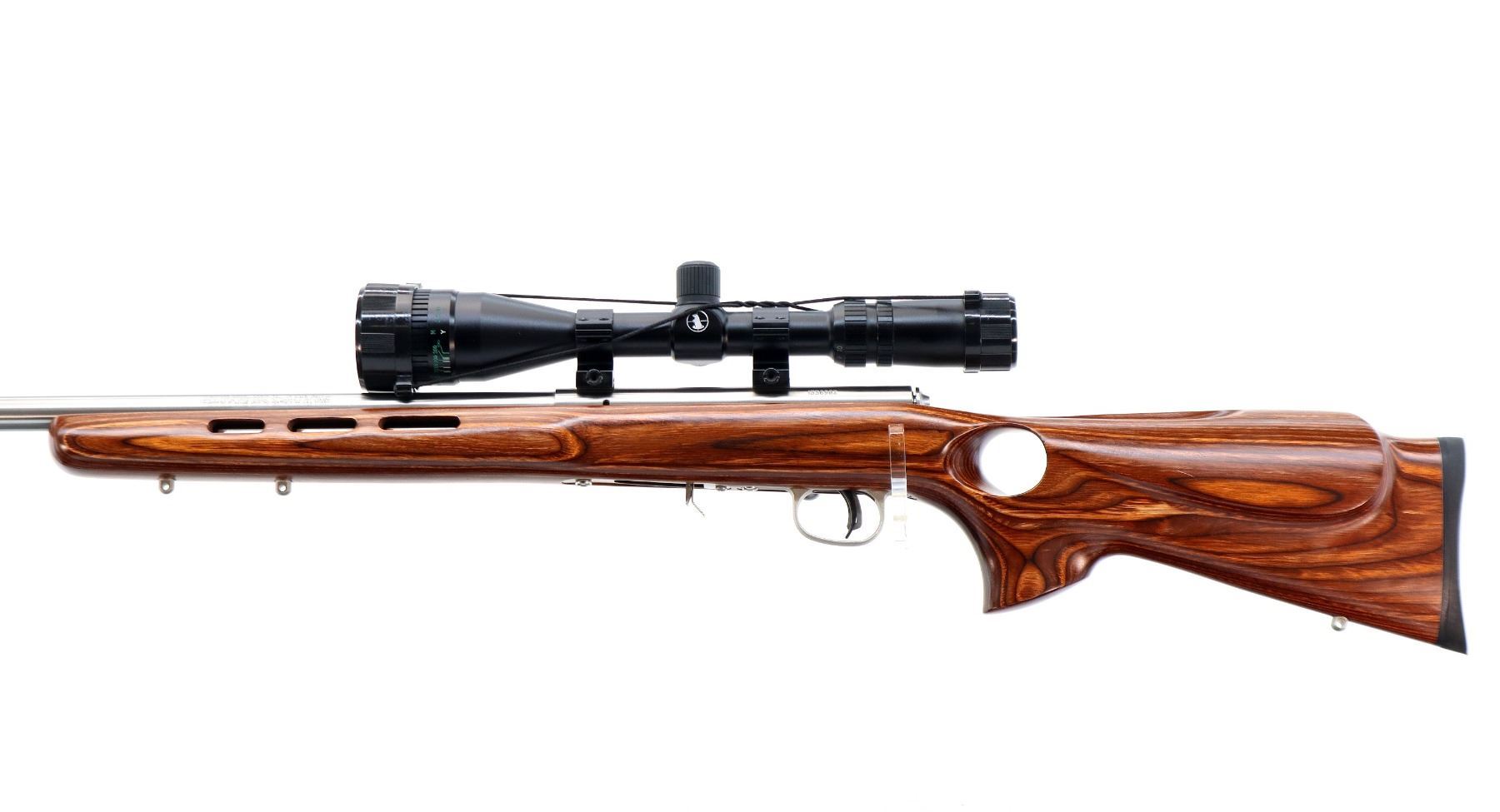 Main Description: No sights, stainless finish, heavy barrel, receiver drilled and tapped with Tasco 2.5-10x40 AO scope installed, clear optics, duplex crosshair with dots. One piece brown laminate wood target stock, wide ventilated forearm, thumb hole pistol grip, cheek rest, black rubber recoil pad, accu trigger, three swivel studs.