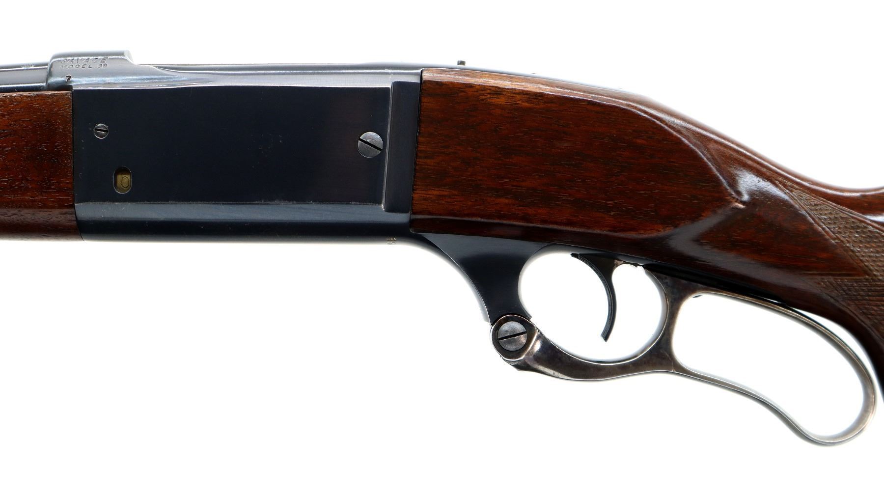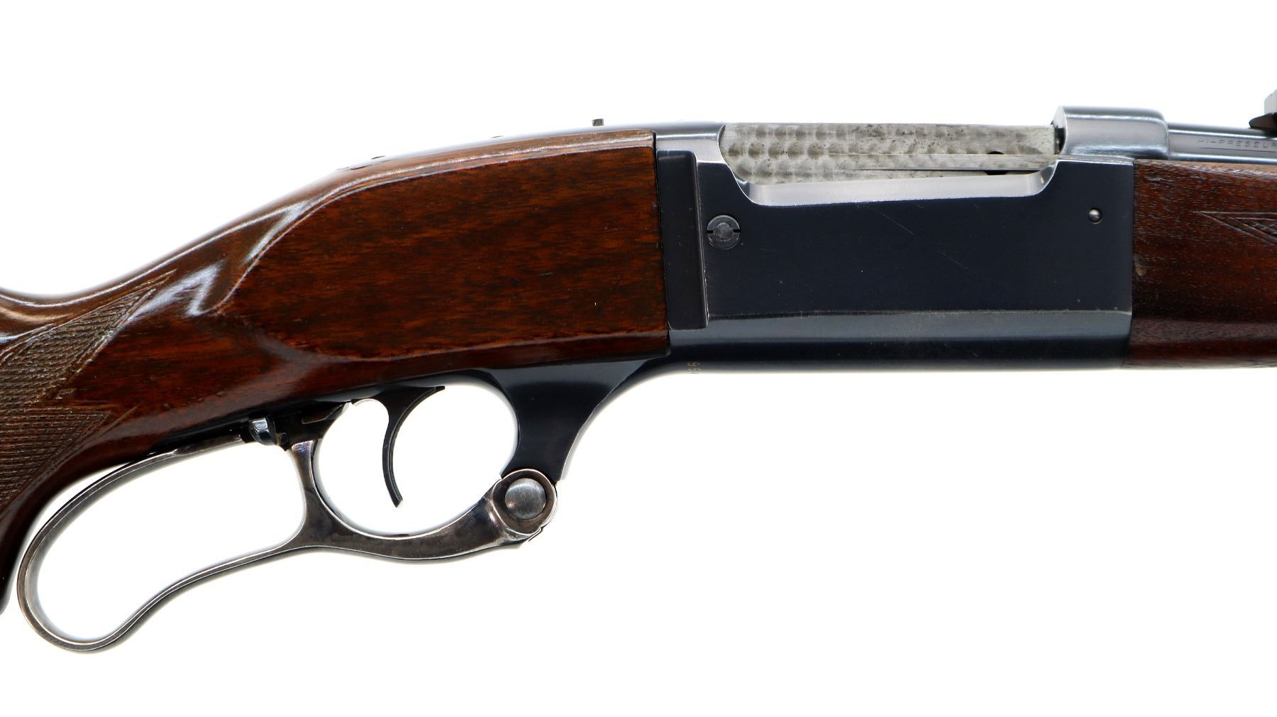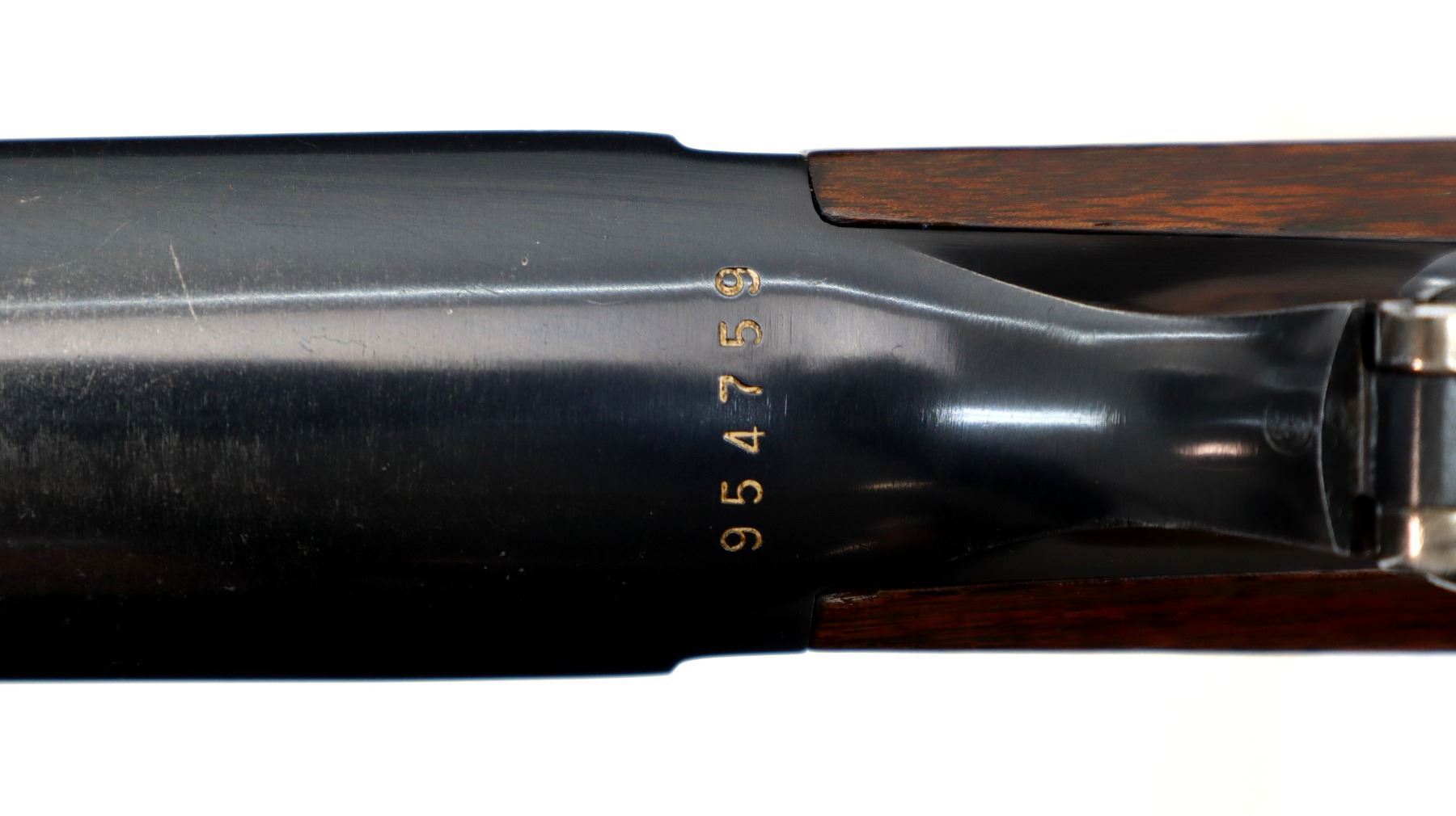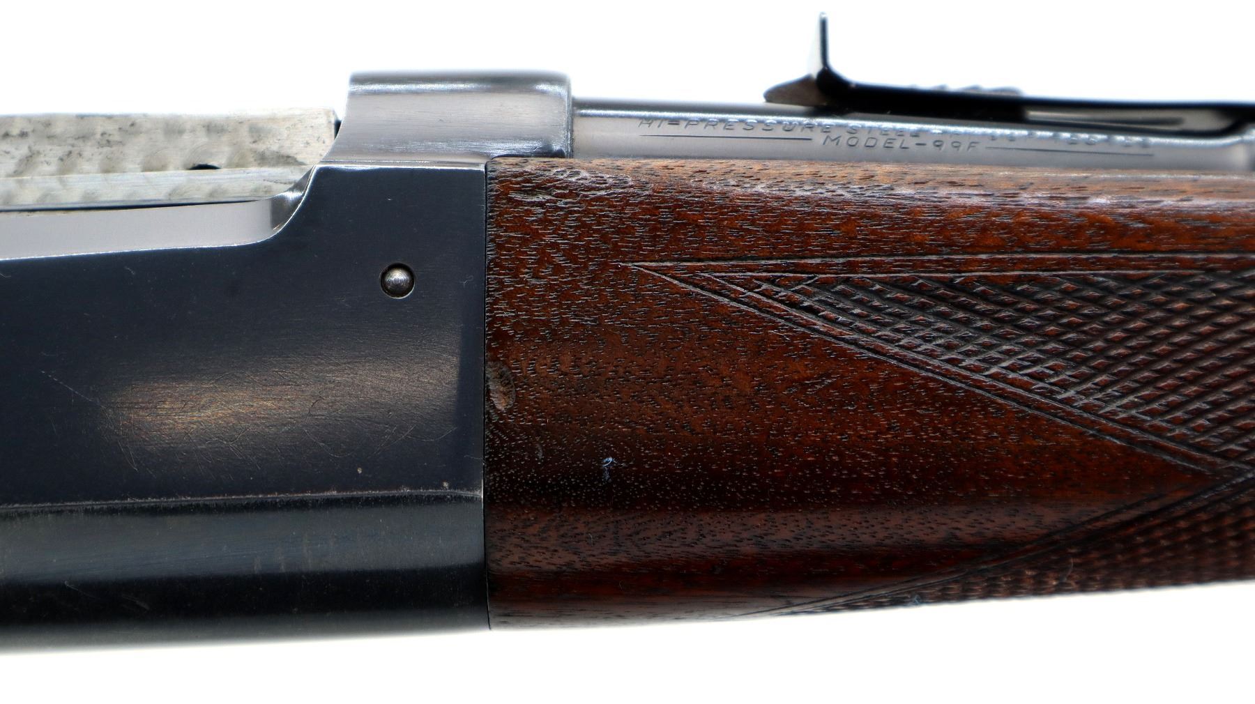 Main Description: Blade front sight with ramp, adjustable u notched rear sight, polish blued finish, receiver drilled and tapped with plug screws installed, jewelled bolt, cocking indicator, colour case hardened lever. Two piece wood stocks, checkered forearm and pistol grip, red rubber recoil pad which is damaged, 13.5" LOP, grip cap, sling swivels.