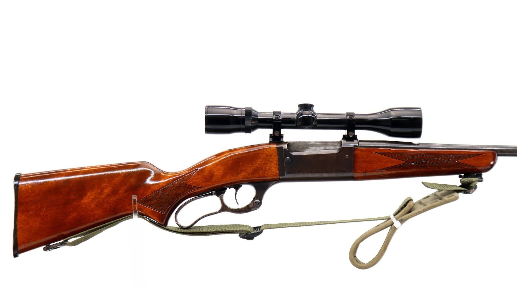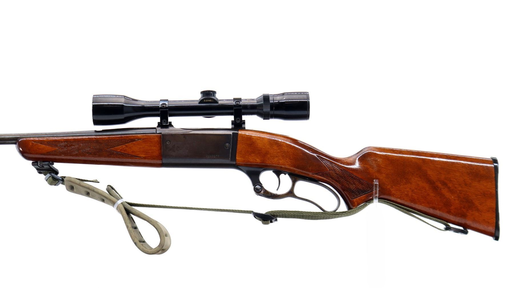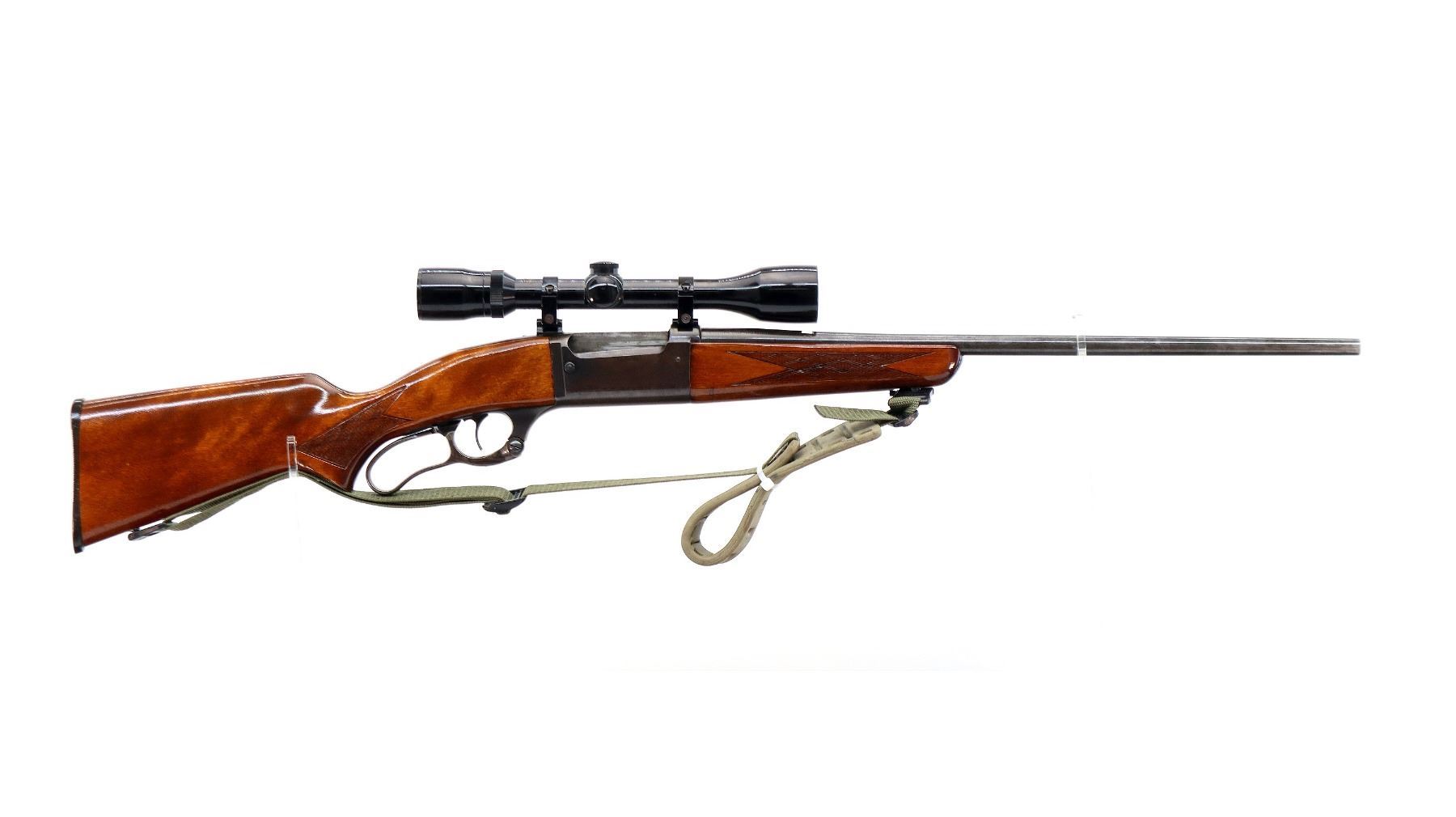 Main Description: Missing front sight, threaded hole present, no rear sight, dovetail present, receiver drilled and tapped with Bushnell Scopechief VI WA 2.5x40 scope installed, clear optics with duplex crosshair. Cocking indicator. Two piece wood stocks, checkered forearm and pistol grip, grooved black polymer butt plate, 13.25" LOP, colour case hardened lever, pistol grip chipped at bottom, sling swivels with green nylon sling.