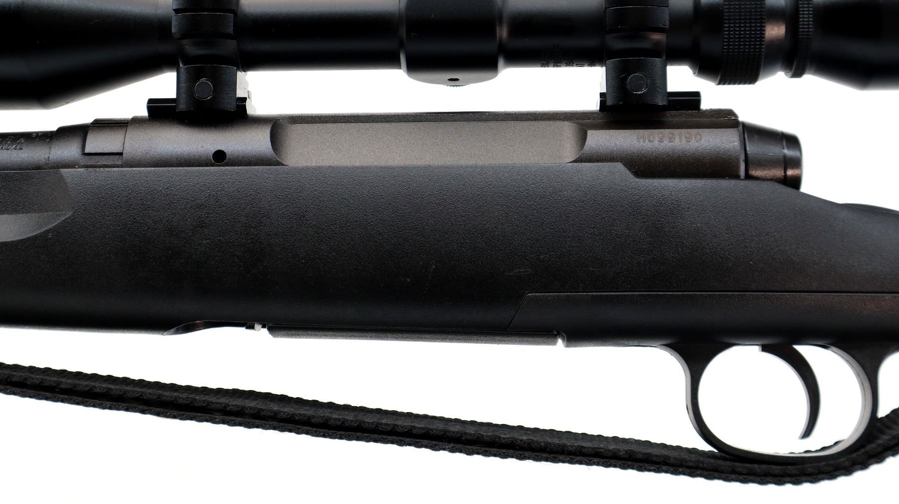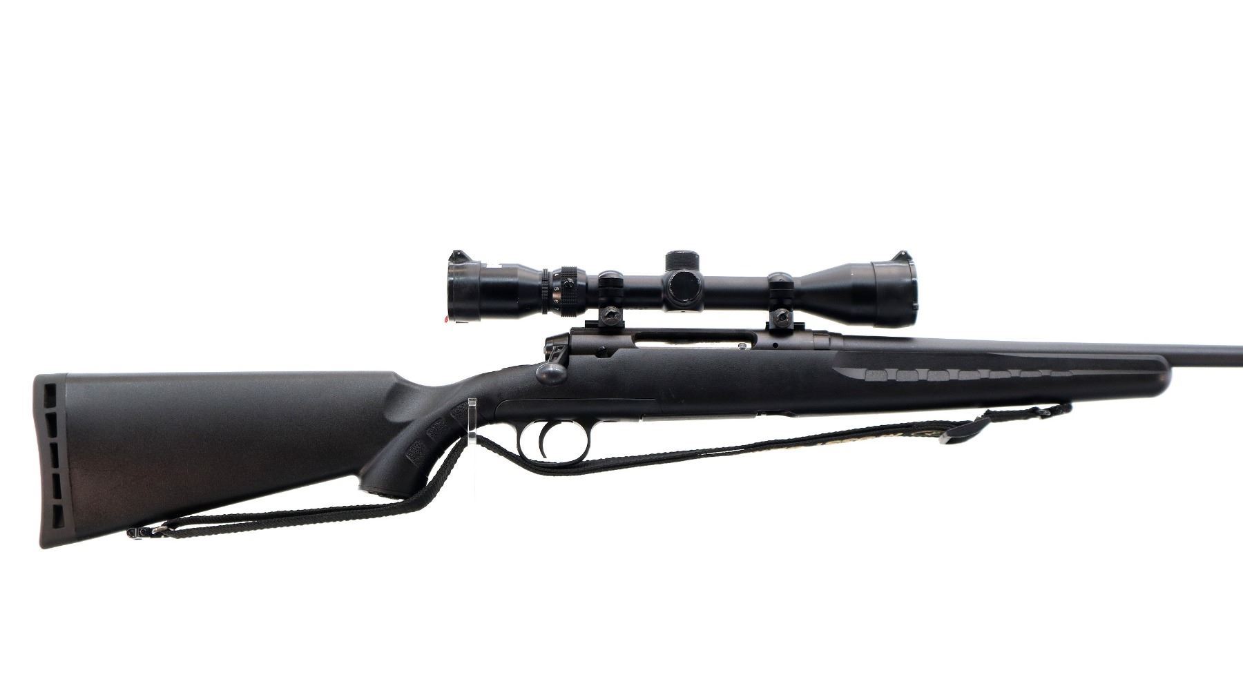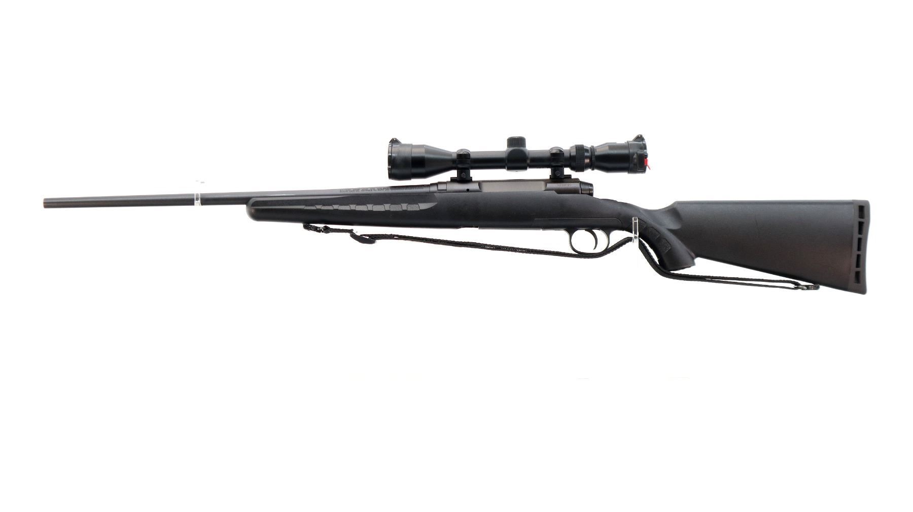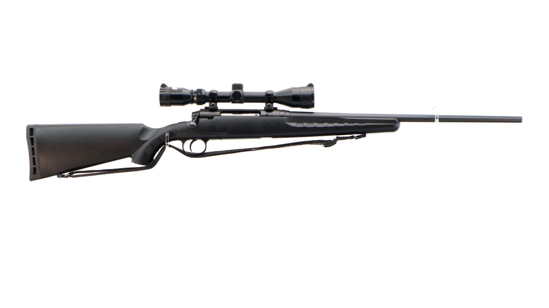 Main Description: No sights, Parkerized metal finish, receiver drilled and tapped with Bushnell 3-9x40 scope installed with duplex crosshair, tang safety. One piece black synthetic stock, textured forearm and pistol grip panels, black vented rubber recoil pad, grip cap, non accu trigger, sling swivels with black nylon sling.