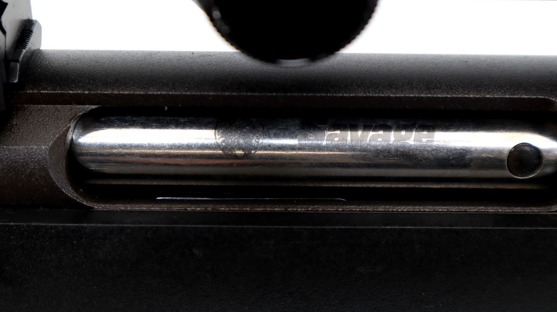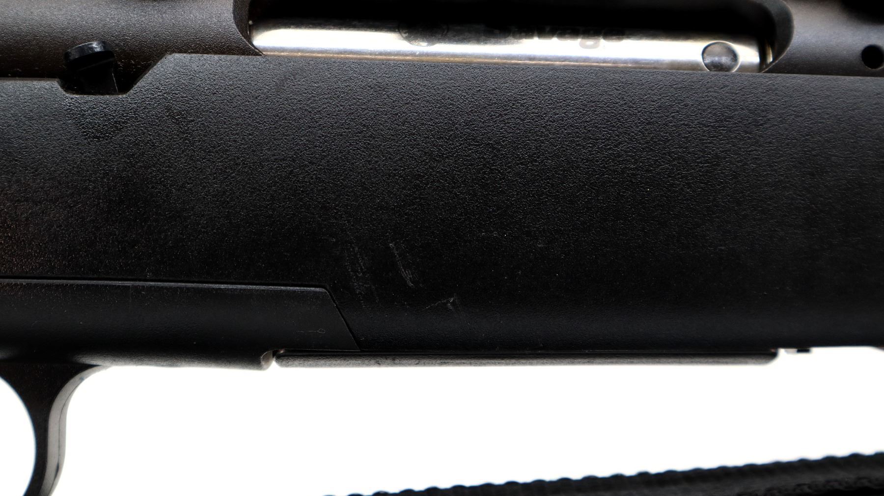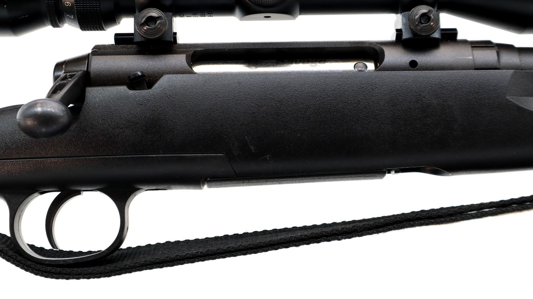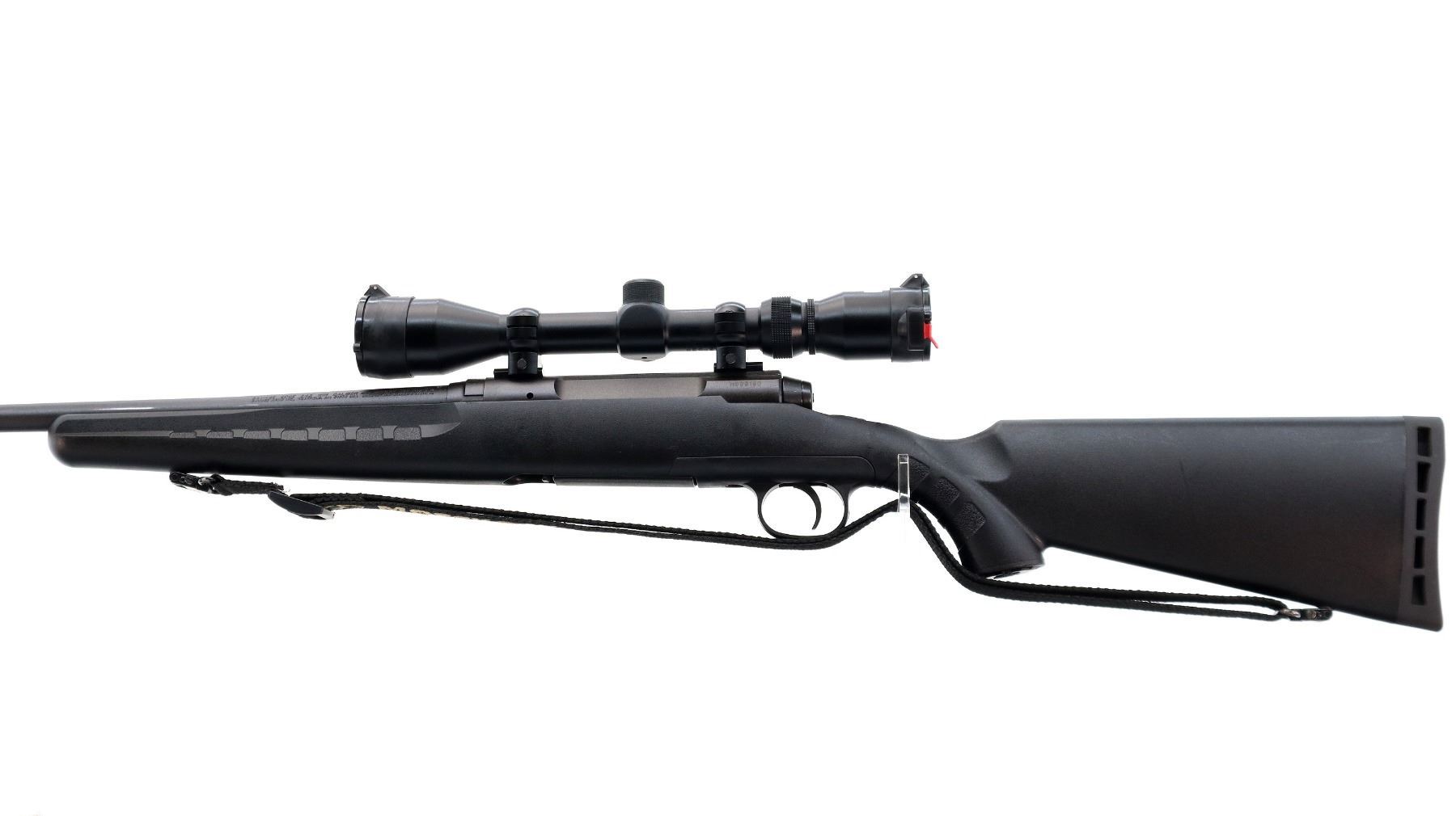 Main Description: No sights, Parkerized metal finish, receiver drilled and tapped with Bushnell 3-9x40 scope installed with duplex crosshair, tang safety. One piece black synthetic stock, textured forearm and pistol grip panels, black vented rubber recoil pad, grip cap, non accu trigger, sling swivels with black nylon sling.