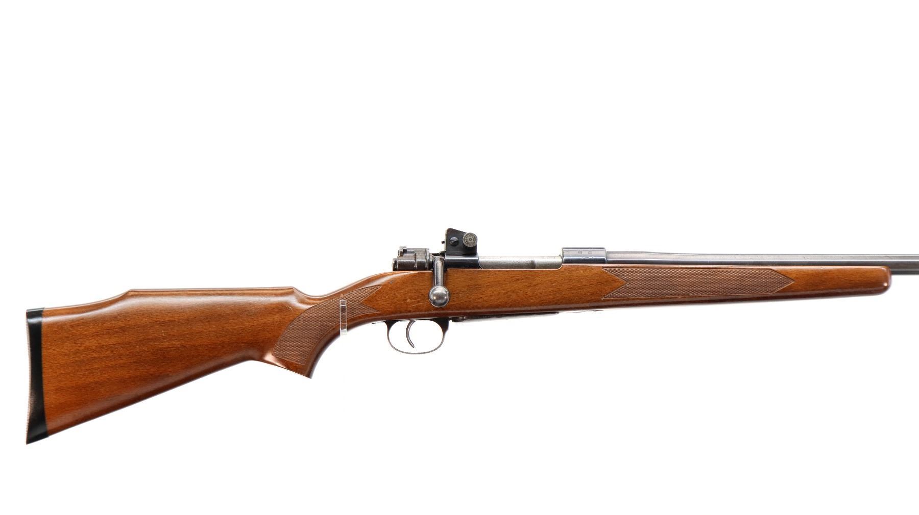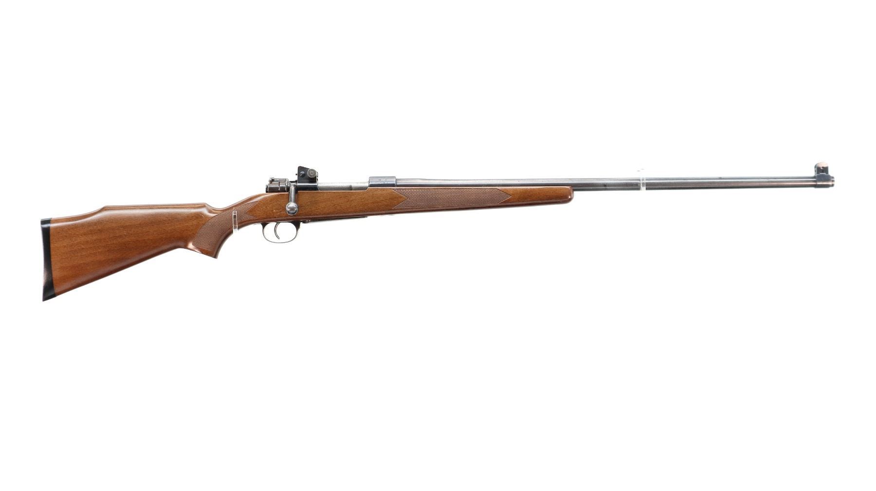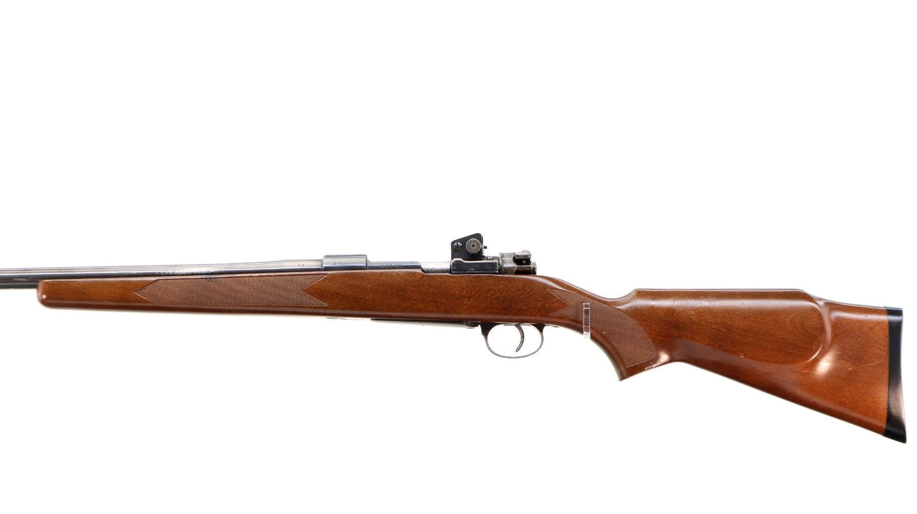 Main Description: Manufactured from a WWII German S/243 1936 dated K98 receiver with Mismatched serial numbers. Blade front sight with ears and ramp, adjustable rear peep sight, blued finish, heavy barrel, turned down bolt handle. One piece sporter wood stock, checkered forearm, pistol grip and black polymer butt plate, cheek rest.