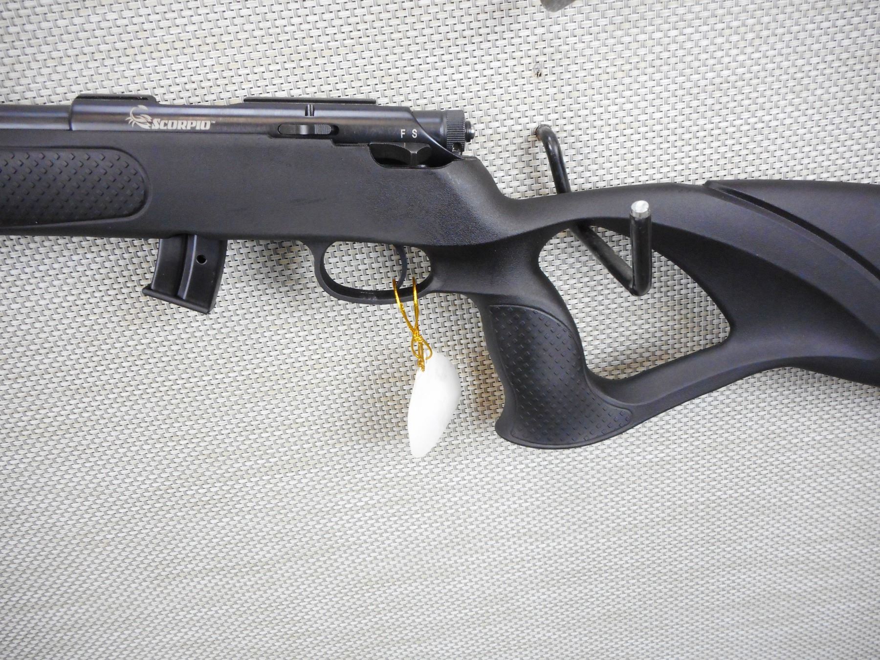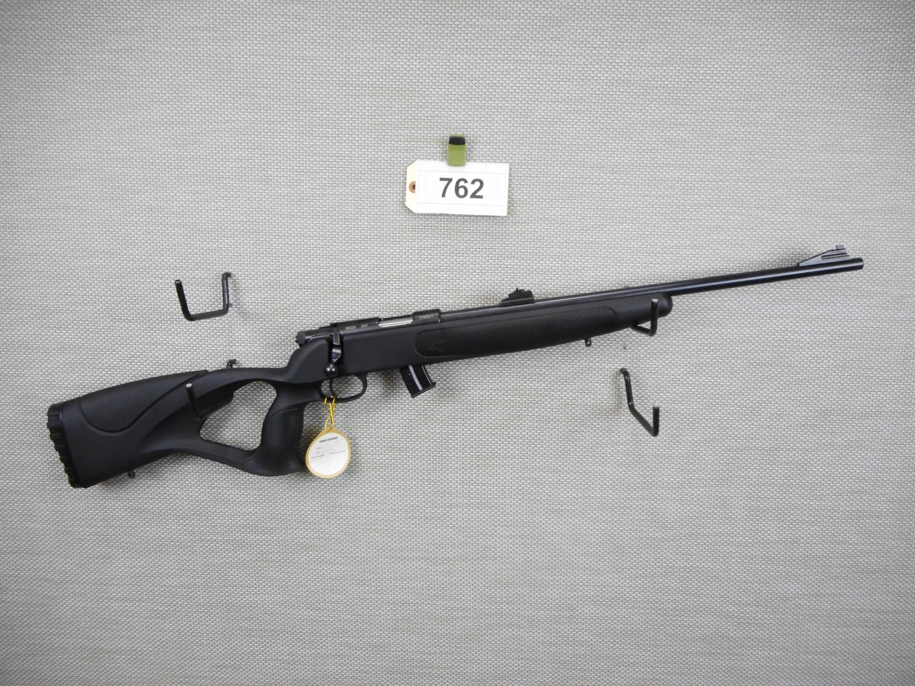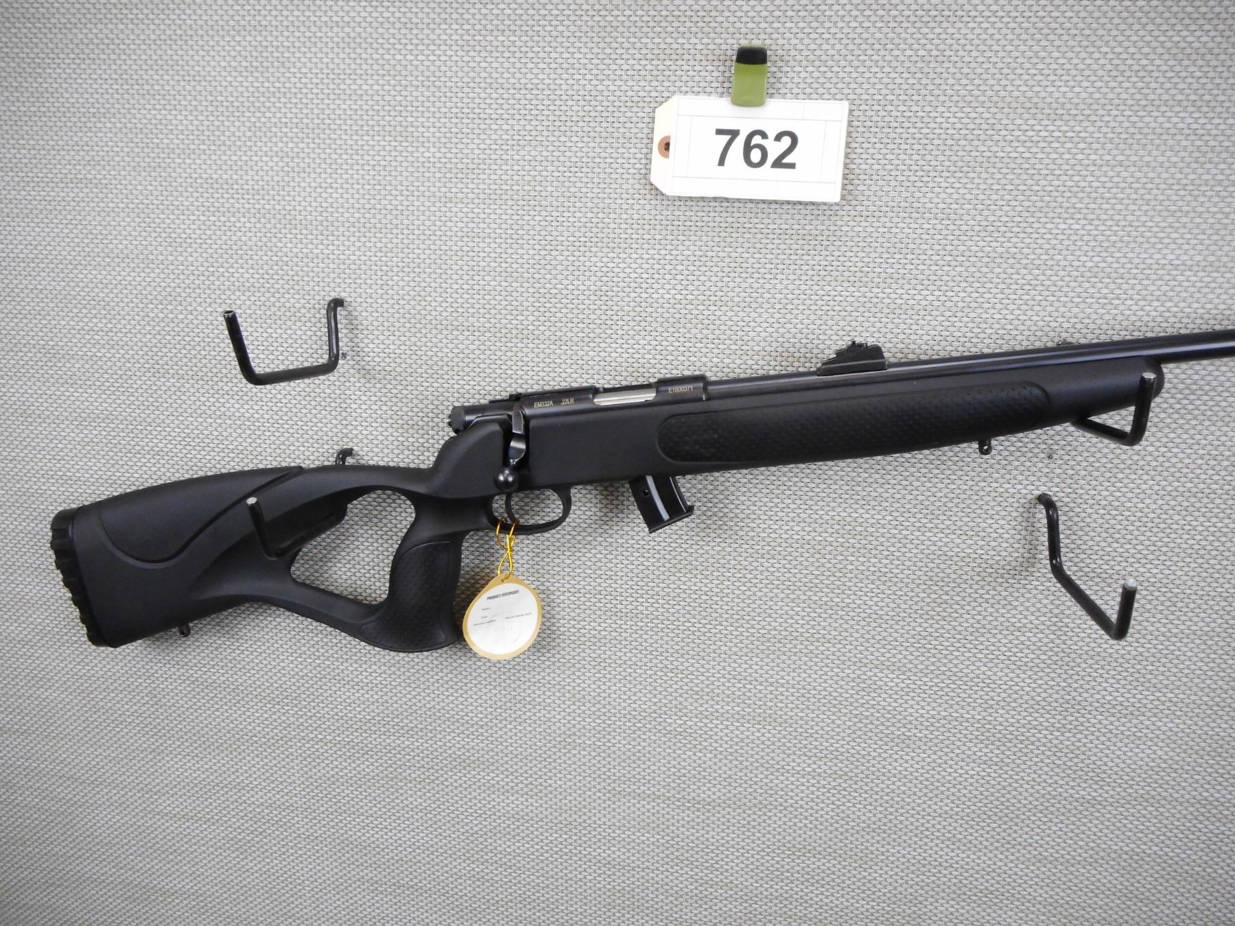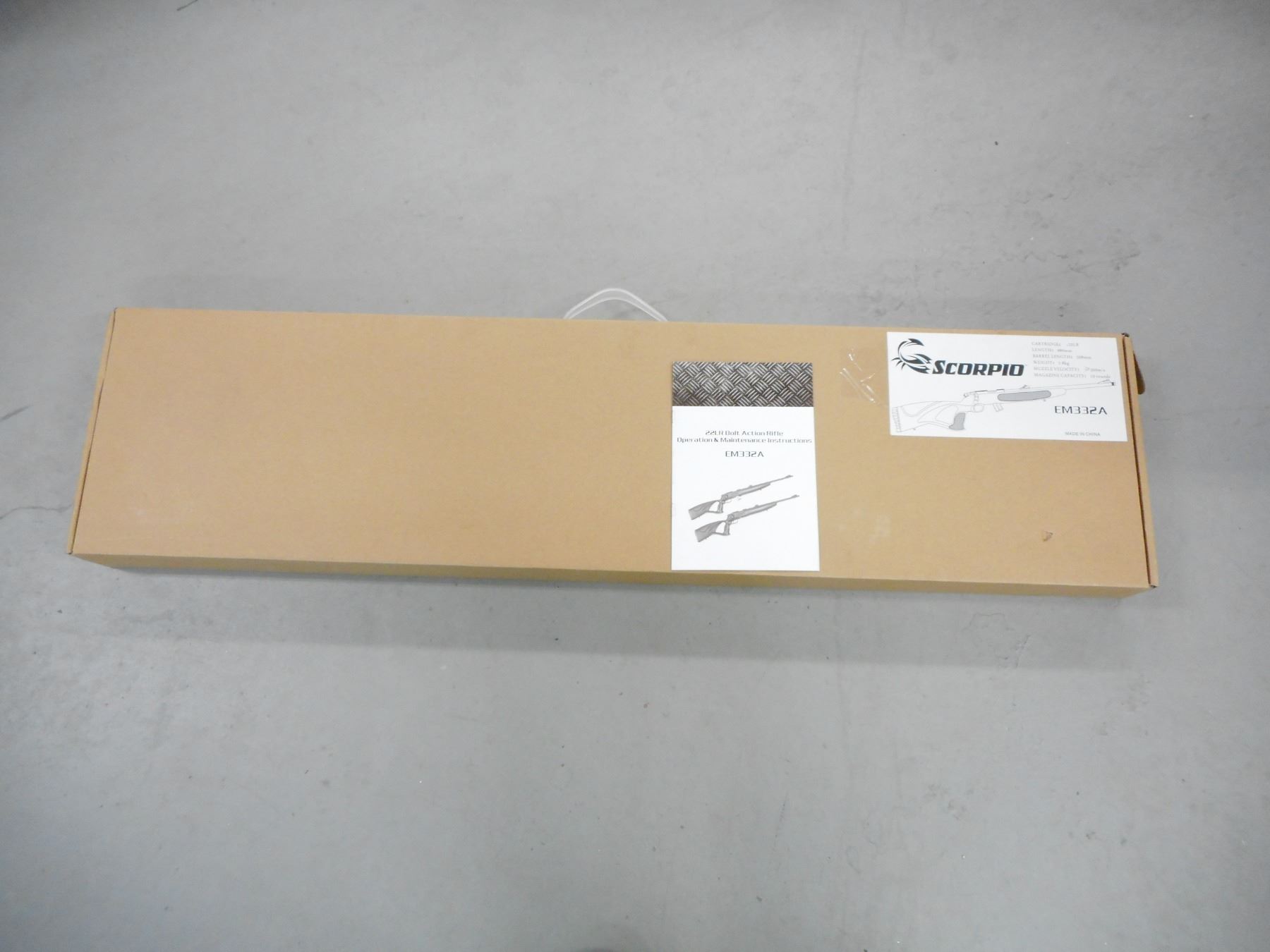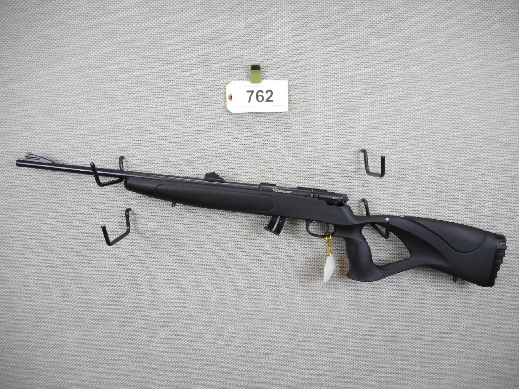 SCORPIO , MODEL: EM332A , CALIBER: 22 LR , COMES IN A BOX WITH A MAGAZINE AND A MANUAL, RAISED FRONT AND ADJUSTABLE REAR SIGHTS, SYNTHETIC FULL PISTOL GRIP FULL THUMB HOLE STOCK, SLING SWIVEL LOOPS, RUBBER BUTT PLATE , ACTION: BOLT ACTION RIFLE , BARREL LENGTH:20" , CONDITION: NEW IN THE BOX , SERIAL # E1600371 , CANADIAN CLASS NON RESTRICTED