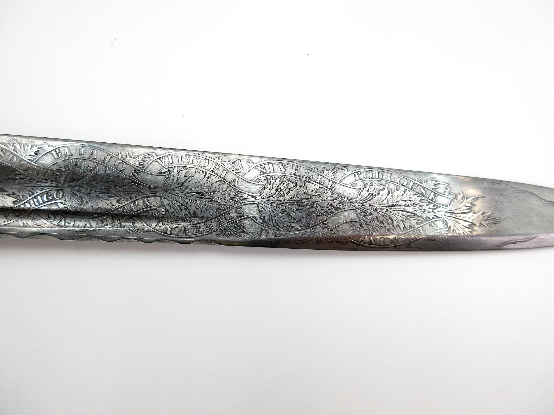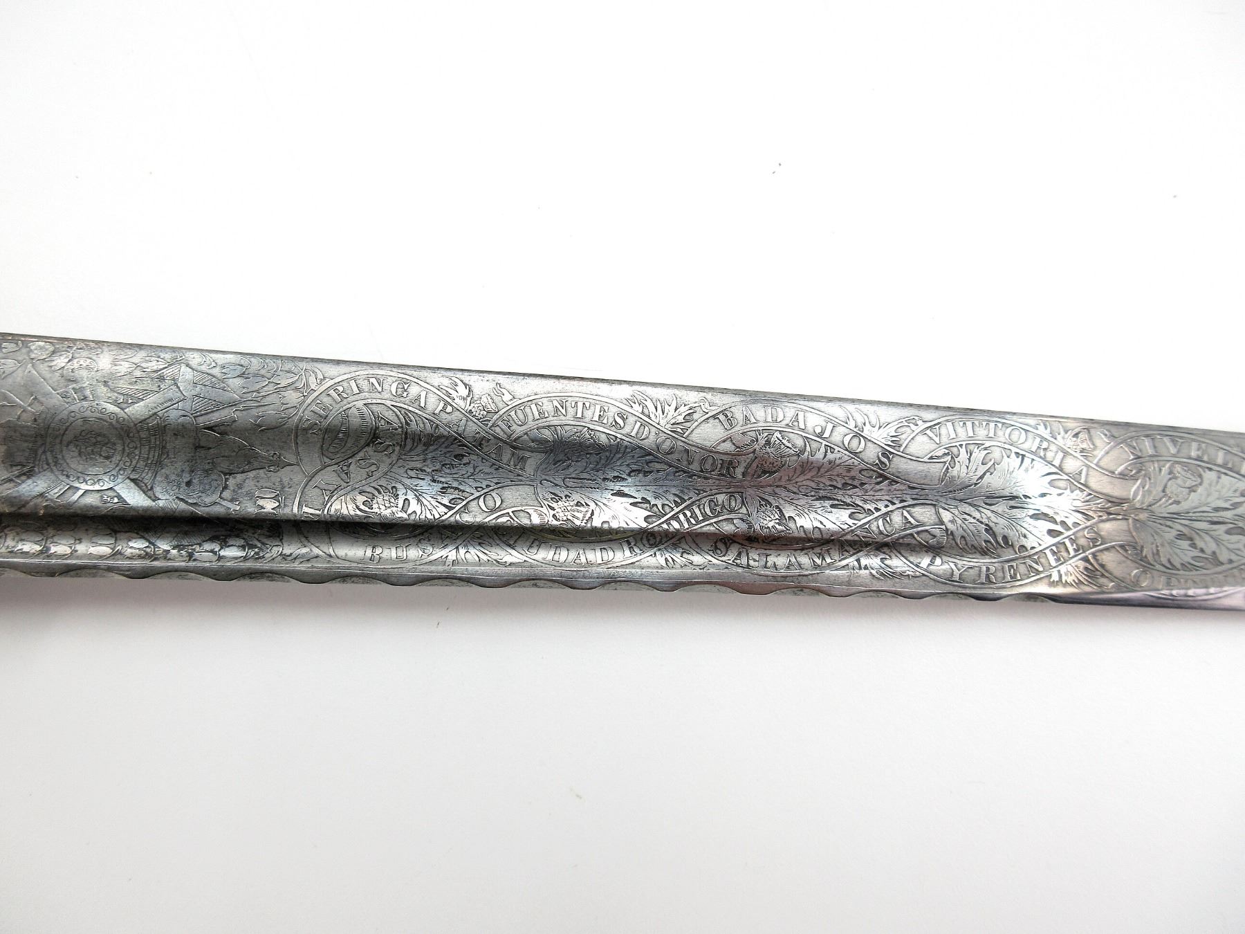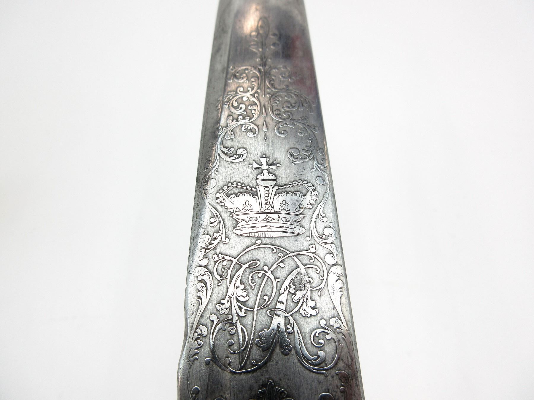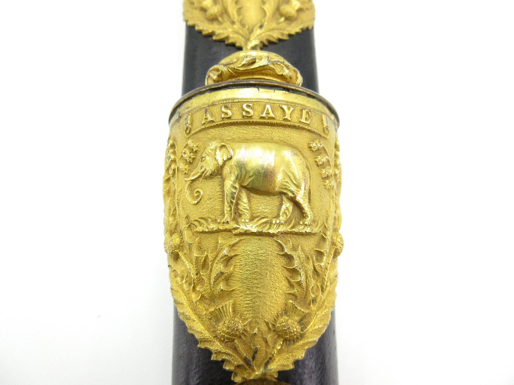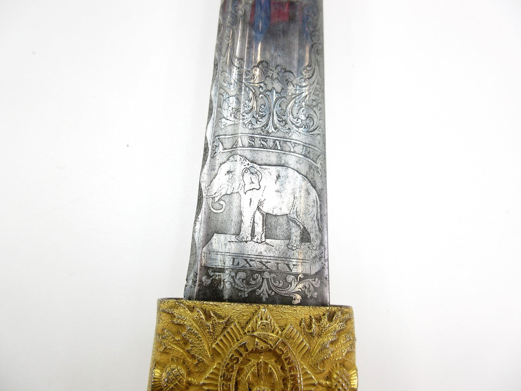 (1) FULLERED ACID ETCHED BLADE, NOTCHED ALONG THE BACK, FALSE DOUBLE EDGE AT THE POINT, BLADE ACID ETCHED VARIOUS NAMES IN BANNERS / THISTLES OVER CREST OVER "WOOLF, &, SON, OLD BOND ST, LONDON", OTHER-SIDE ACID ETCHED: CROWNED VR CYPHER OVER CREST OVER "ASSAYE" OVER ELEPHANT WITH VARIOUS DECORATIVE FLORAL DESIGNS, BRASS PIECE ABOVE GRIP WITH DECORATIVE THISTLES / CREST ON EITHER-SIDE, BLACK BALUSTER GRIP CARVED WITH BASKET WEAVE SET WITH BRASS STUDS, BRASS THISTLE / FLORAL POMMEL WITH GLASS PIECE SET IN THE END, LEATHER & BRASS SCABBARD WITH SMALL FORK / POSSIBLE KNIFE ATTACHED (KNIFE IS STUCK), BRASS SECTIONS MARKED WITH ST. ANDREW CREST, "ASSAYE" OVER ELEPHANT & "74" WITH THISTLE / FLORAL DESIGNS, TWO BELT LOOPS, BLADE APPROX. 11.75", OAL APPROX. 17", FORK OAL APPROX. 5.5". SEE PHOTOS.