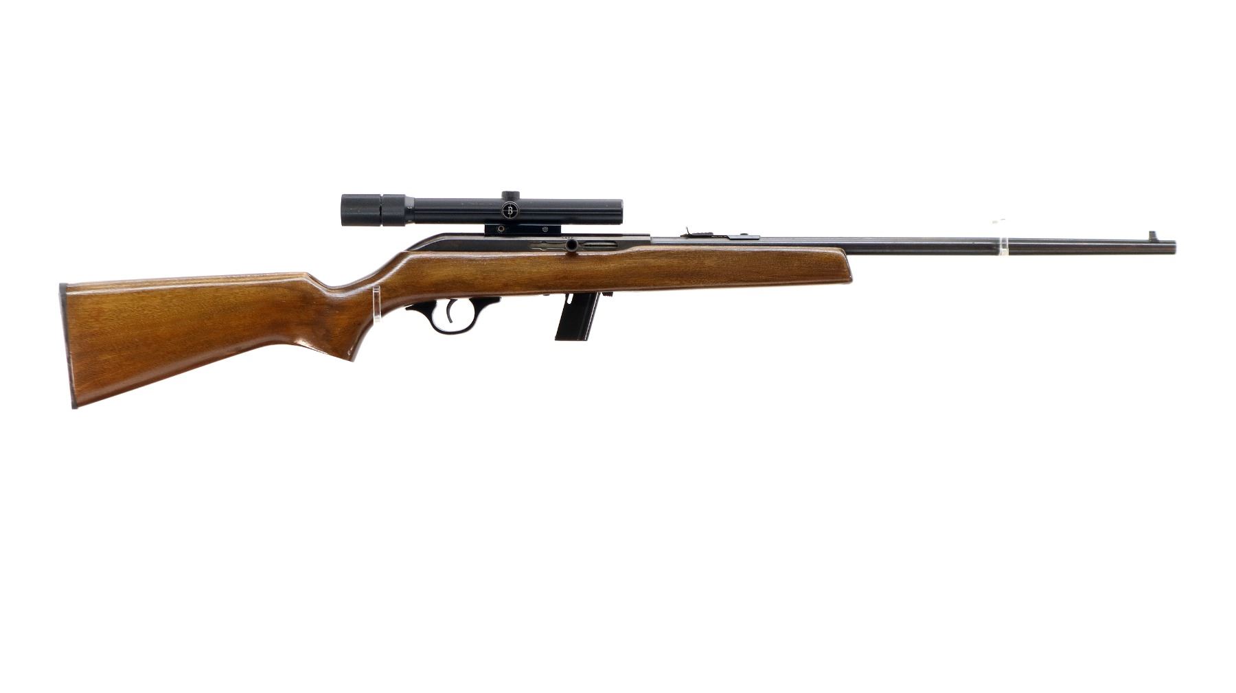 Main Description: Blade front sight, adjustable u notched rear sight, blued finish, grooved receiver with Bushnell 3-8 Scopechief 22 scope installed, clear optics with fine crosshair. One piece wood stock, pistol grip, checkered black polymer butt plate cracked and repaired with replaced screws.