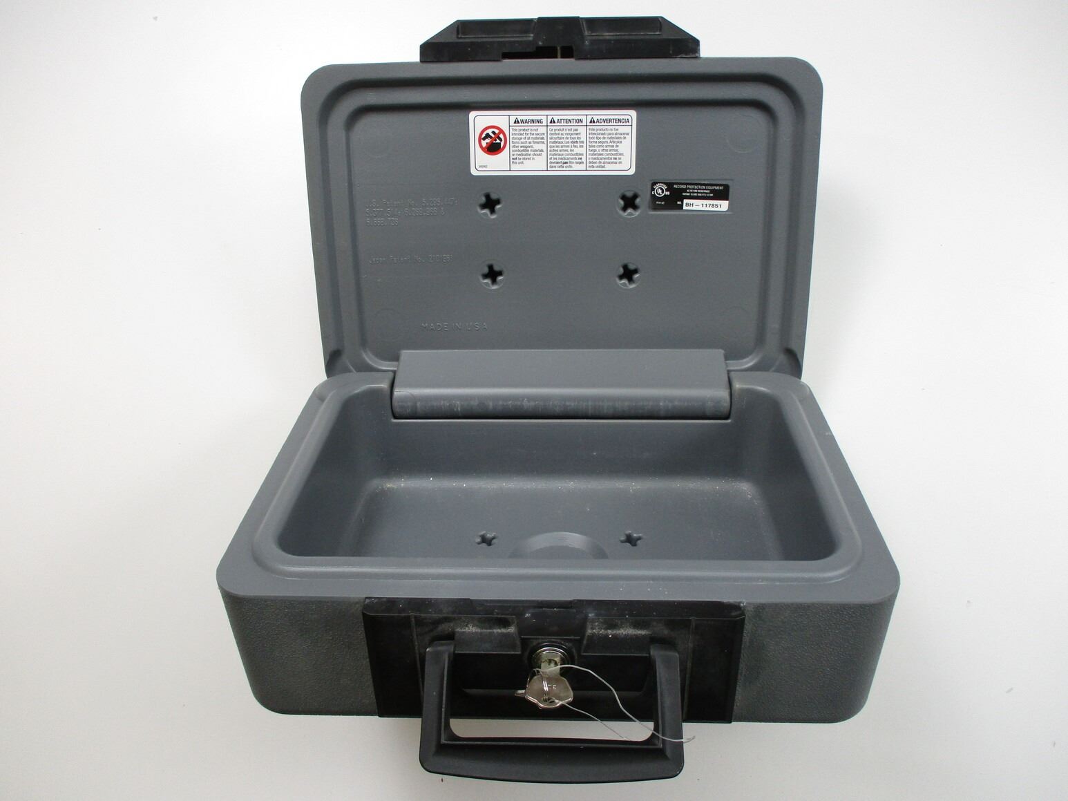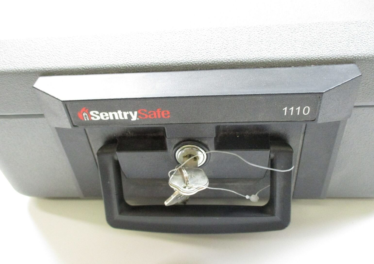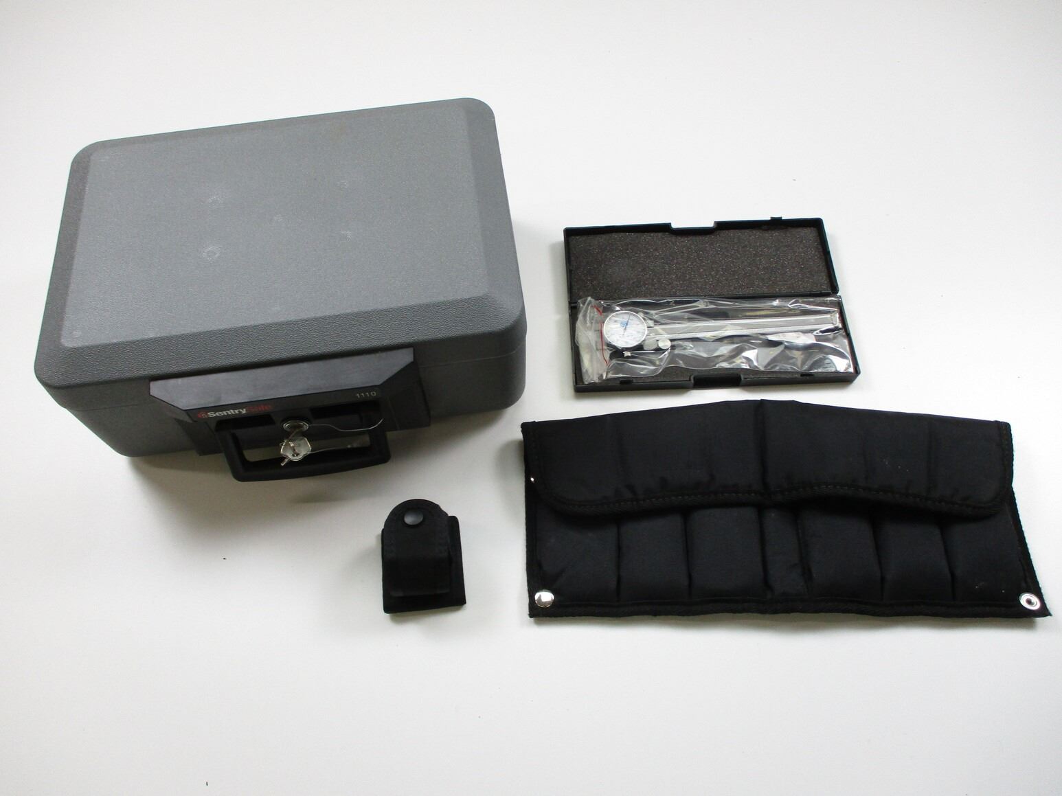 SENTRY SAFE ETC , (1) SENTRY SAFE, MODEL 1110, GREY, APPROX. 14 X 9.75 X 5" OUTER, APPROX. INNER: 11.75 X 7.5 X 2.75", INCLUDES 2 KEYS, WITH WORKINGS LOCK, INCLUDES REVOLVER SPEED LOADER NYLON POUCH, (1) SEMI-AUTO PISTOL MAG POUCH, HOLDS UP TO 6 MAGS, NYLON, (1) NEW DIAL CALIPER.