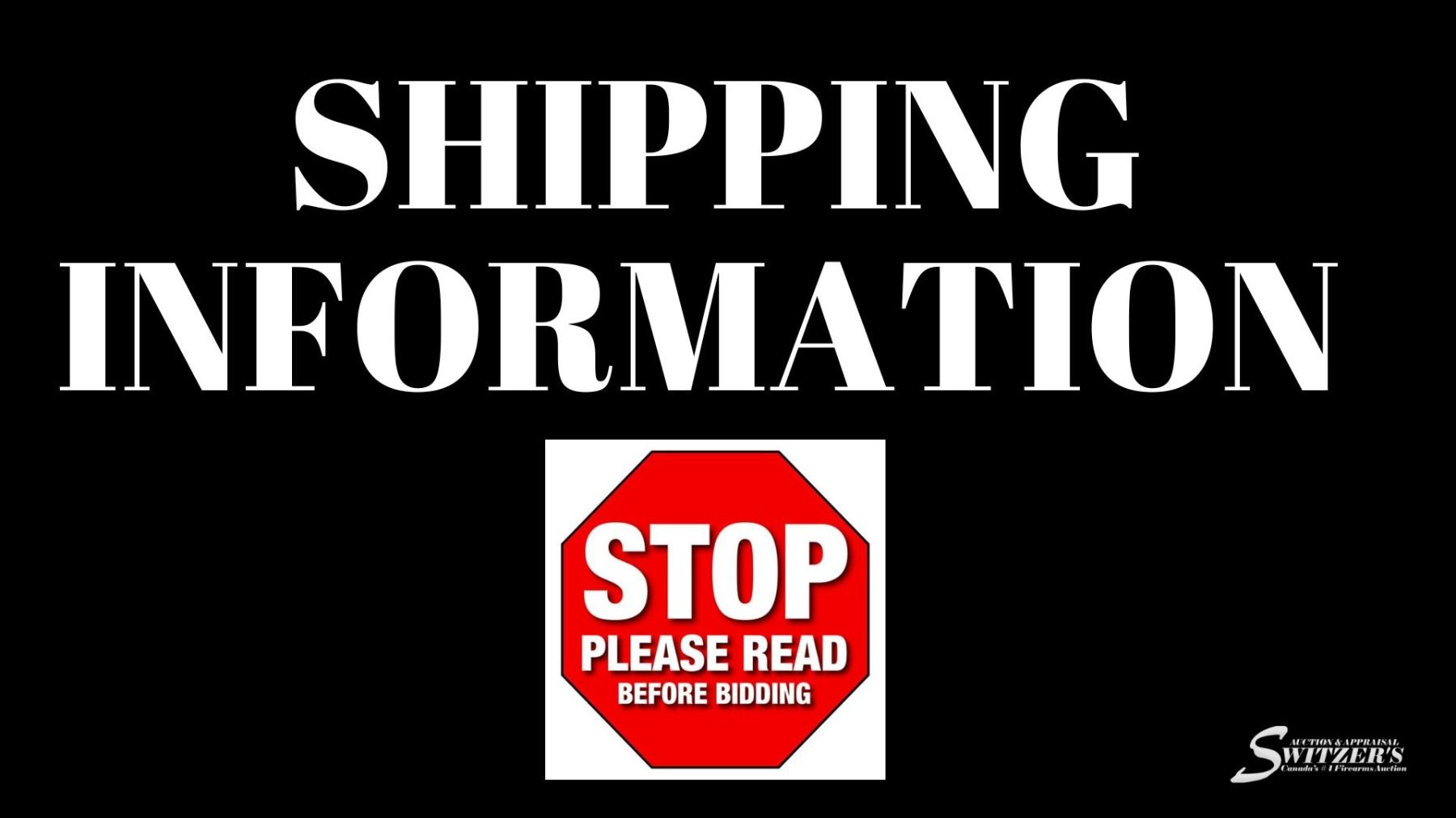 Small items under $100.00 that will fit in an envelope for Canada Post Regulations on Letter Mail, will be charged a flat fee of $10.00 + tax. There will be no insurance and tracking information available on these items. If you require insurance or tracking information, we can ship these in a box. If you prefer your items boxed instead of in an envelope, please email admin@switzersauction.com at the completion of the sale.