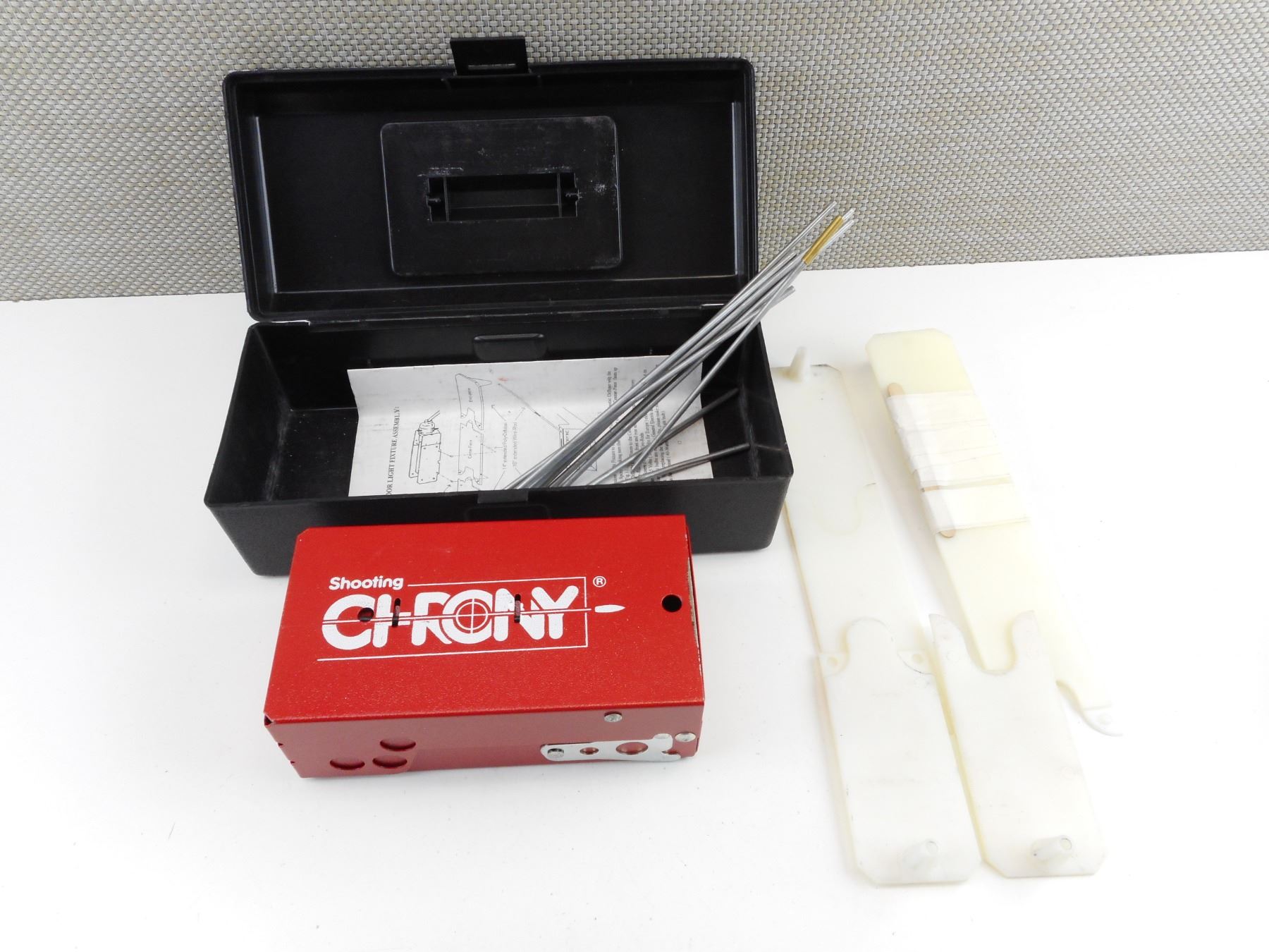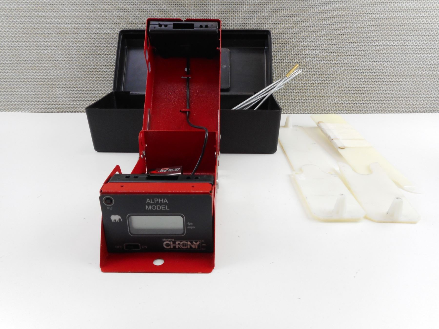SHOOTING CHRONY IN TOOL CASE , FOR MODELS ALPHA SHOOTING CHRONY AND ALPHA MASTER CHRONY. COMES WITH INSTRUCTIONS AND IN TOOL CASE, DIMENSIONS ON CASE APPROX. 12" X 5.5".