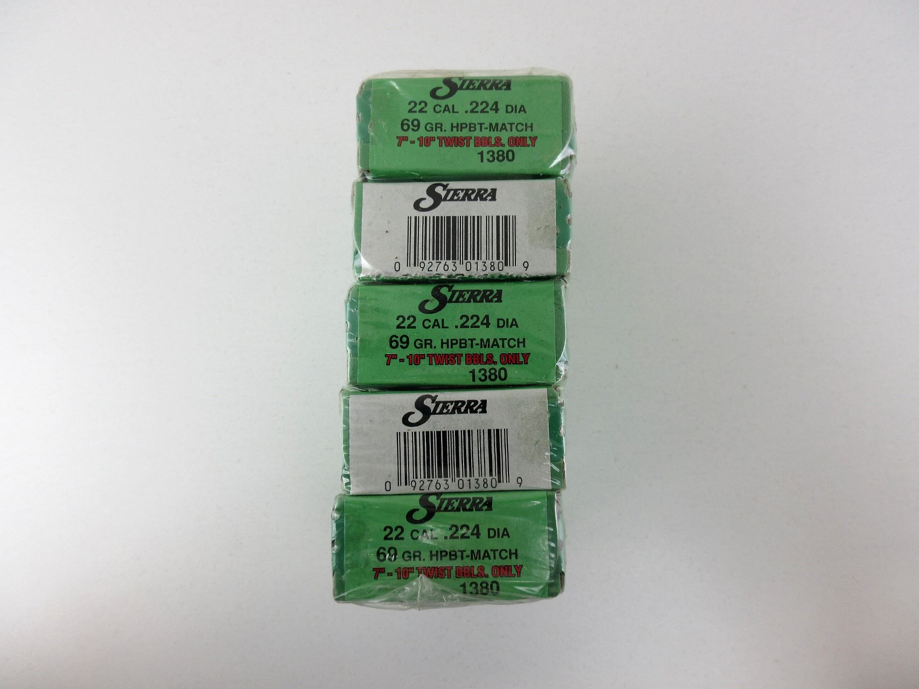 LOT INCLUDES; APPROX. (500) BULLETS, APPROX. DIA .224", 69 GRNS (STATED ON BOXES NOT CONFIRMED) HPBT-MATCH, UNOPENED.