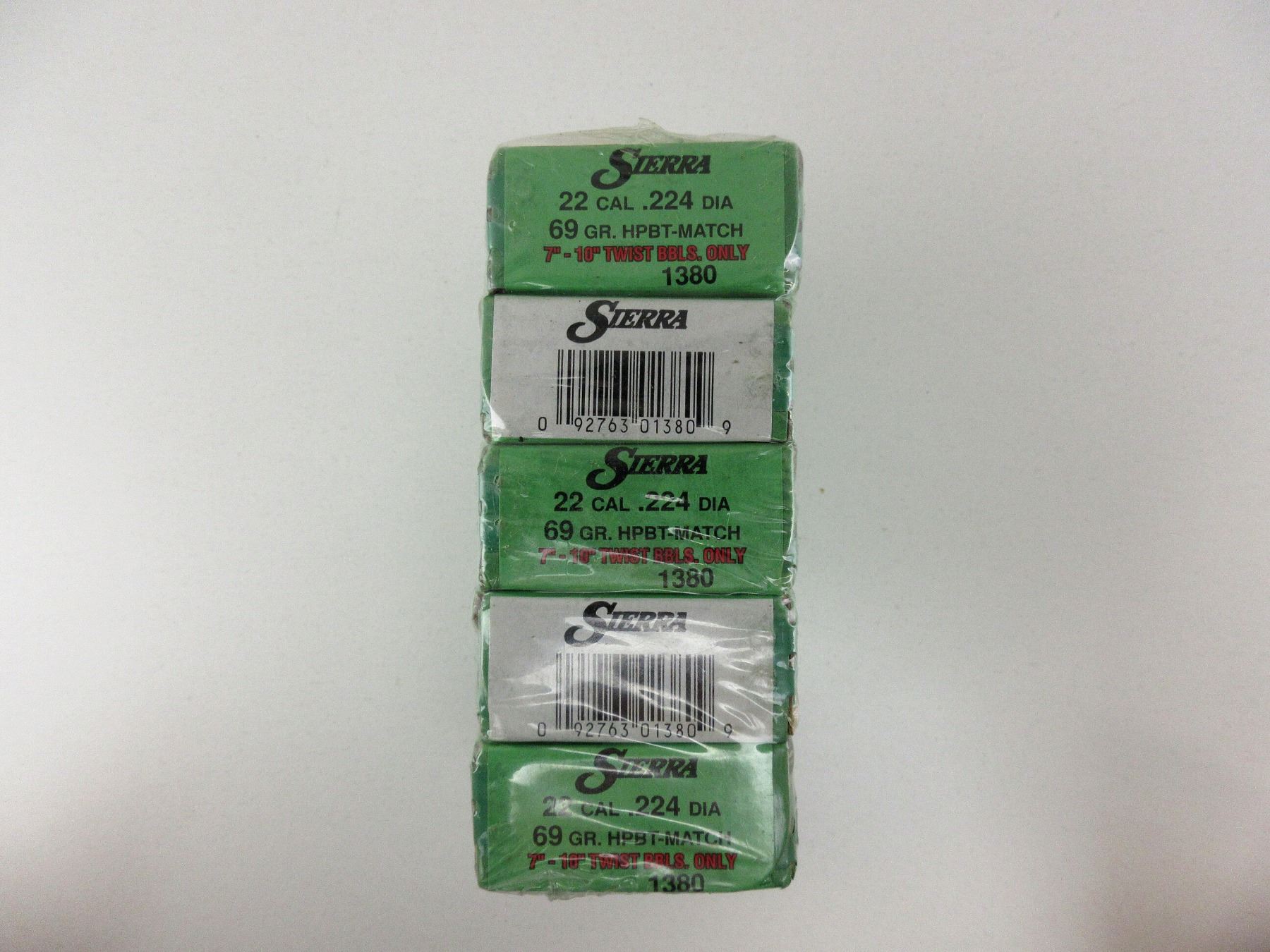 LOT INCLUDES; APPROX. (500) BULLETS, APPROX. DIA .224", 69 GRNS (STATED ON BOXES NOT CONFIRMED) HPBT-MATCH, UNOPENED.