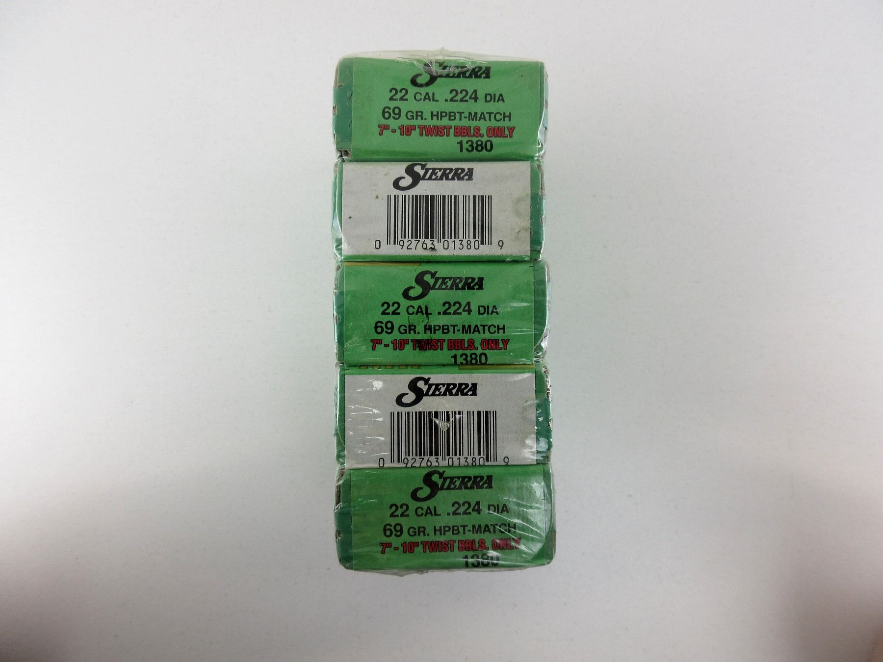 LOT INCLUDES; APPROX. (500) BULLETS, APPROX. DIA .224", 69 GRNS (STATED ON BOXES NOT CONFIRMED) HPBT-MATCH, UNOPENED.