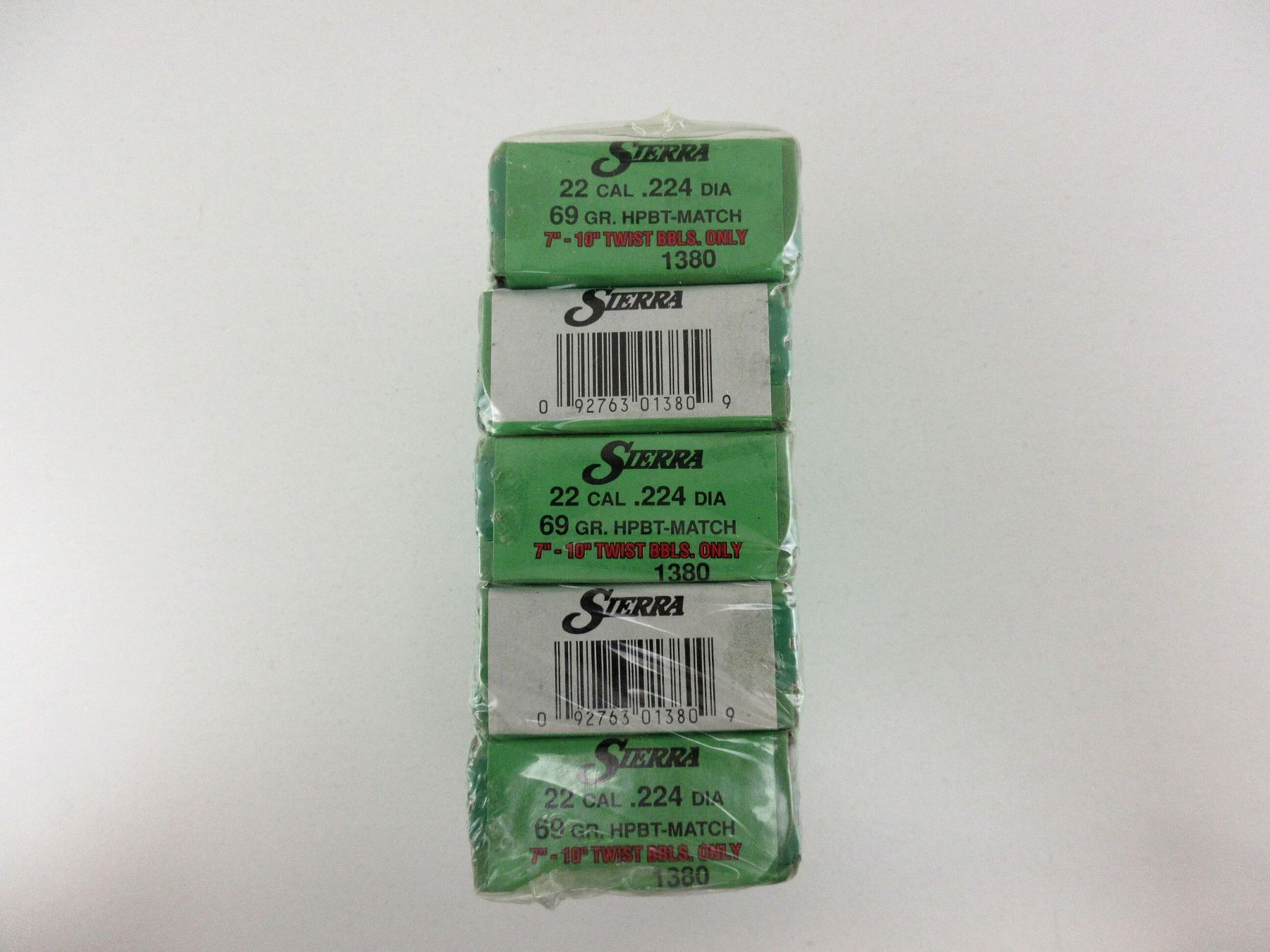 LOT INCLUDES; APPROX. (500) BULLETS, APPROX. DIA .224", 69 GRNS (STATED ON BOXES NOT CONFIRMED) HPBT-MATCH, UNOPENED.