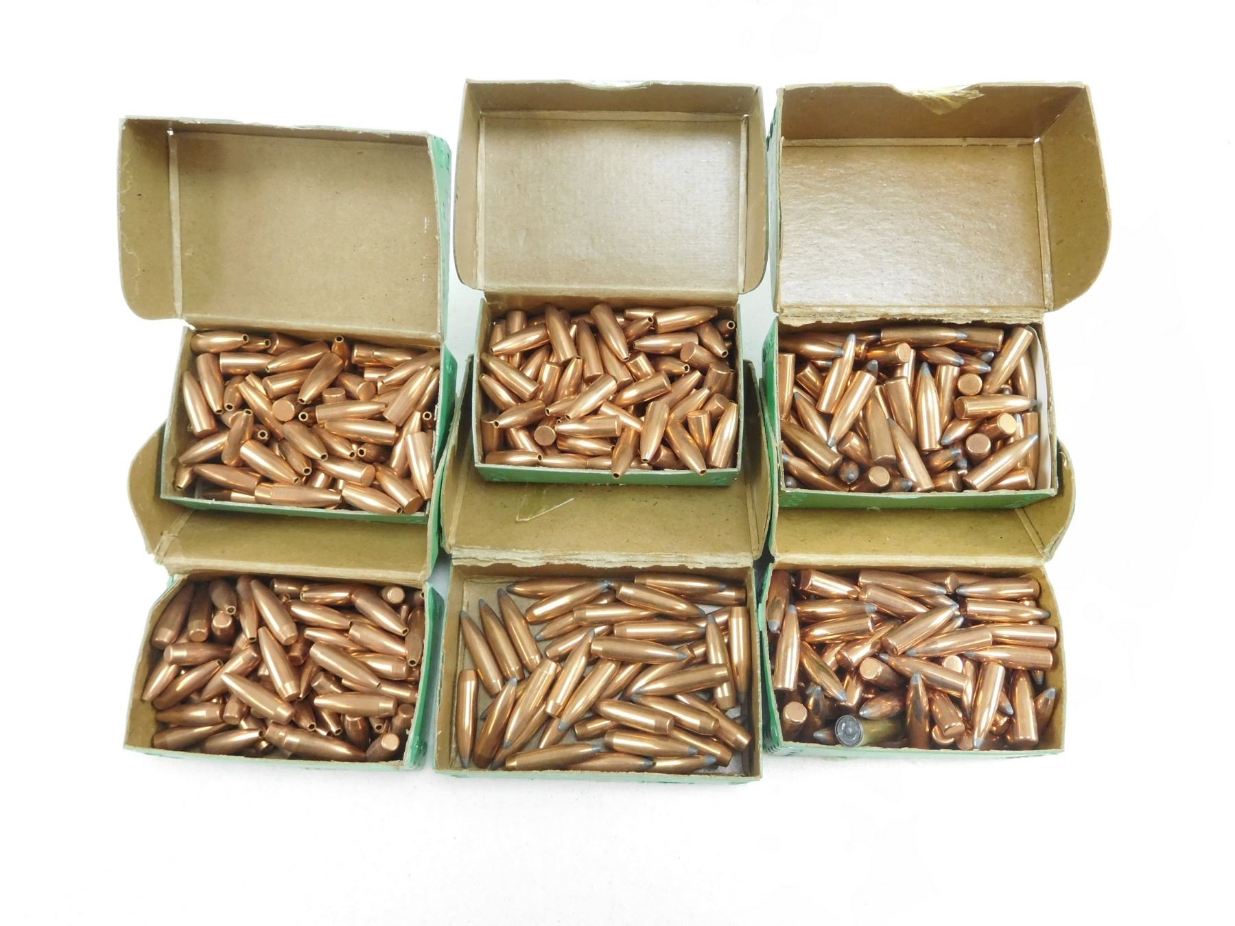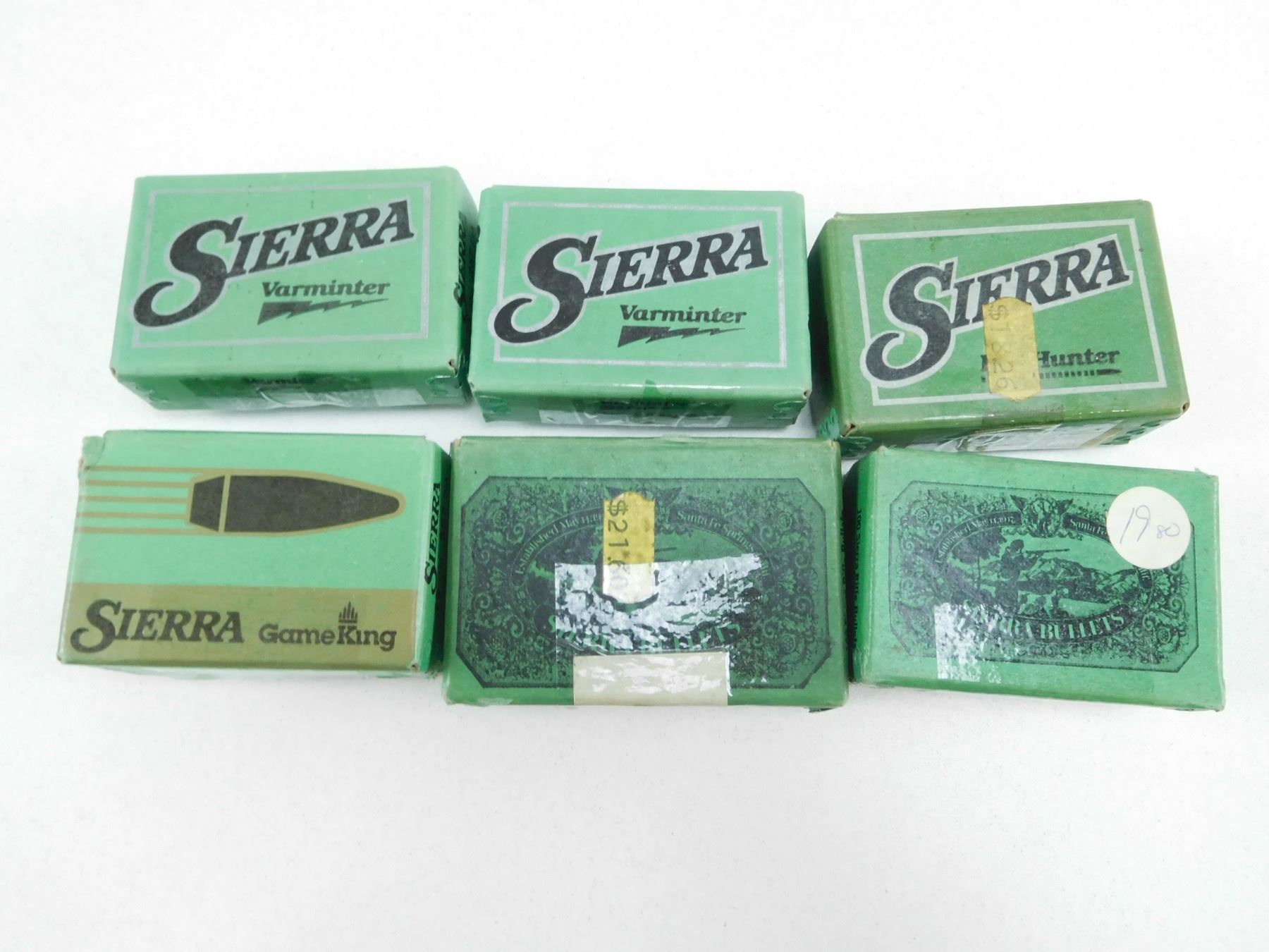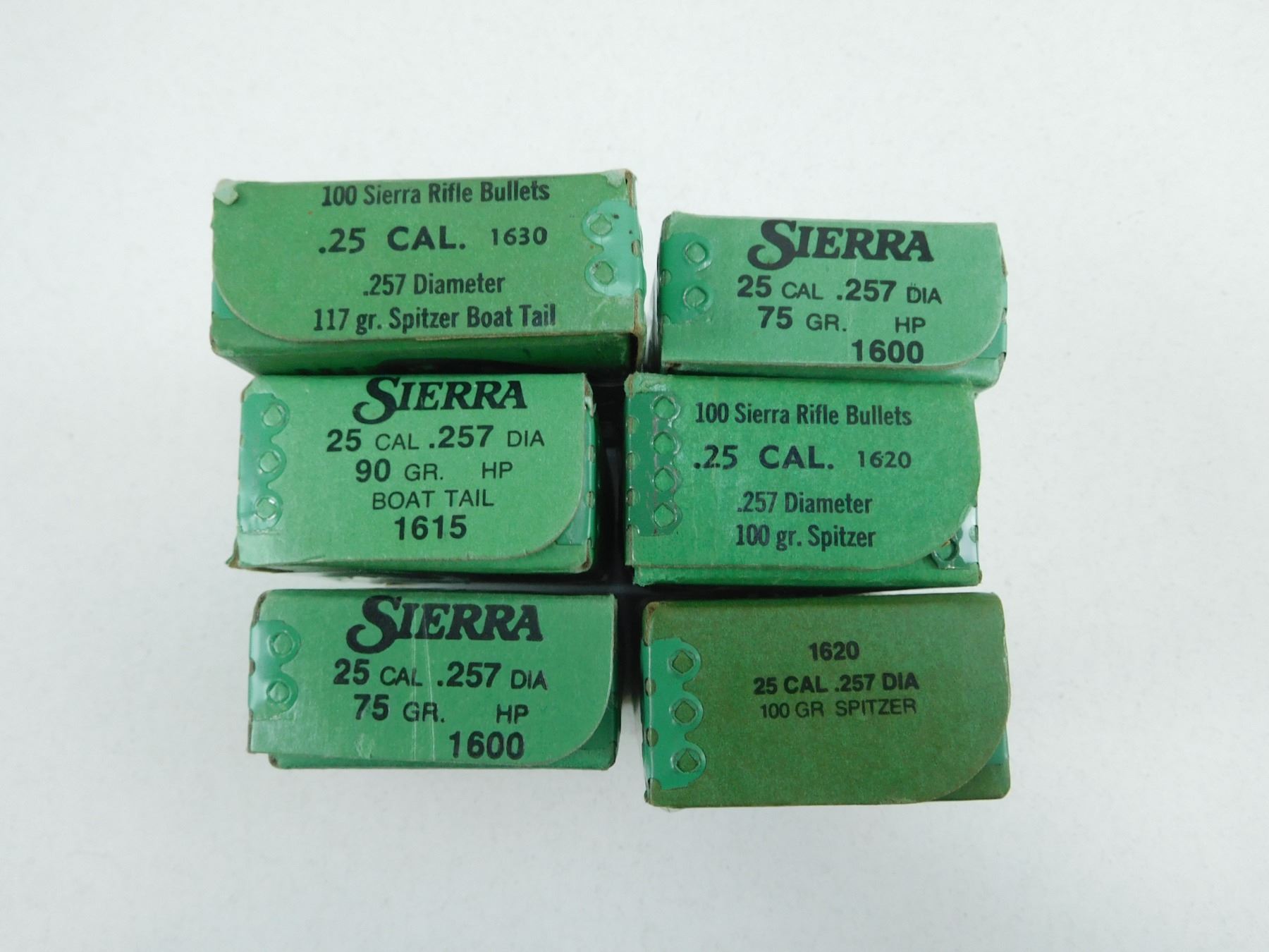 SIERRA 25 CAL BULLETS , APPROX 540 BULLETS INCLUDES 75 GRAIN H.P., 90 GRAIN H.P., 100 GRAIN SPITZER, & 117 GRAIN SPITZER BOAT TAIL