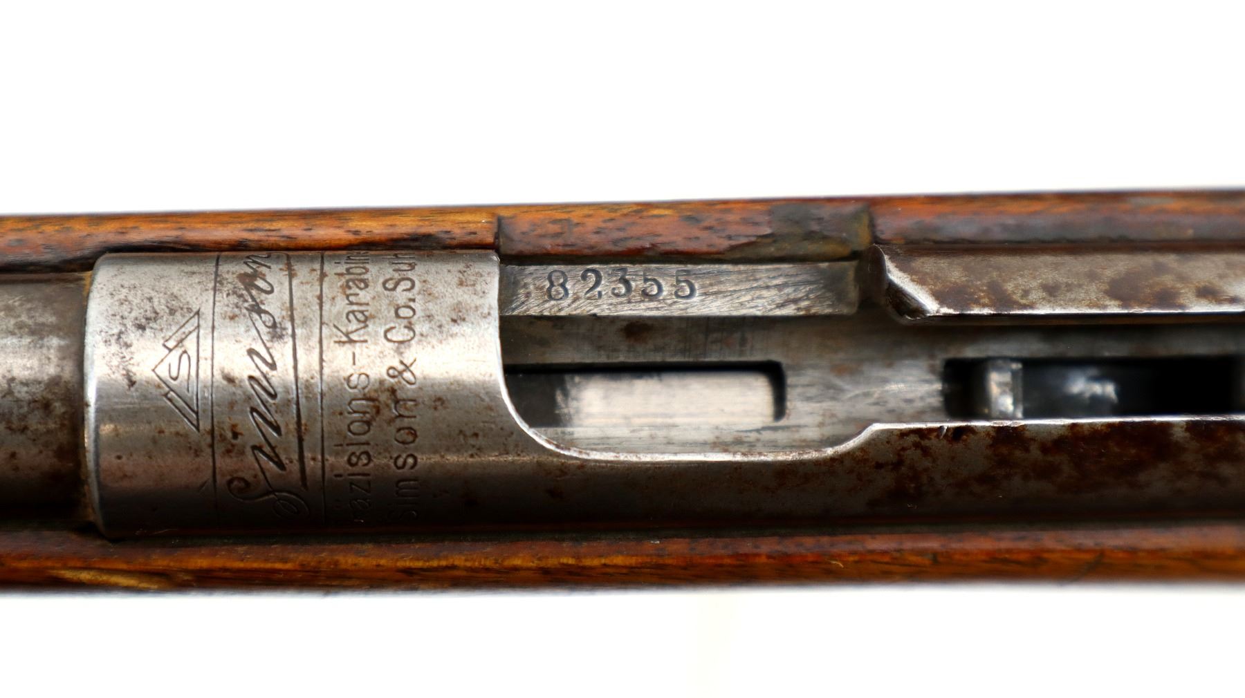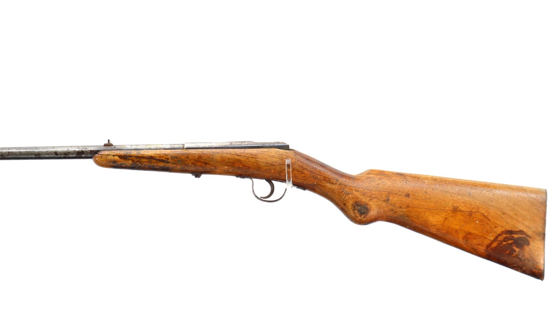 Main Description: Blade front sight, u notched rear sight, missing complete bolt and extractor assembly. One piece wood stock, chipped and cracked through forearm, pistol grip, chipped and cracked behind receiver, smooth steel butt plate.
