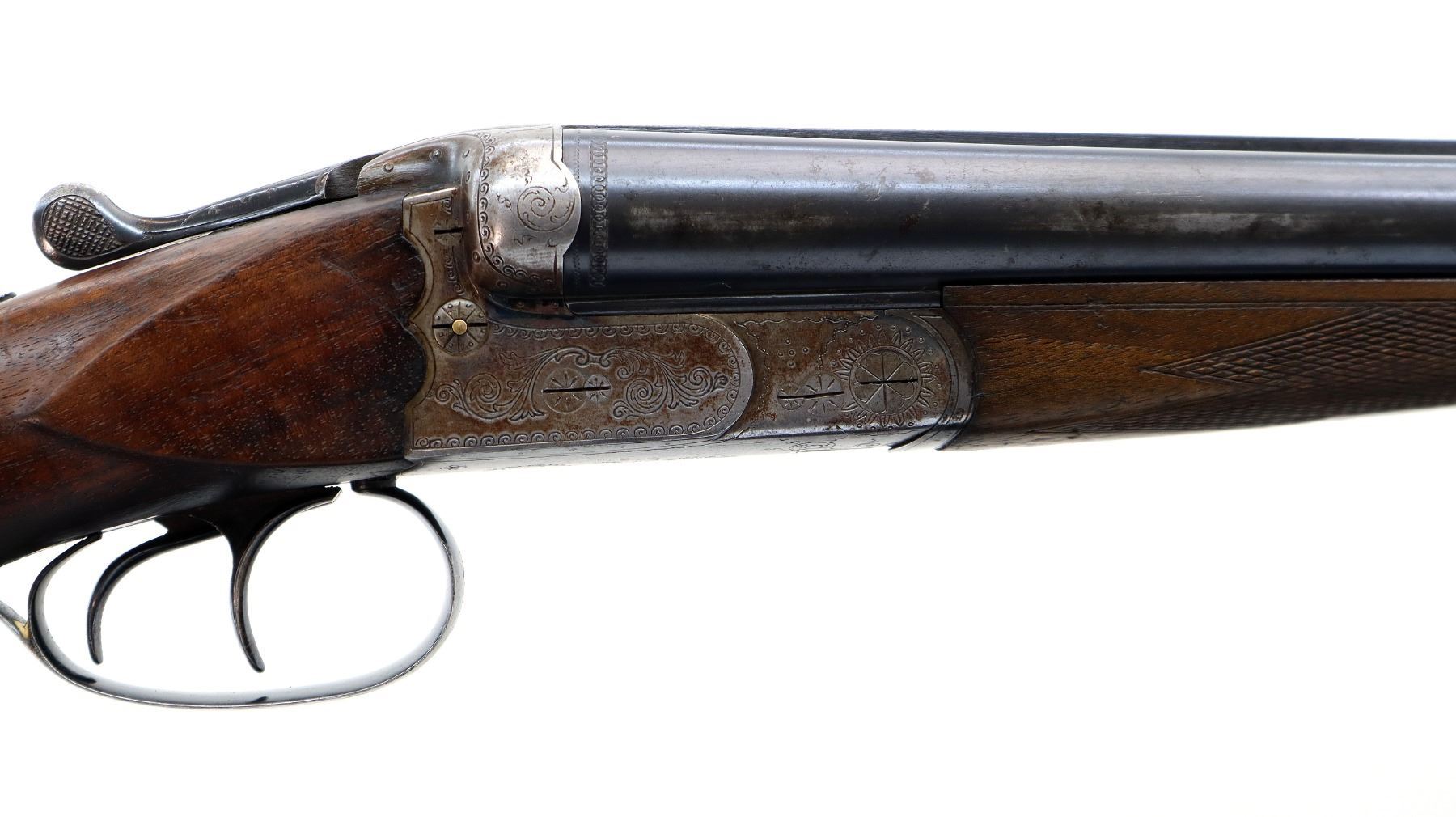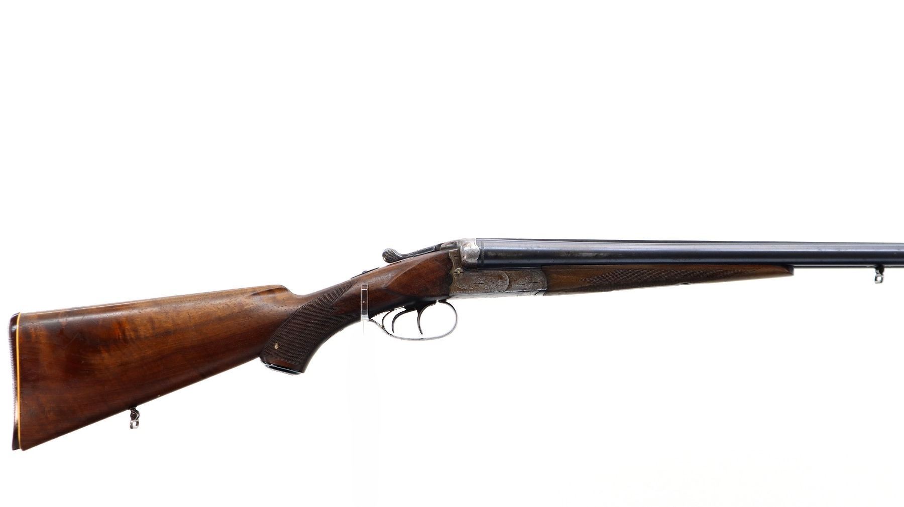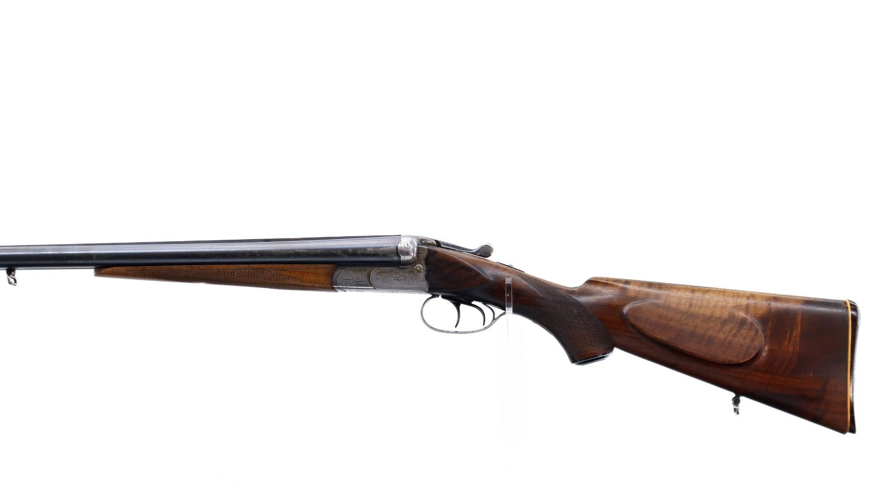 Main Description: Brass bead, blued barrels with raised rib drilled and tapped with no plug screws installed, engraved silver receiver, automatic safety, extractor, cocking indicators, double triggers. Two piece wood stocks, checkered forearm and pistol grip, small chips and cracks behind receiver, European cheek rest, grooved red polymer butt plate, stock chipped at heel, grip cap, sling swivels.