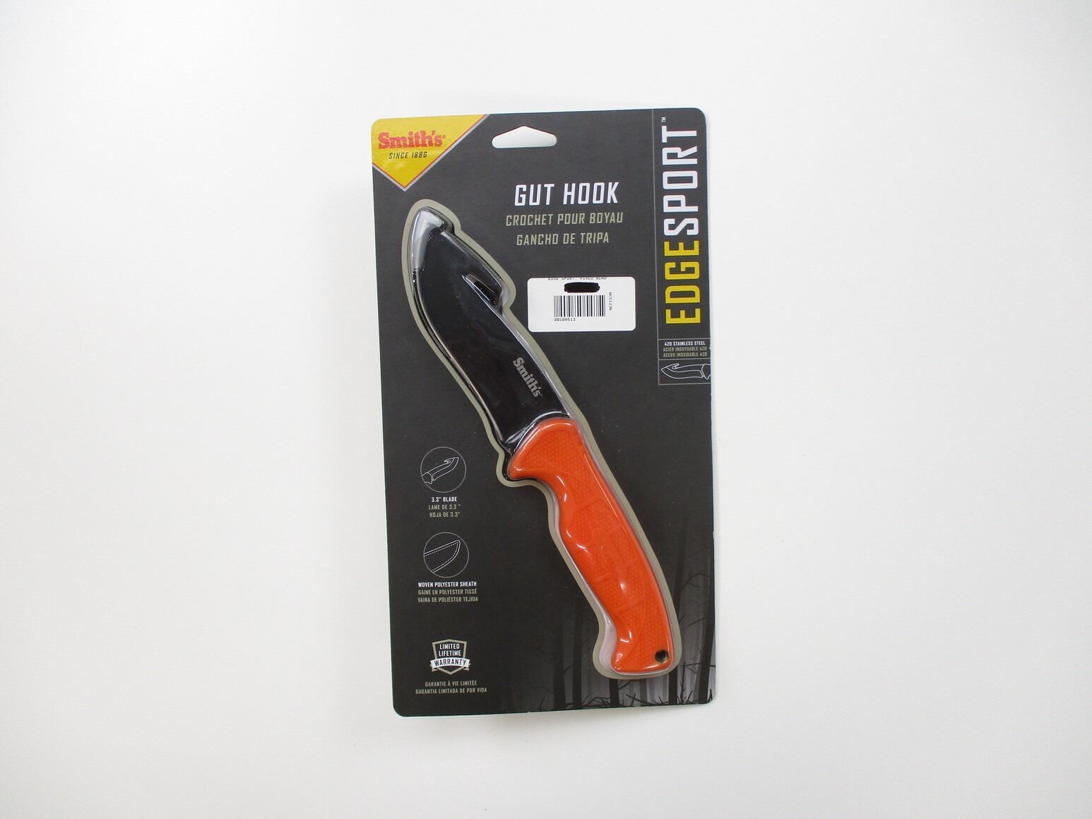 SMITH'S EDGE SPORT GUT HOOK KNIFE . NOS, IN ORIGINAL PACKAGE, APPROX. 3.3" BLADE, STAINLESS STEEL, TPE TEXTURED HANDLE, INCLUDES WOVEN POLYESTER SHEATH.