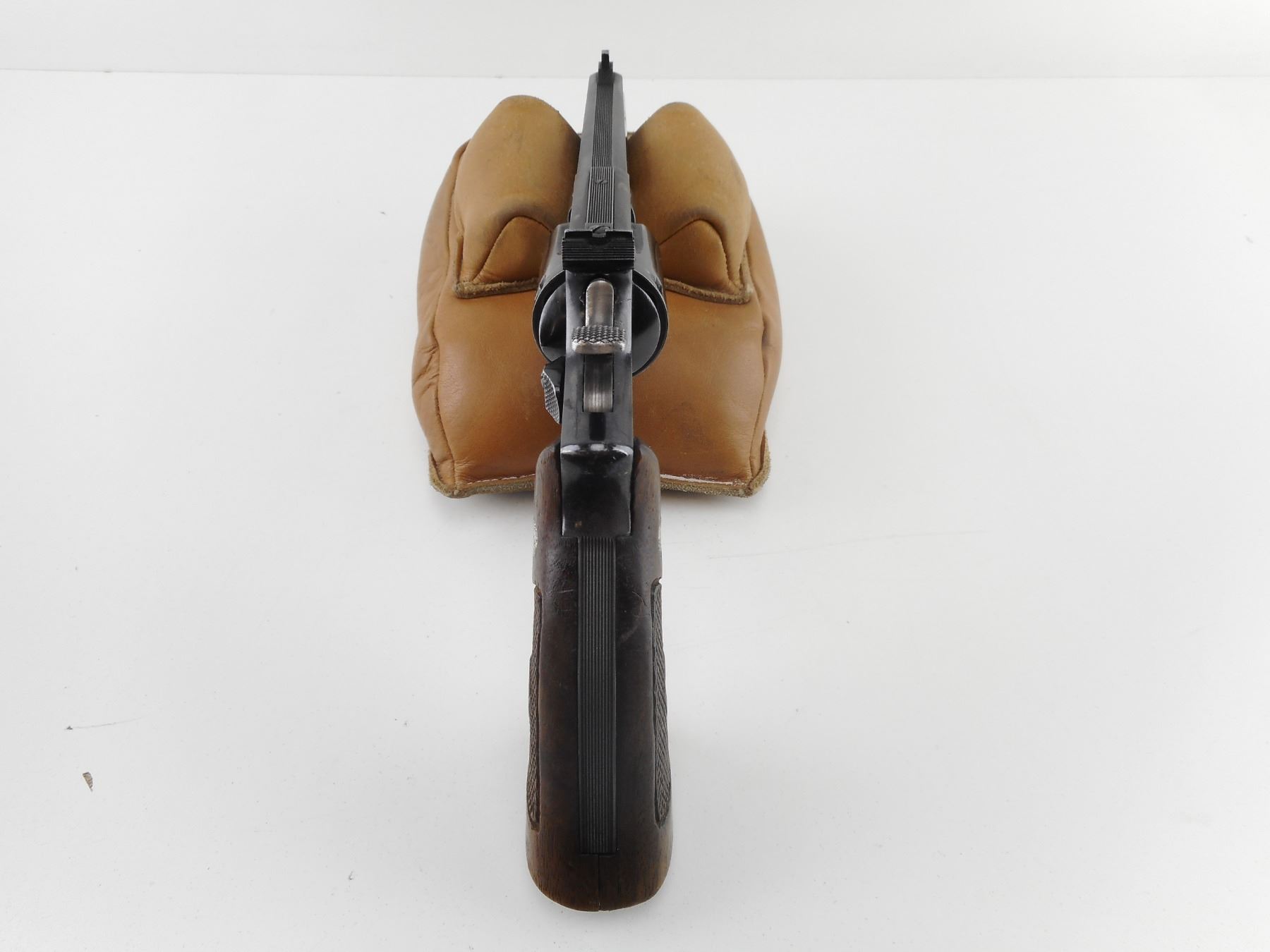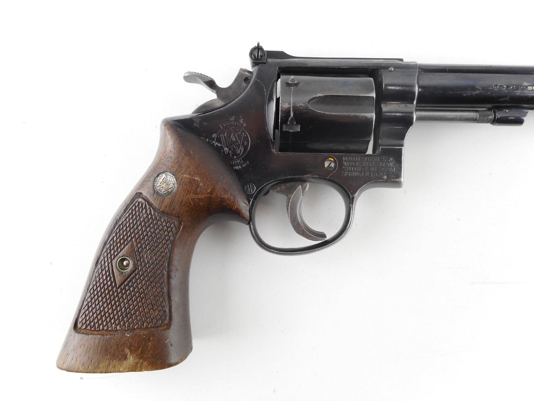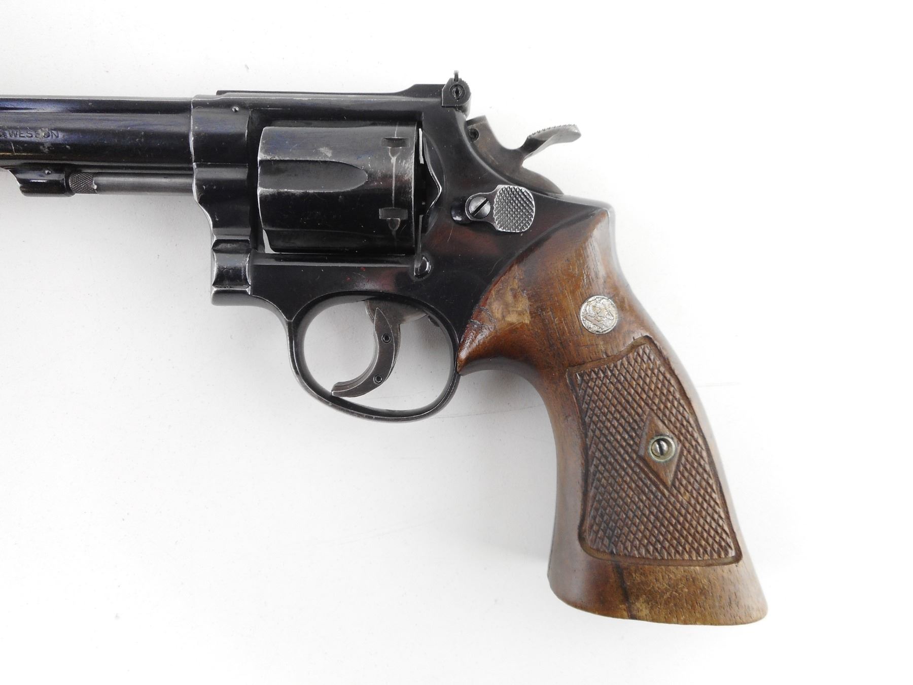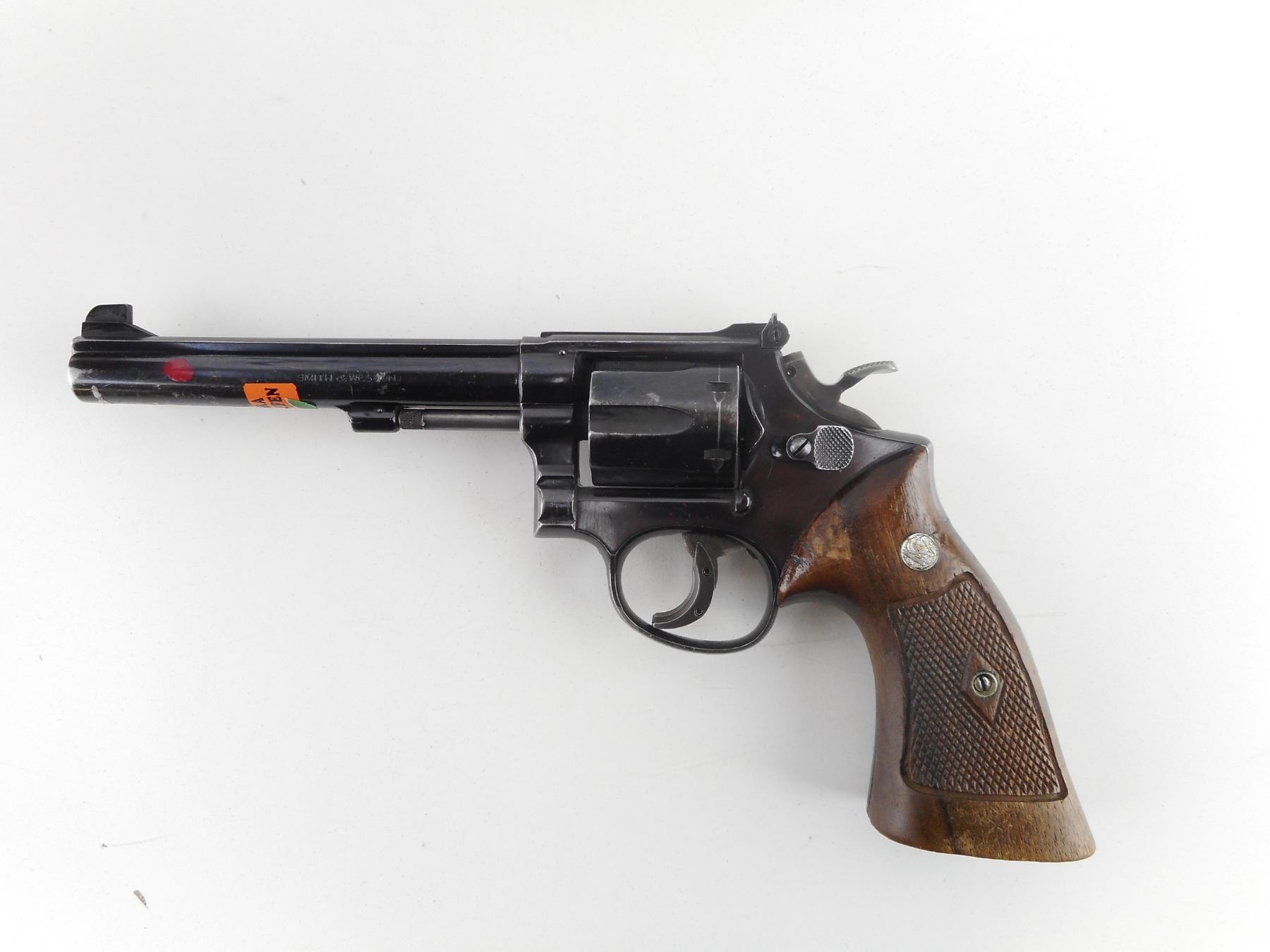 SMITH & WESSON , MODEL: 14 , CALIBER: 38 SPL , 6 SHOT CAPACITY. BORE IS EXCELLENT. HOLDS COCK, INDEXES WELL, ACTION IS TIGHT. BLADE FRONT AND ADJUSTABLE REAR SIGHT. CHECKERED TWO PIECE WOOD GRIPS WITH S& W LOGO. SHOW SOME HANDLING MARKS. ACTION: REVOLVER , BARREL LENGTH: 152MM, CONDITION: 7/10, STOCK # R5221, SERIAL # K369907, CLASS: CANADIAN CLASS RESTRICTED
