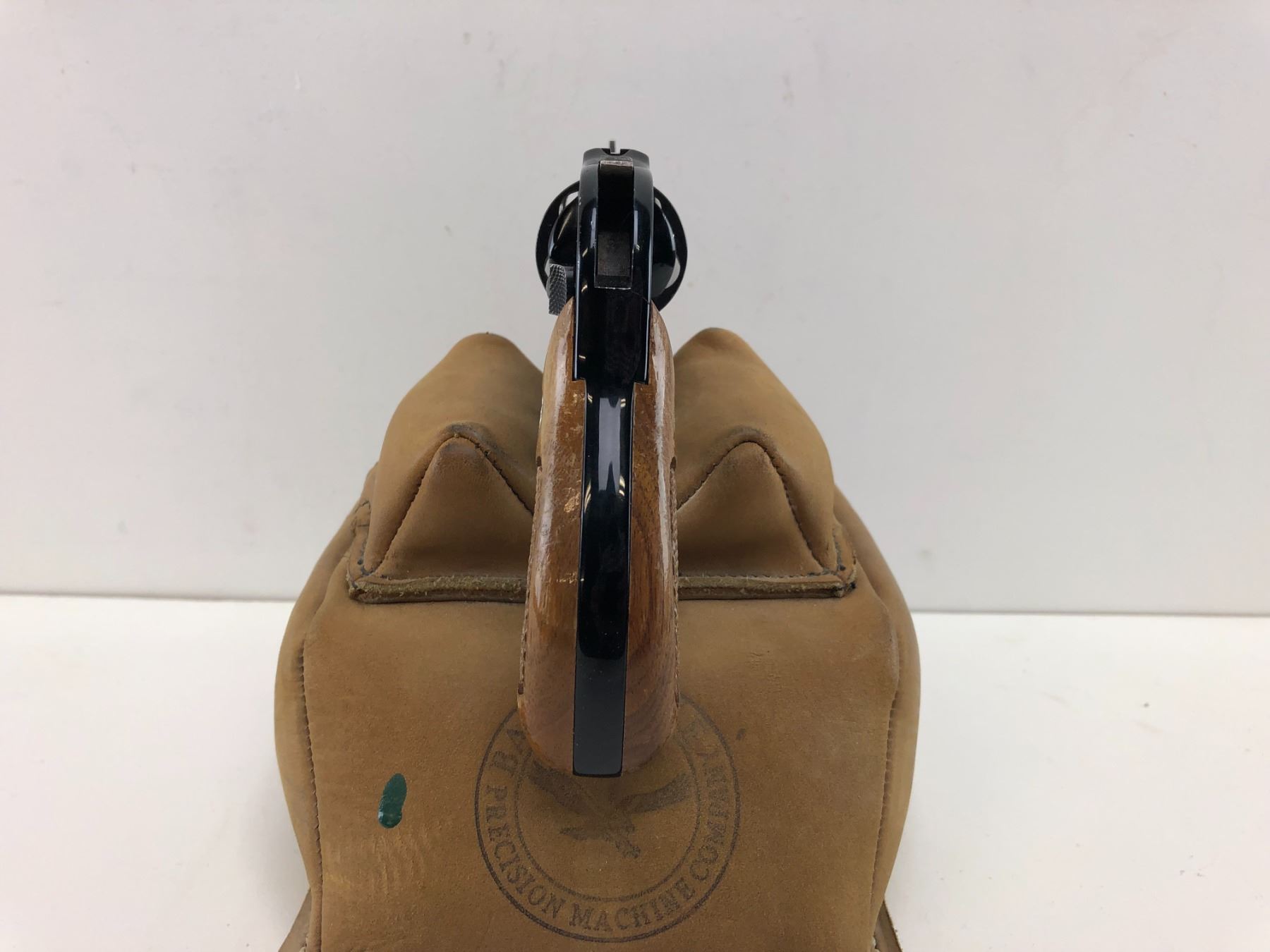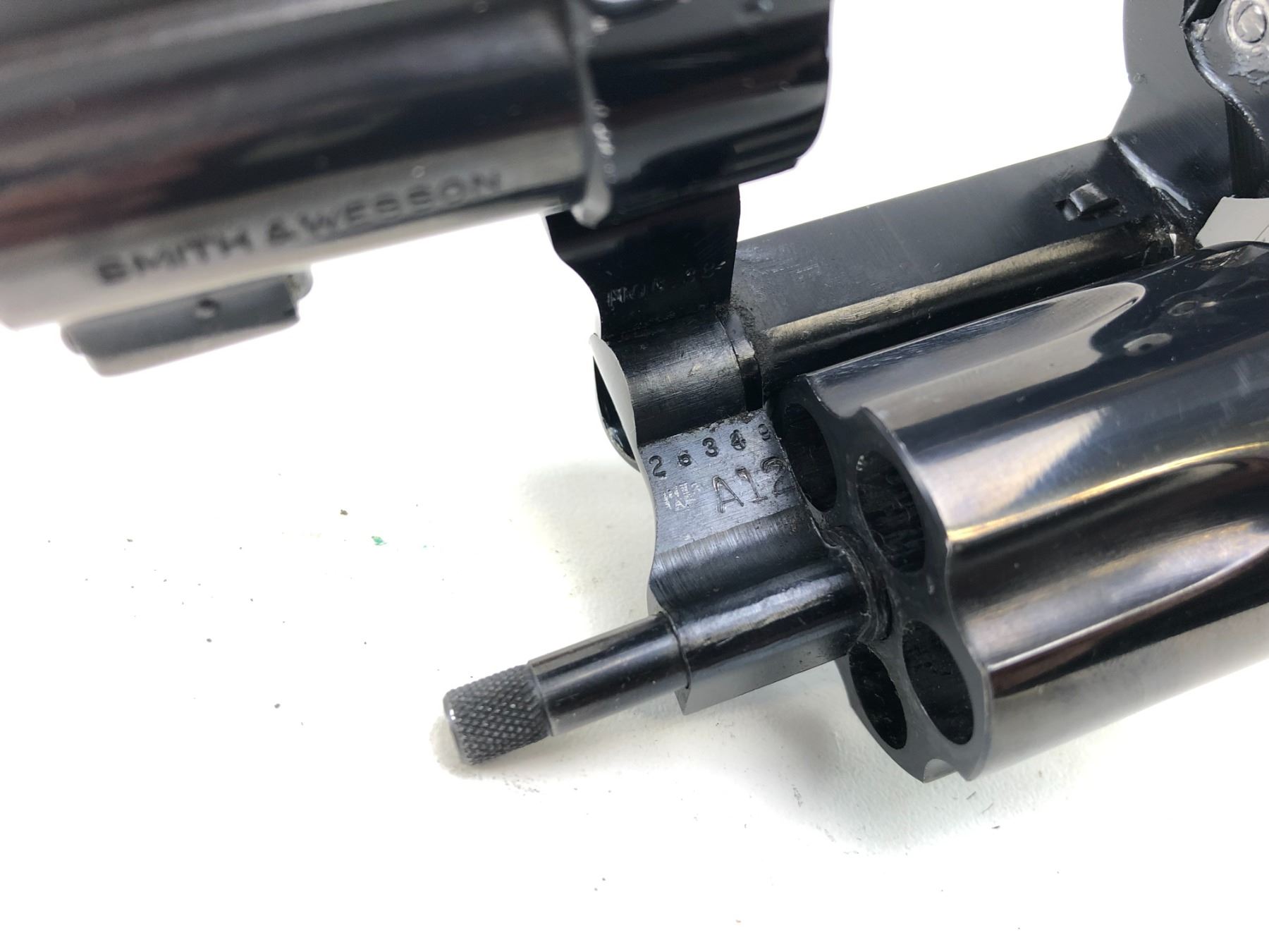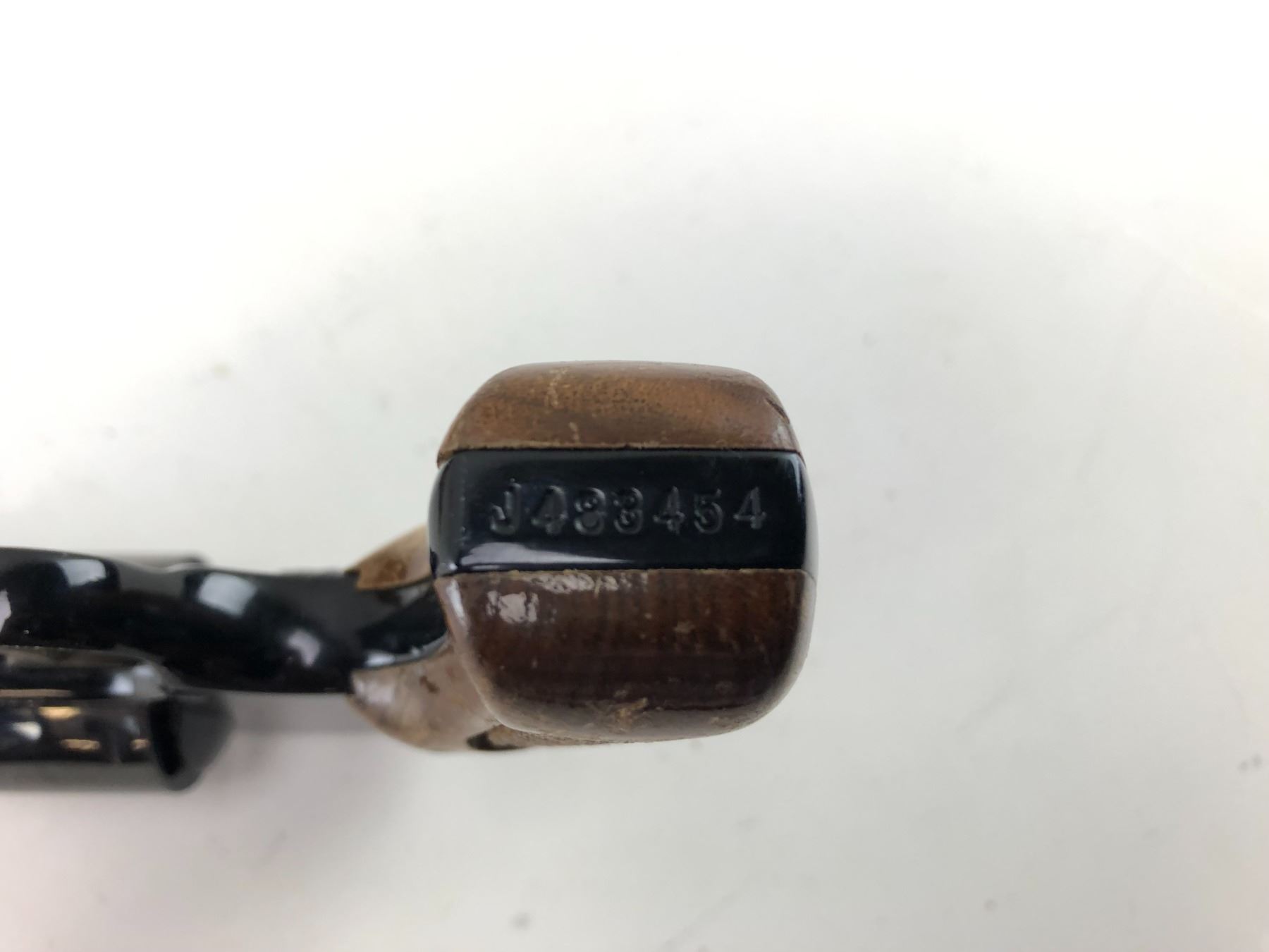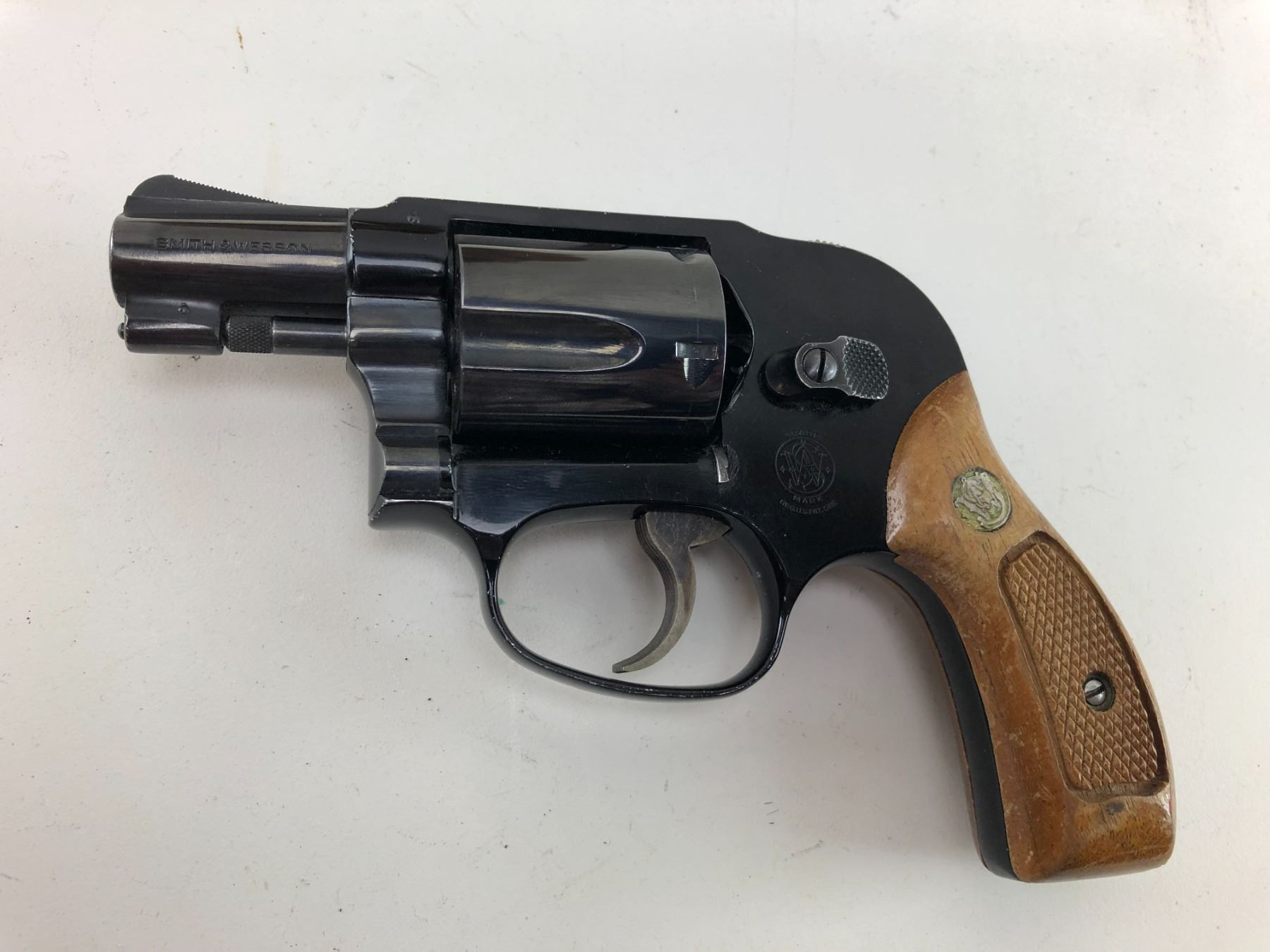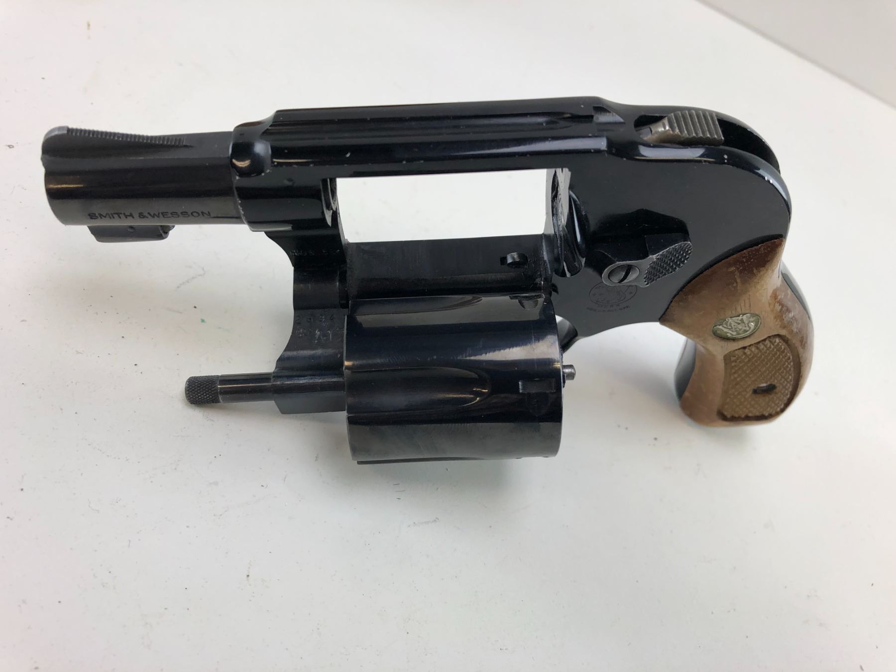 CONDITION: 7/10 , SMITH & WESSON , MODEL: MODEL 38 AIRWEIGHT , CALIBER: 38 SPL , BORE IS VERY GOOD. HOLDS COCK, INDEXES WELL, ACTION IS TIGHT. BLADE FRONT SIGHT, U NOTCH REAR SIGHT, BLUED BARREL AND CYLINDER, GLASS BLACK ALLOY FRAME, SHROUDED HAMMER. TWO PIECE CHECKERED BROWN WOOD GRIPS, WITH SMITH AND WESSON MEDALLIONS. METAL FINISH SHOWS SOME HANDLING MARKS, SCRATCHES AND WEAR. GRIPS SHOW SOME HANDLING MARKS AND FINISH WEAR , ACTION: REVOLVER , BARREL LENGTH: 51MM , SERIAL # J483454 , CLASS: CANADIAN CLASS PROHIBITED 12-6